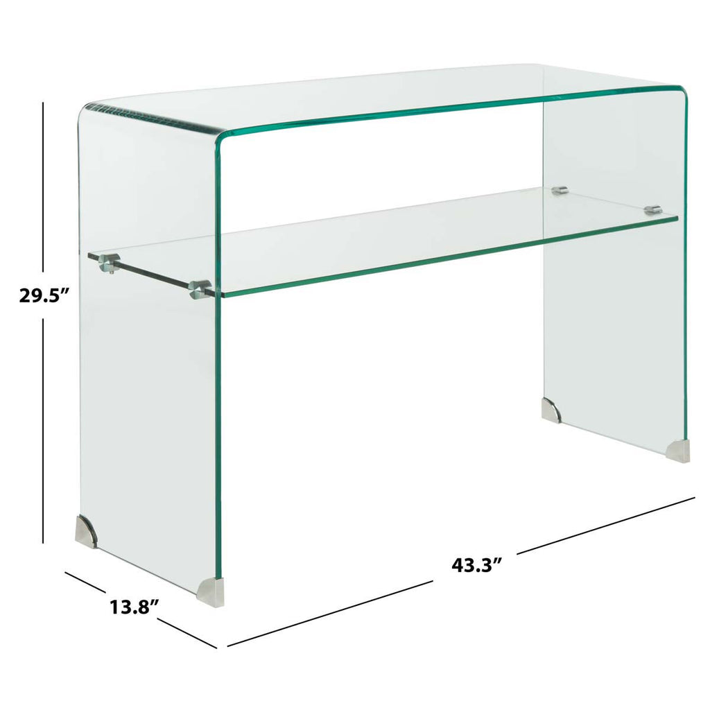 Whether placed below a flat screen TV or adorned with accessories in an entry hall, the sculptural form of the Hollis Console Table appears to float in a room. Crafted of clear tempered glass, this minimalist design has a shelf for remotes or magazines.