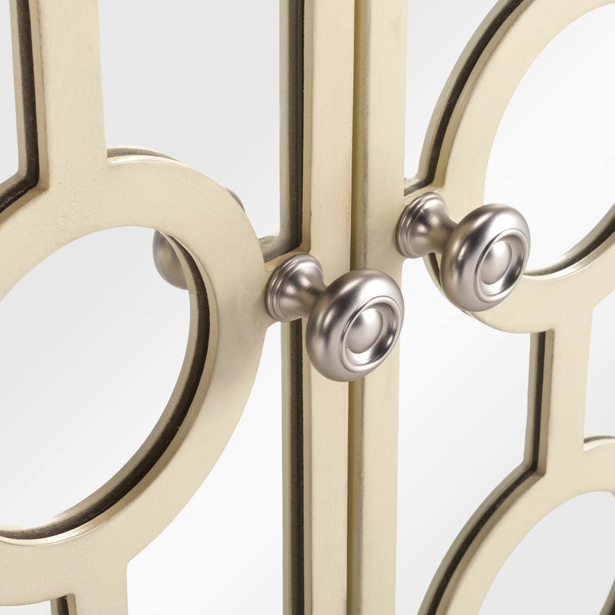 Transform your?d?cor into an icon of Old Hollywood glamour with this Kaia Chest. Kaia's shining mirrored doors flaunt an Art Deco geometric lattice that is undeniably eye catching, perfectly balanced by an antique beige finish.