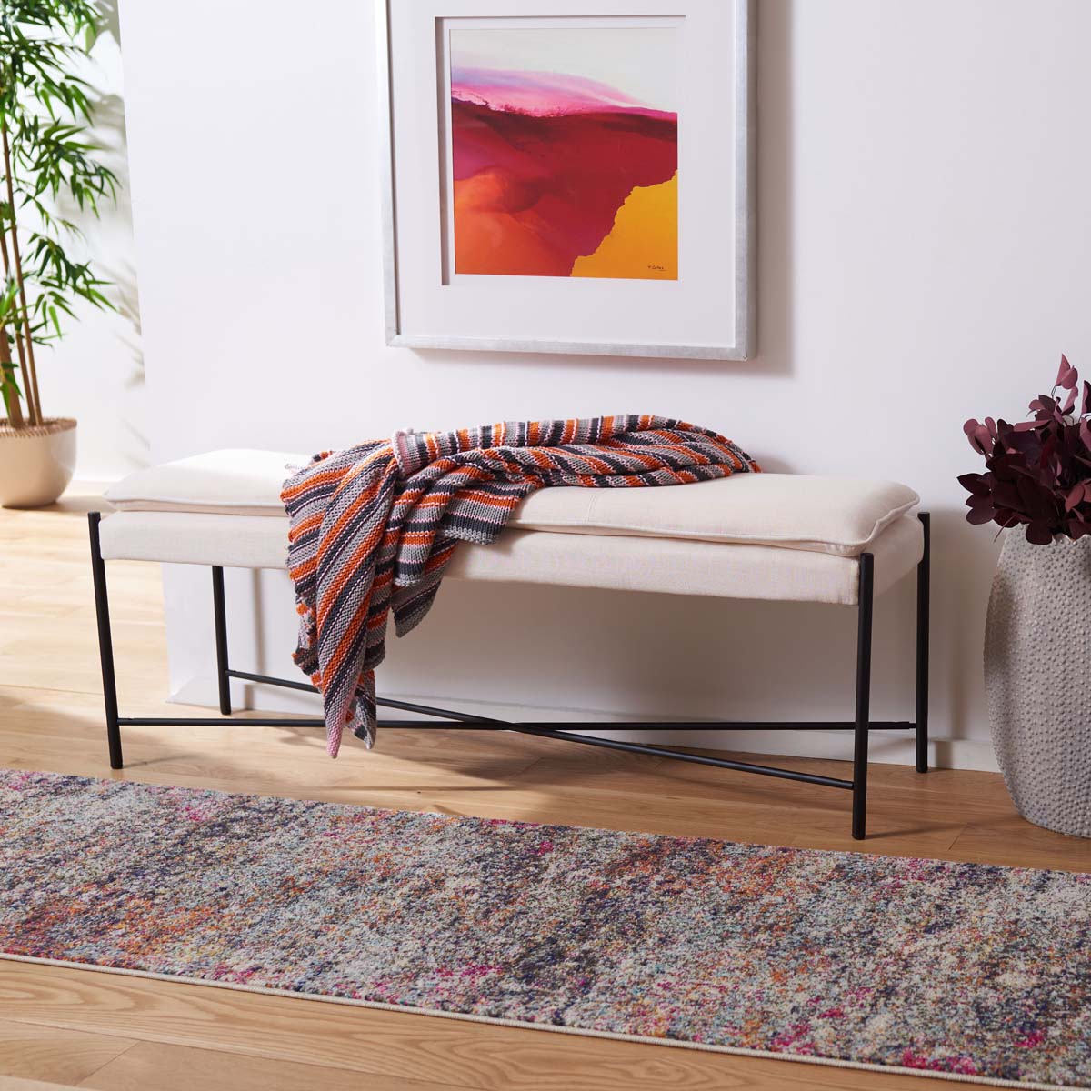 Sleek and streamlined, the Kara Cushioned X Bench is the epitome of upscale minimalism. Kara seamlessly integrates with any furnishings, featuring a neutral light beige cushion for smart decorating. A bottom X frame adds a stylish sense of depth, beautifully elevating any living room or entryway.