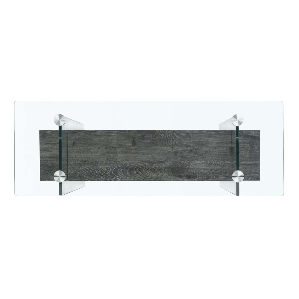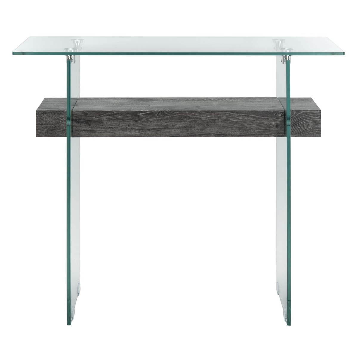 The epitome of elegance, this modern glass console table was inspired by treasures in London?? design museum. Ideal for the living room, hall, or foyer, its chic geometric lines were designed with a black oak finish and transparent glass.