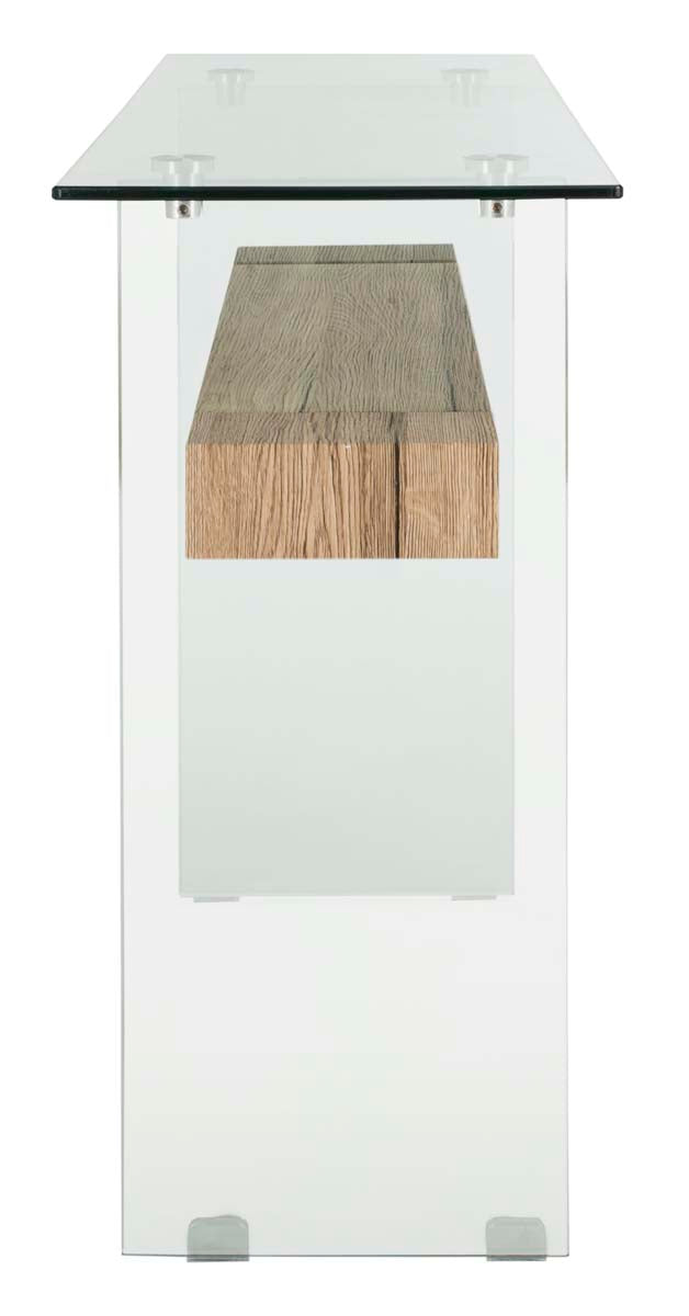 The epitome of elegance, this rectangular modern glass console table was inspired by treasures in London?? design museum. Ideal for the living room, hall, or foyer, its chic geometric lines were designed with a natural wood finish and transparent glass.