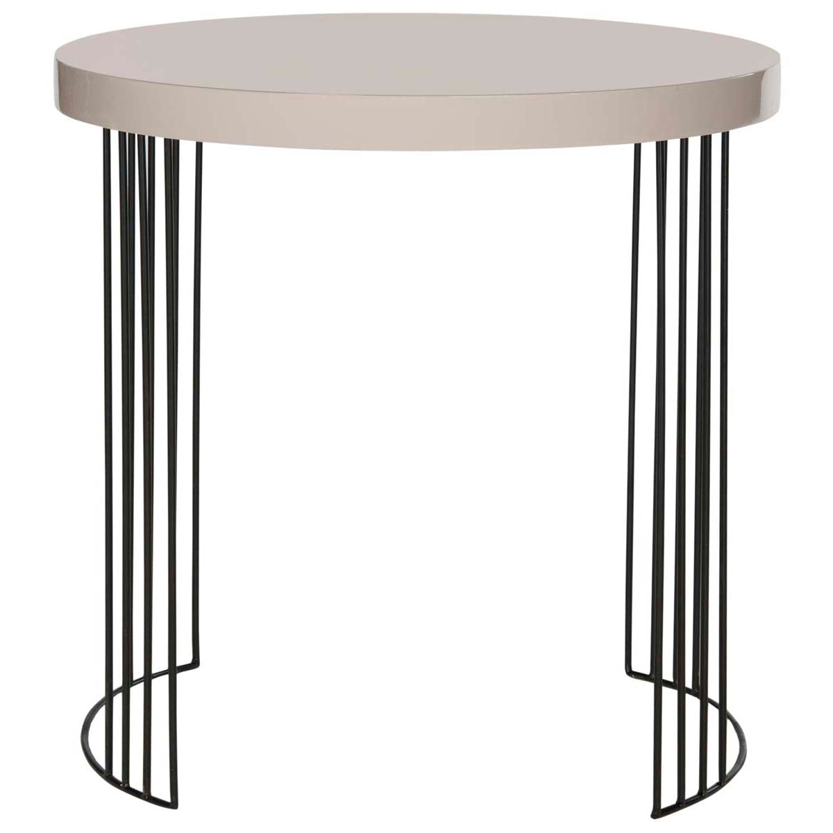 A nod to plane geometry, the round Kelly Side Table creates a crisp contemporary statement beside a sofa or chair. This chic table is crafted with two half circle rows of black iron hairpin legs and a taupe lacquer top for luxurious shine.