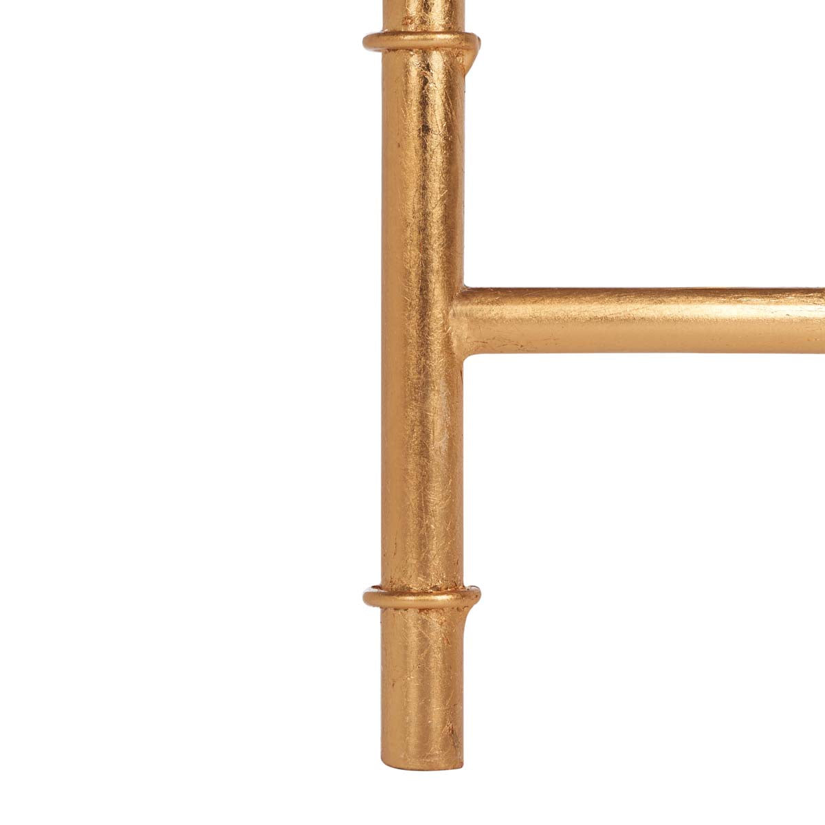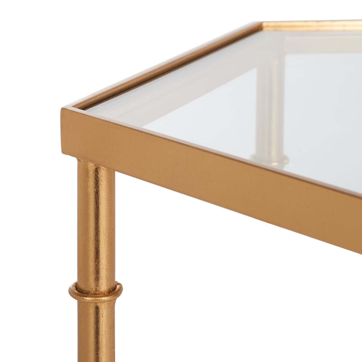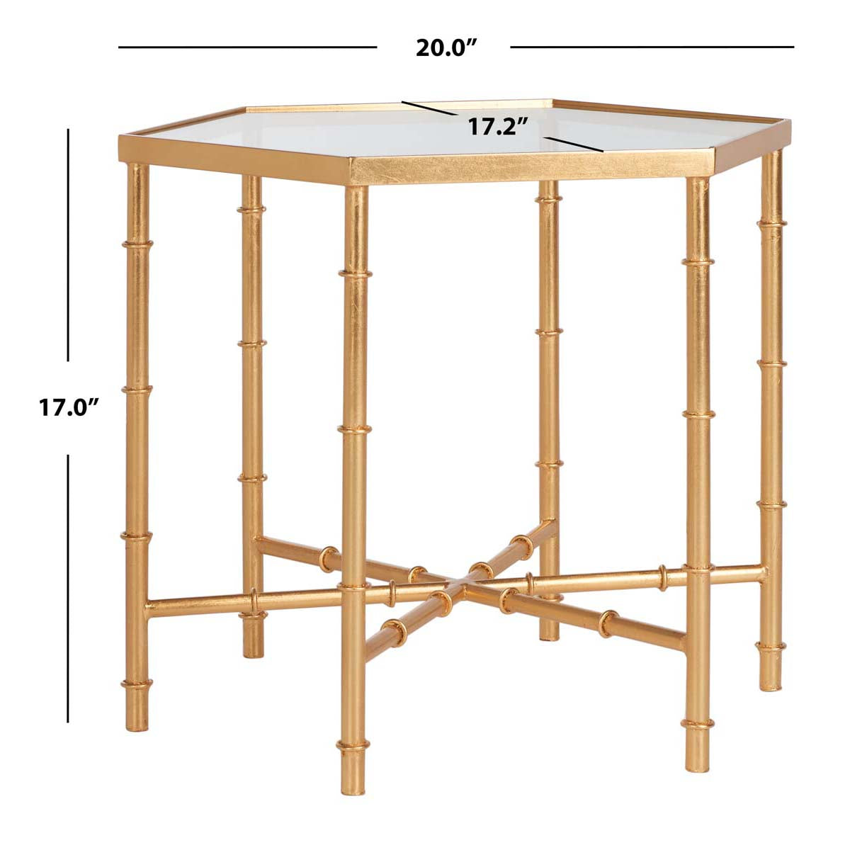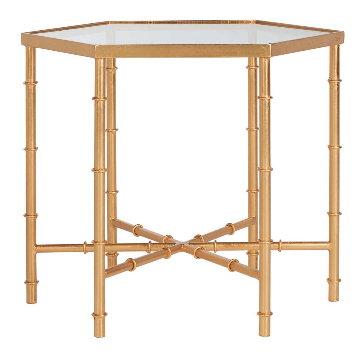 The updated Asian elegance of the Kerri Accent Table?? faux bamboo blends classic Chinoiserie style and exotic detail. With gold leaf finish on its forged iron base and a clear glass top, Kerri brings sophisticated, eclectic flair to any d?cor.