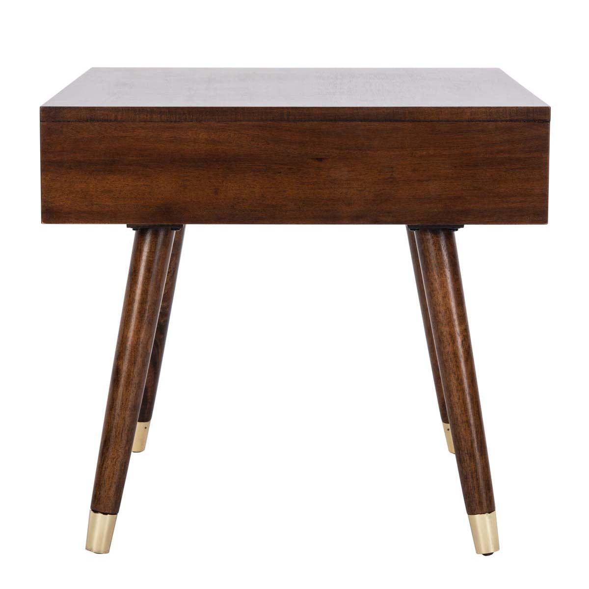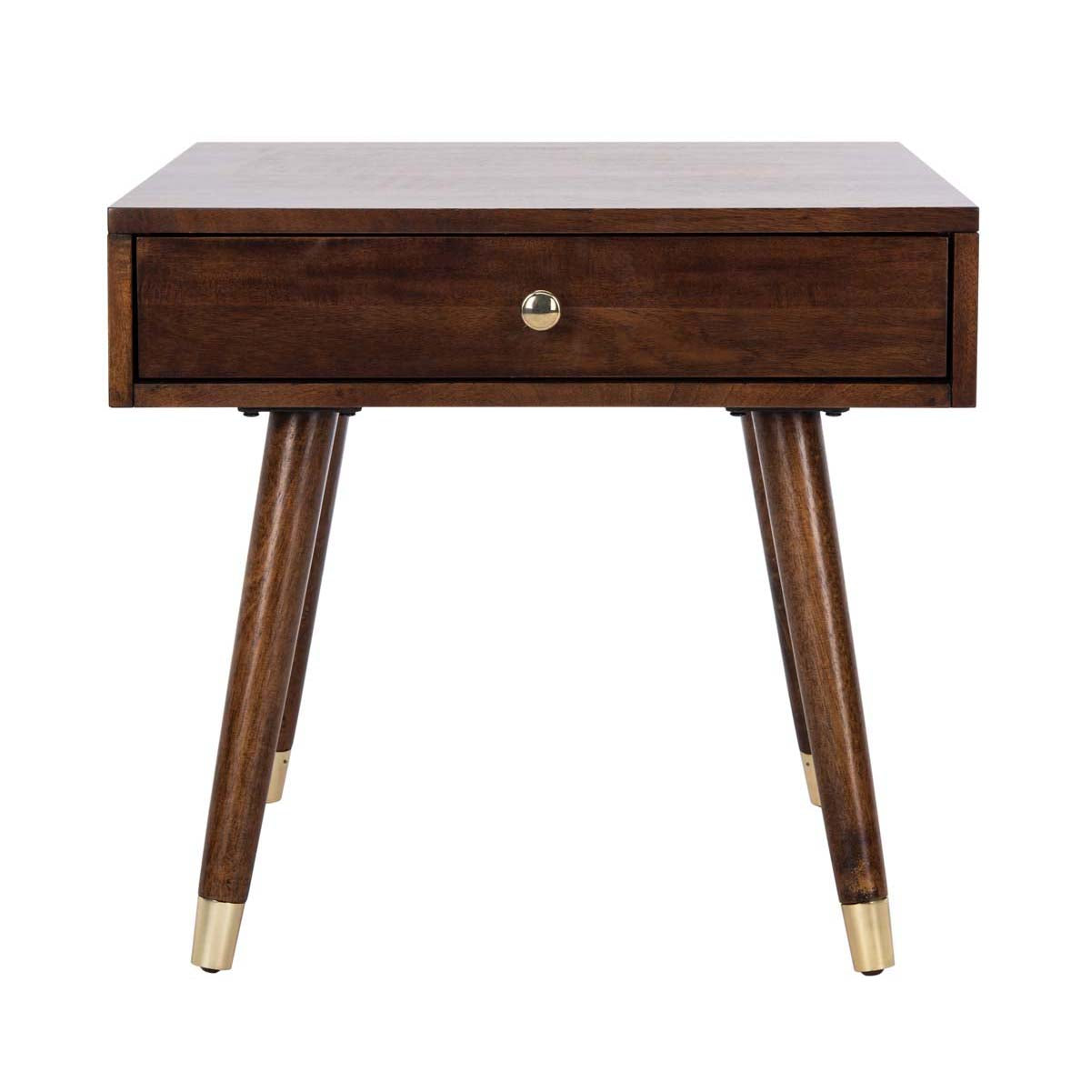 Inspired by vintage treasures, this modern gold cap end table brings sophistication to any living room. Its gold finished brass hardware adds a luxurious touch to its rich brown wood construction. Use alongside the sofa for an instant style upgrade.