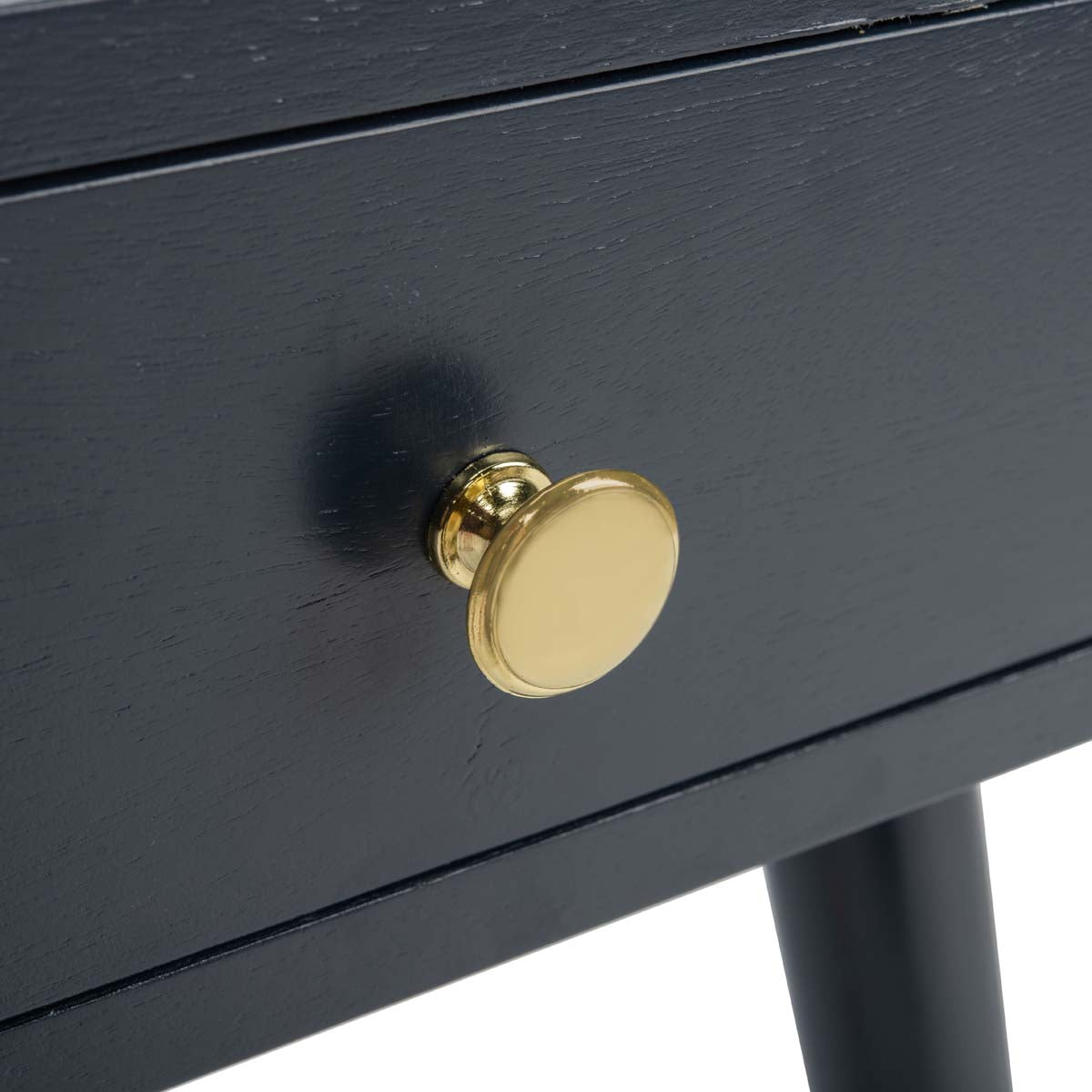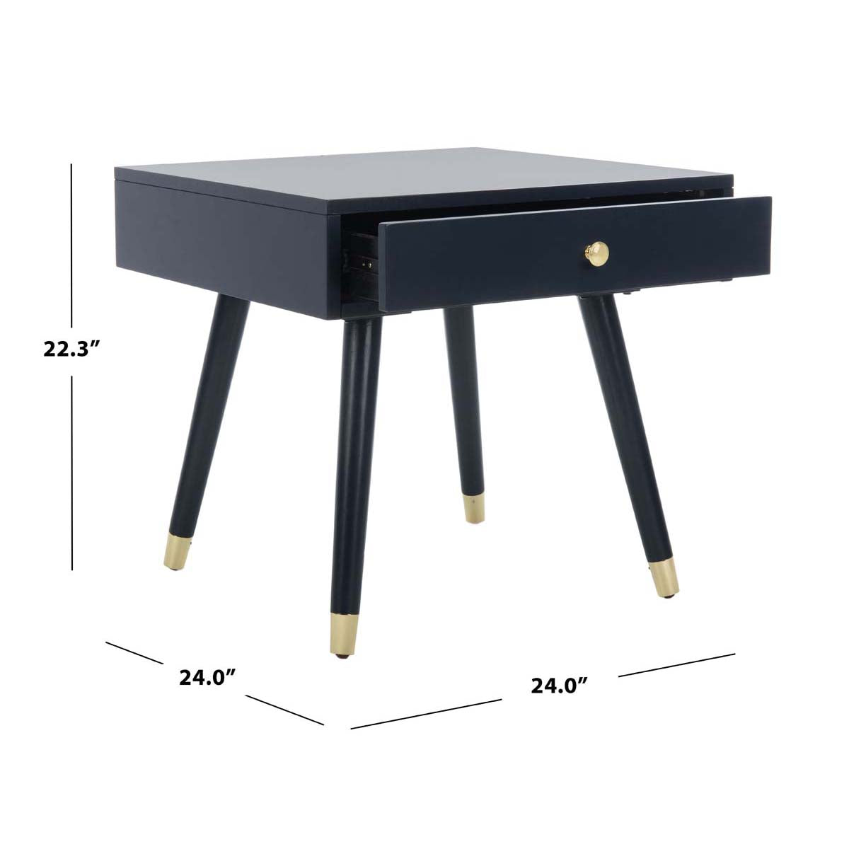 Inspired by vintage treasures, this modern gold cap end table brings sophistication to any living room. Its gold finished brass hardware adds a luxurious touch to its rich navy wood construction. Use alongside the sofa for an instant style upgrade.