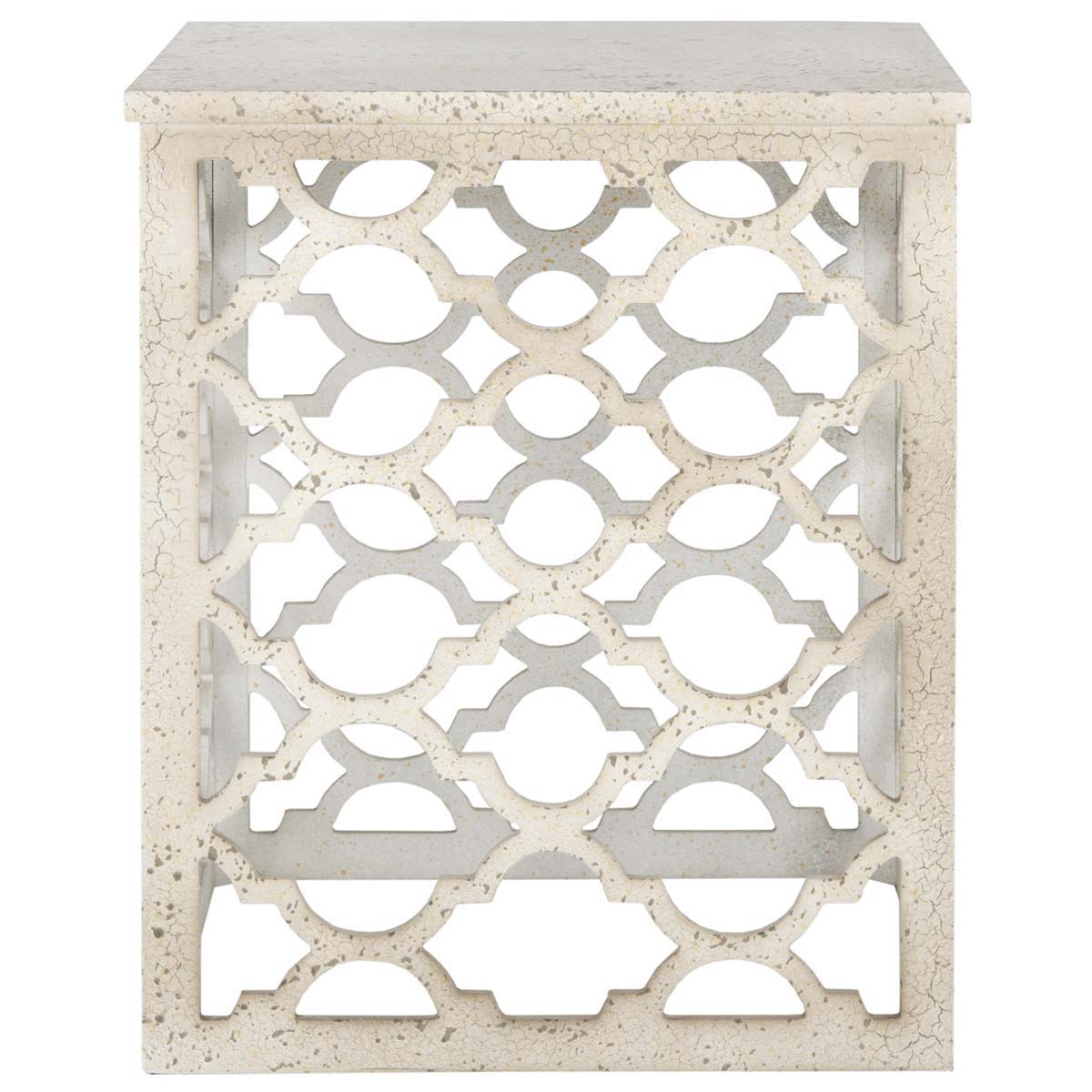 Inspired by intricate Moroccan architecture, the open, distressed white lattice of the Lonny End Table brings an airy feel to any living space. Lonny's strong rectangular shape contrasts the curved quatrefoil pattern.