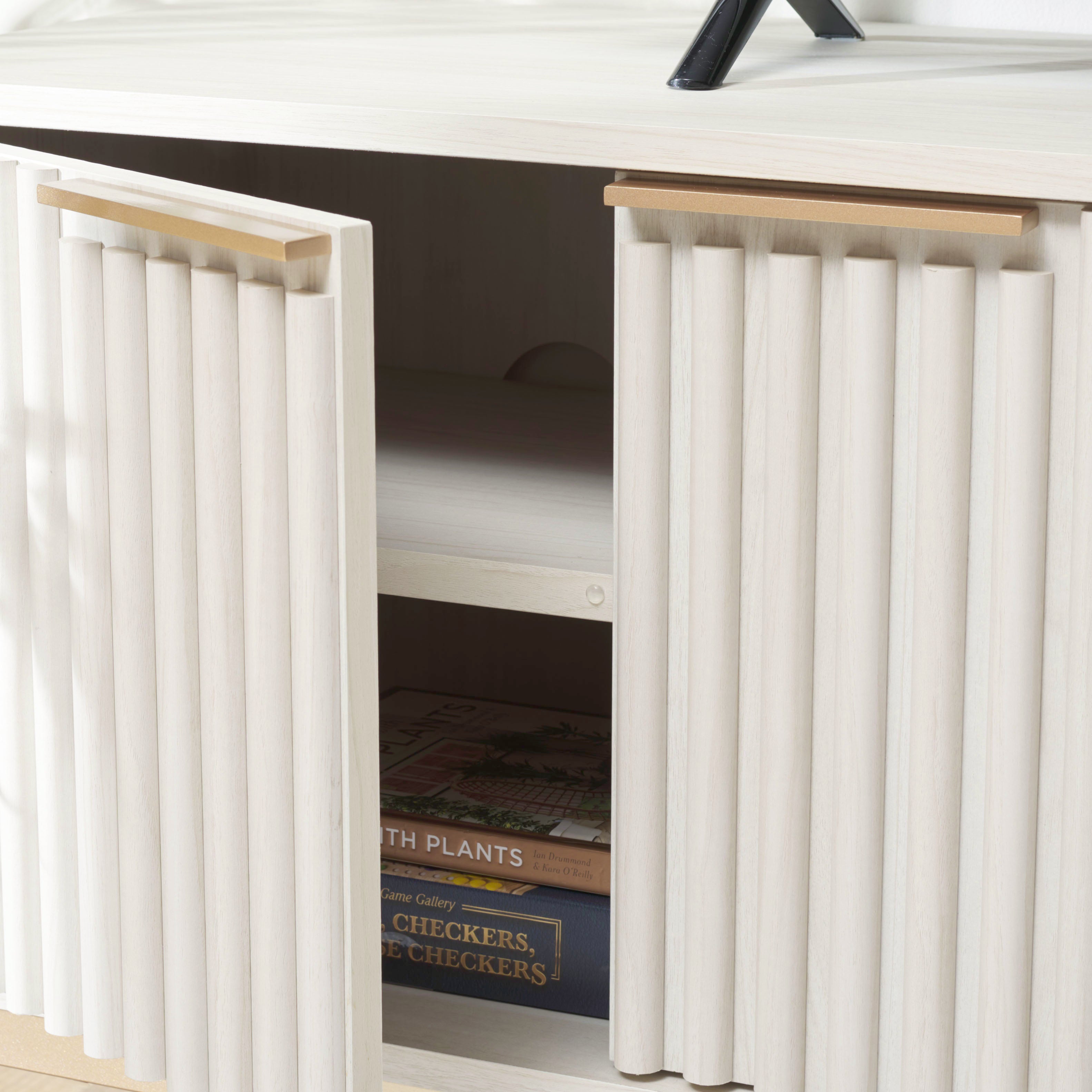 Add a smart and elegant storage unit to your home with our stylish Lylia media stand. It showcases the timelessness of mid-century design in a thoughtfully detailed and streamlined design. The clean and linear profile of the media unit is perched upon tapered legs. The media stand showcases rich grains of wood in a white finish for a versatile and charming appeal. Its tambour doors allow full access to the adjustable shelves to house all your media essentials. The three drawers are perfect for storing your knick-knacks, keeping your space organized at all times.