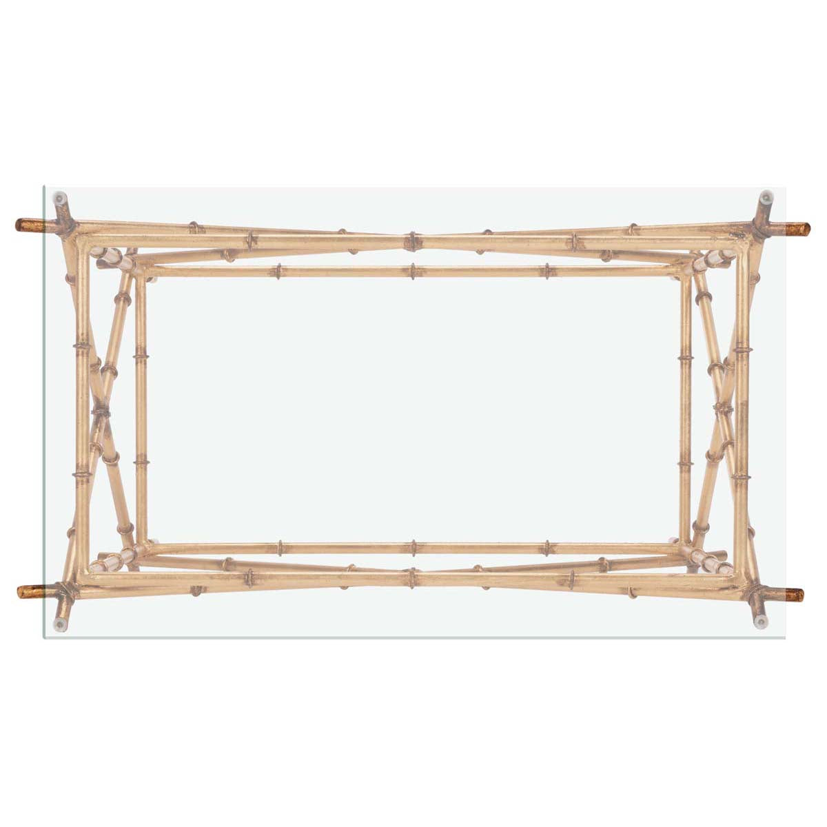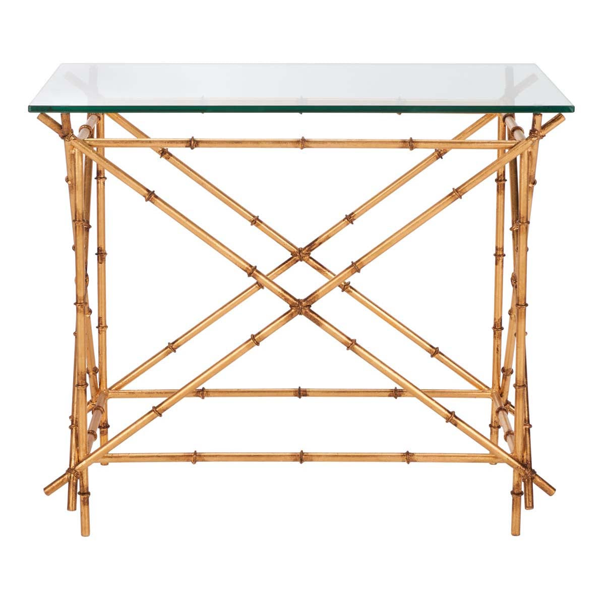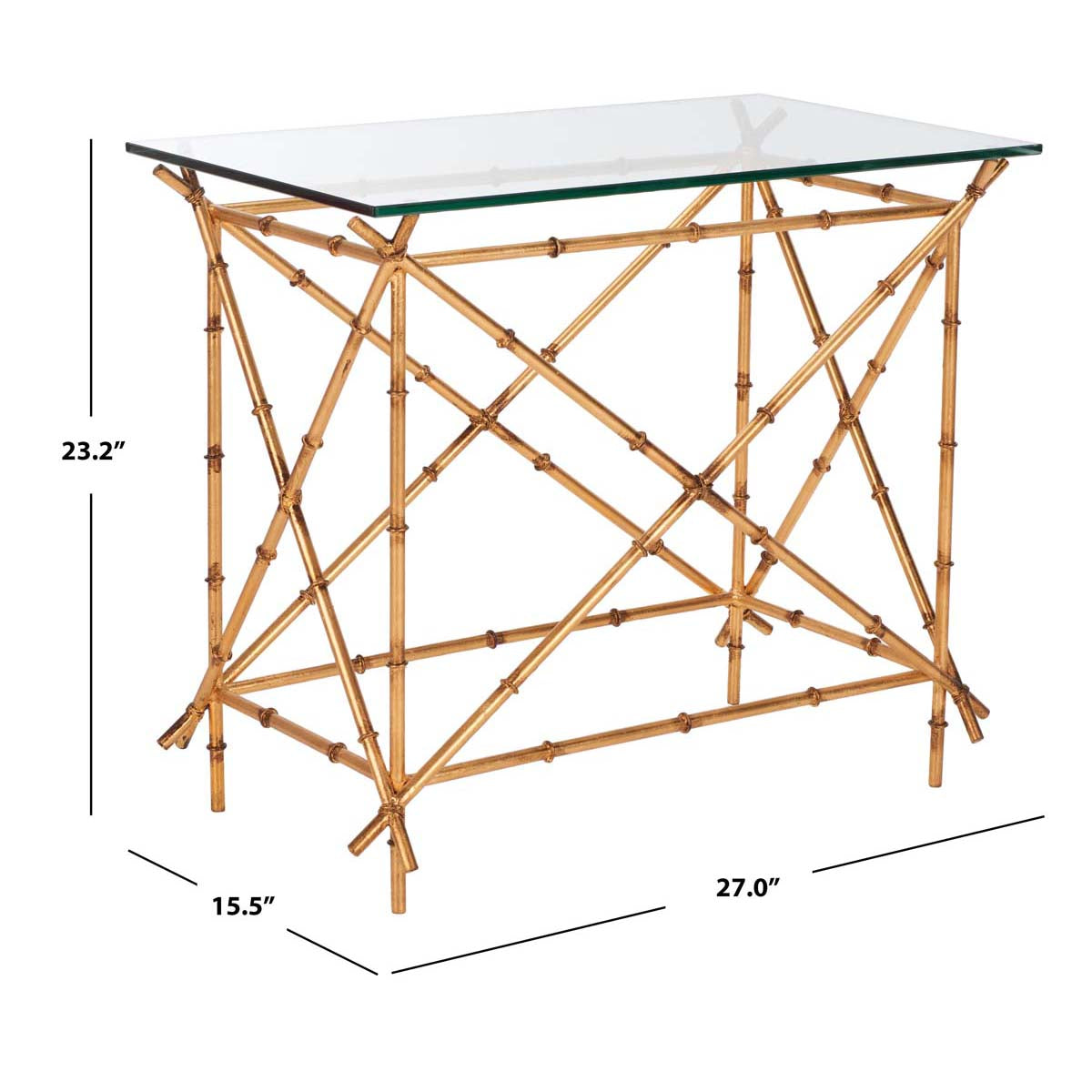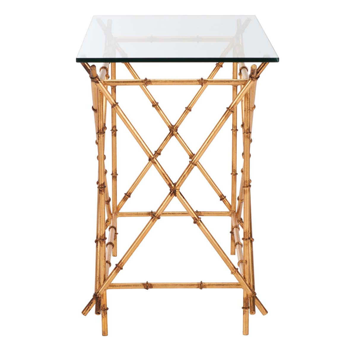 This striking Mark Accent Table exudes natural glamour with its bamboo inspired design. A warm gold finish highlights the rich iron details, perfectly balancing a crystal clear glass tabletop for a fashion chic look.