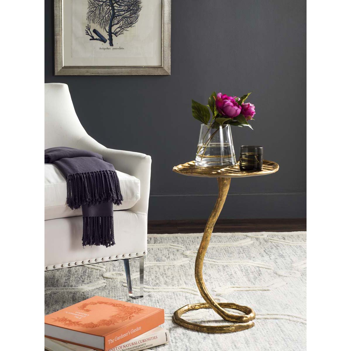 Inspired by the lush foliage found in the Brooklyn Botanical Garden, this contemporary side table radiates natural beauty. The shimmering gold finish amplifying its dramatic curves and artistic detail makes it a designer favorite.