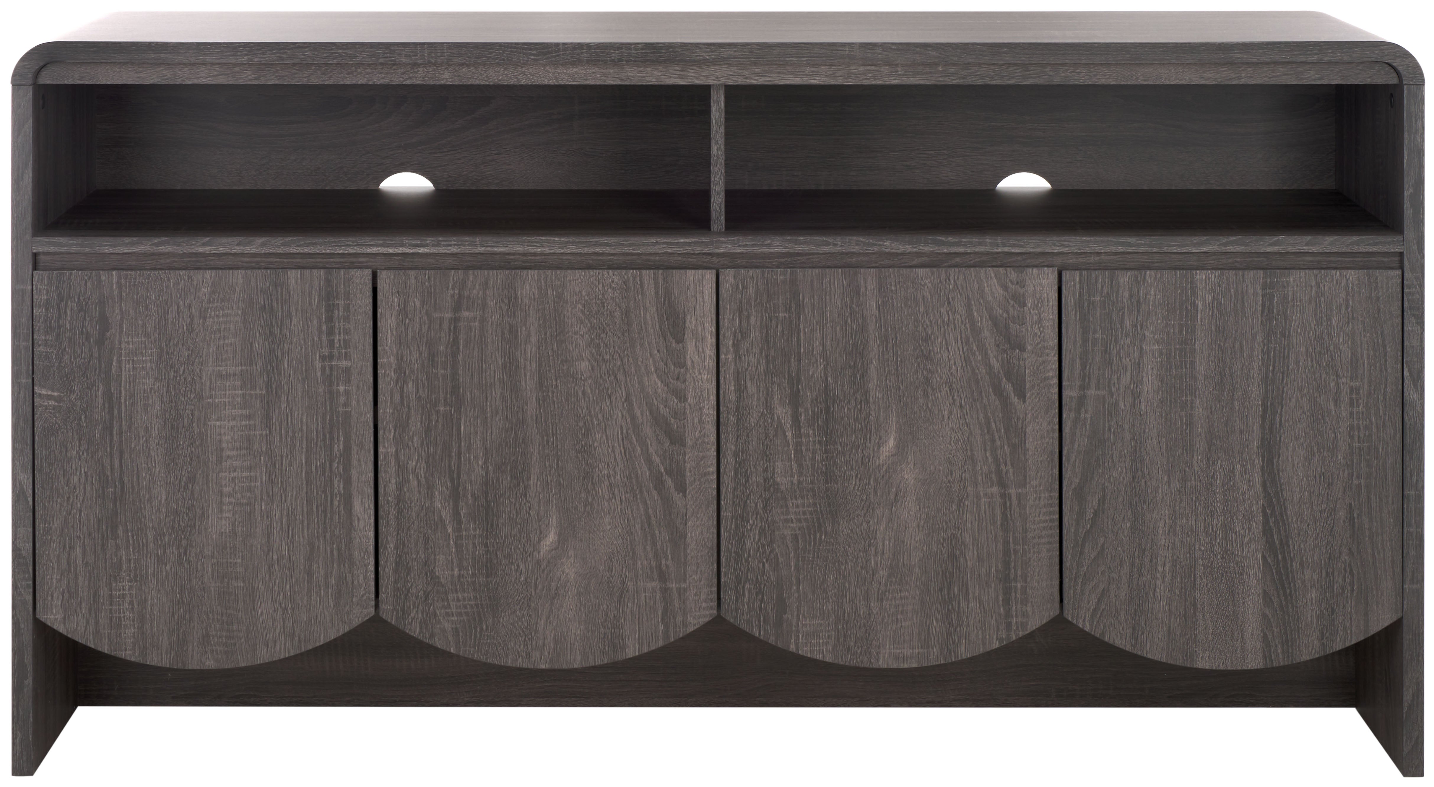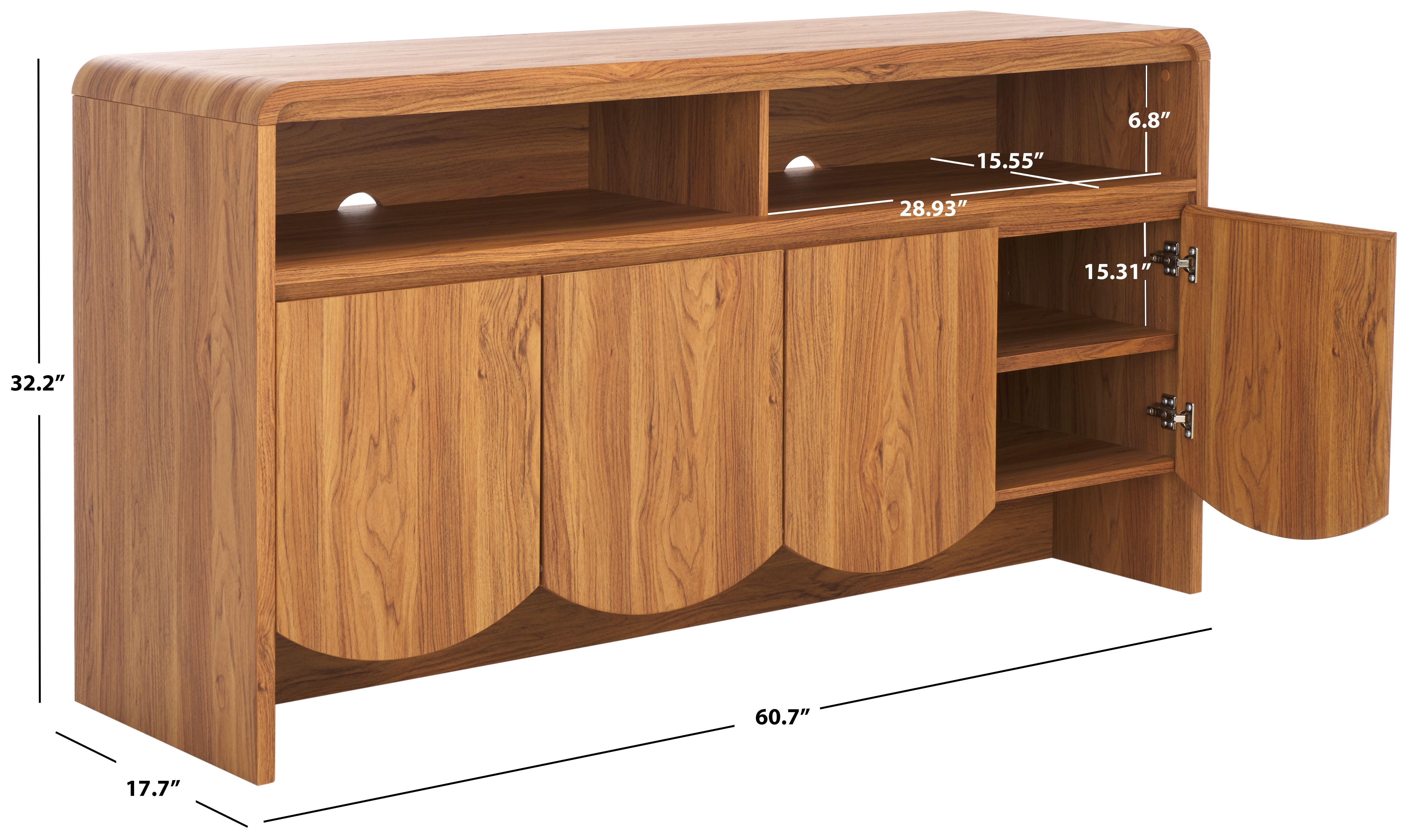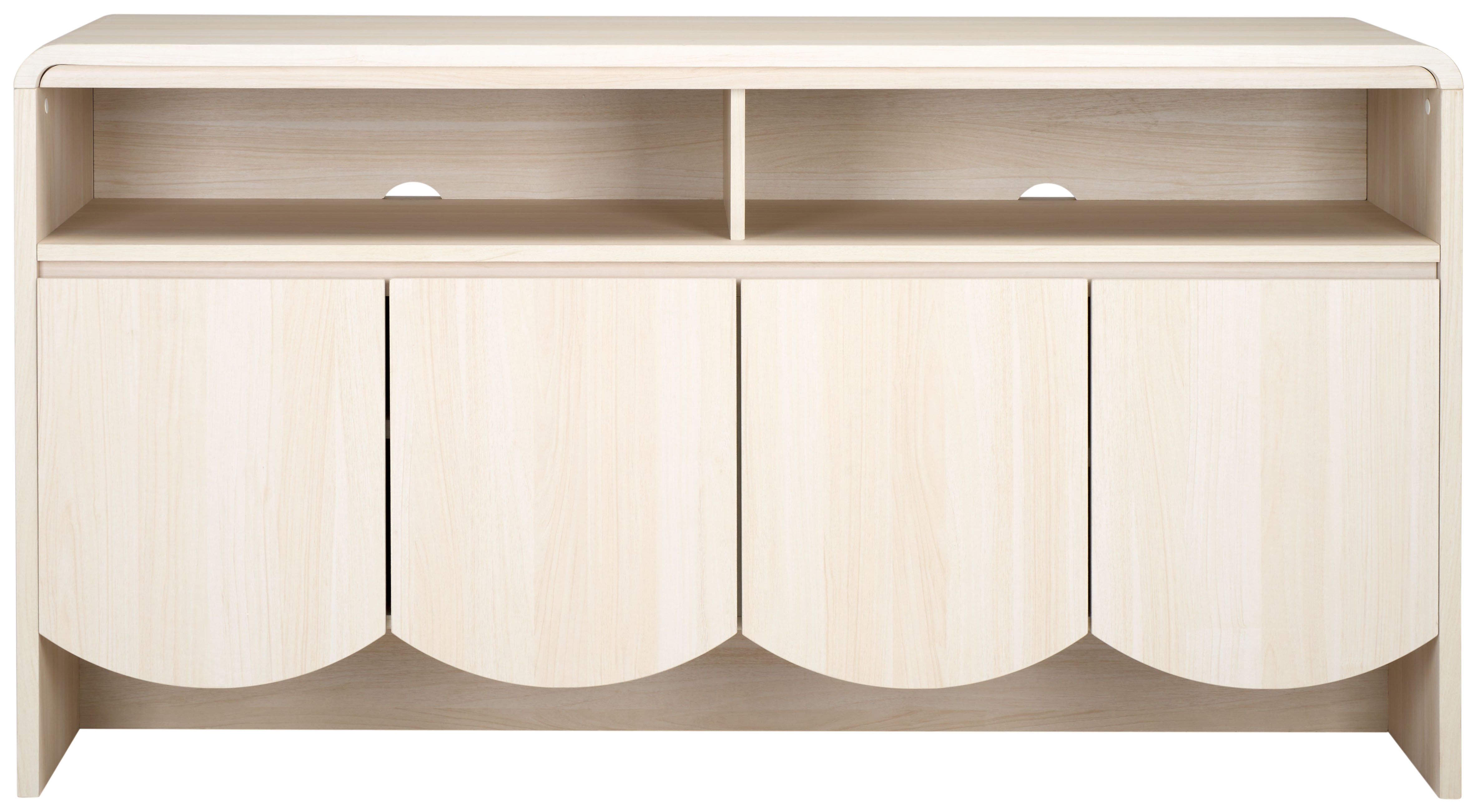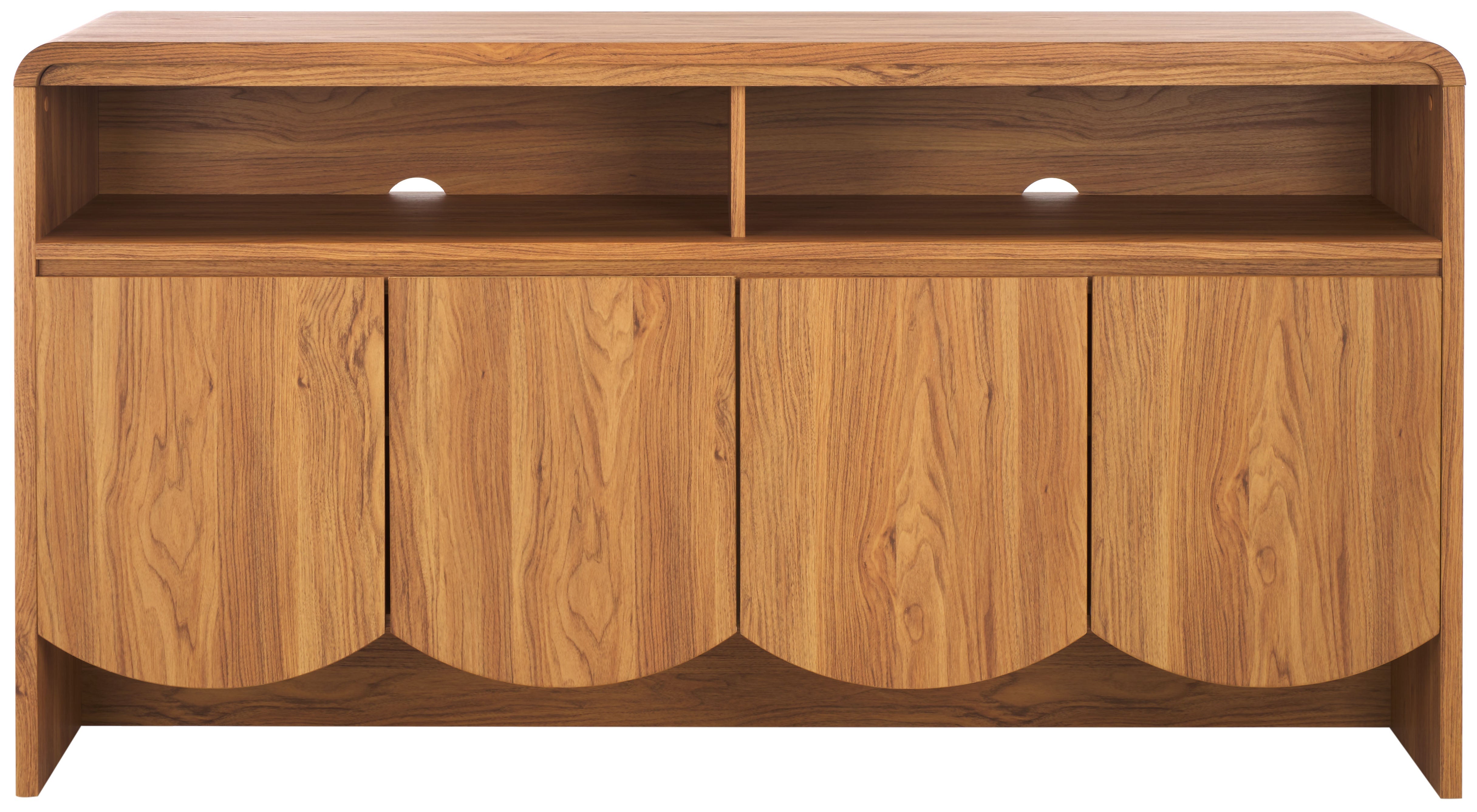 Make a chic and elegant statement with our Narine media stand. The streamlined media unit is defined by elegant proportions and charming curves. The clean, rounded edges lend a sleek and stately presence to our media unit. Its flat-front cabinets stand out with sleek and eye-catching curves at the bottom. Showcasing the rich grains of wood, our sideboard adds endless charm and character. It features open shelves and four roomy cabinets to offer a versatile storage unit that works well in each room.<