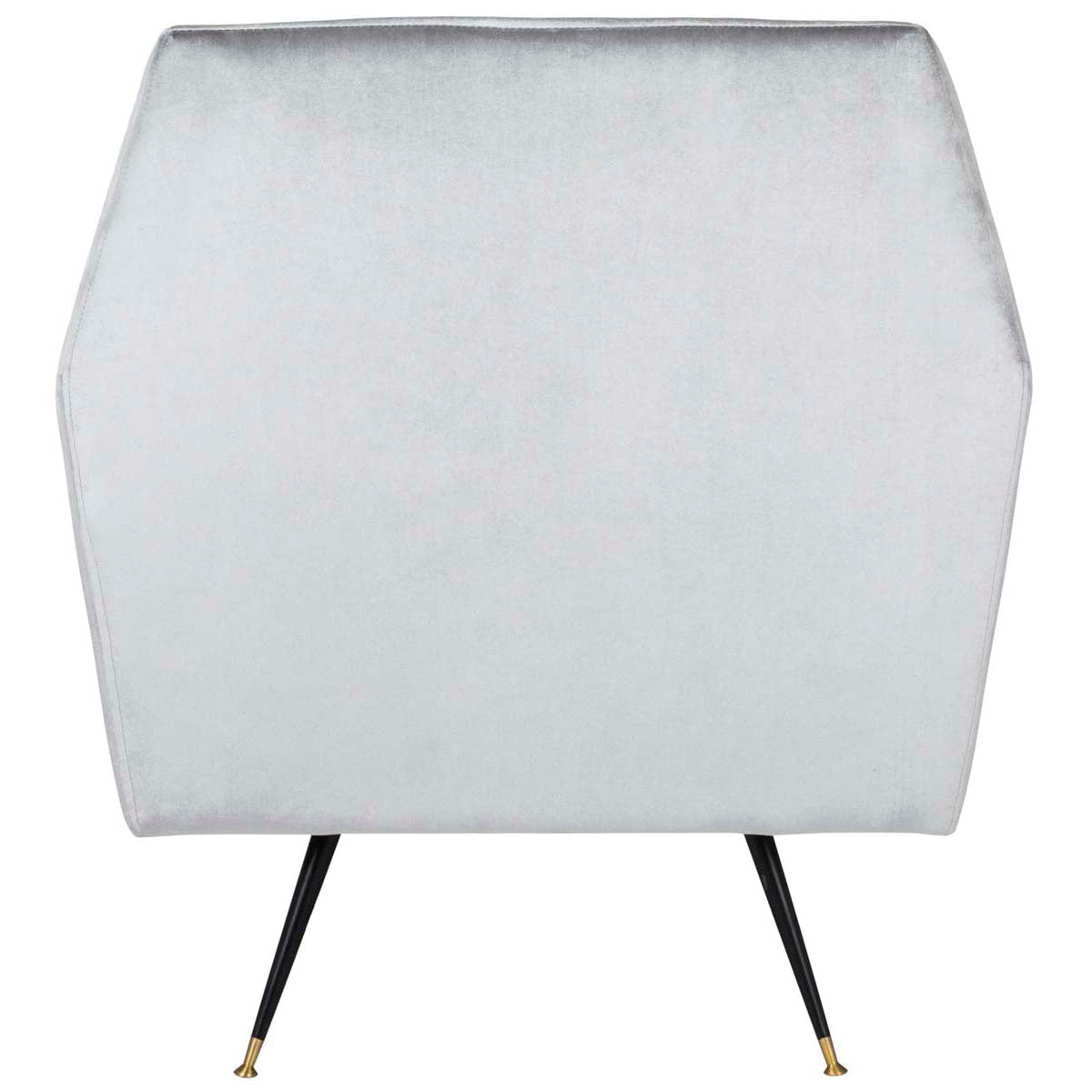 Make a bold statement in any room with this retro Mid Century sofa chair. Its geometric angles allow for a generous seat with maximum style. A designer favorite, its light grey velvet and gold cap legs bring instant character to any modern space.
