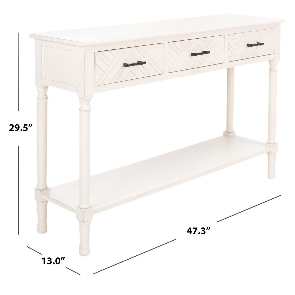 This Peyton Console is at once understated yet sophisticated, making it ideal for today's classic contemporary decor. Peyton's open bottom shelf provides ample display space, while the oversized herringbone pattern on its three drawers gives a modern touch to Peyton's carved wooden accents.