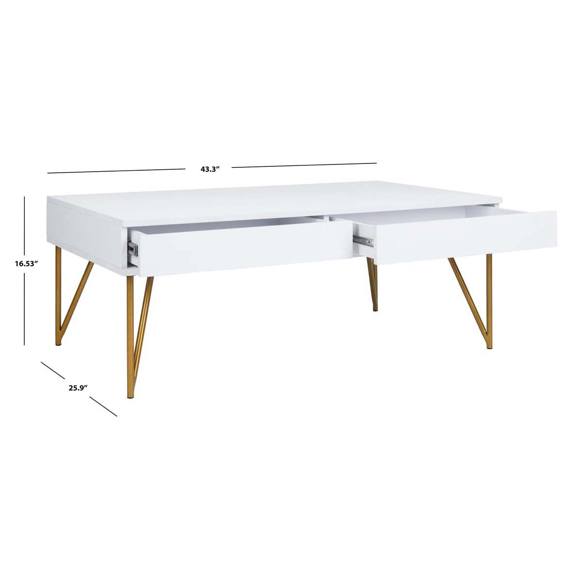 Safavieh Pine Two Drawer Coffee Table - White/Gold Iron - White / Gold Iron / 43.3" X 25.9" X 16.5" is backordered and will ship as soon as it is back in stock.
