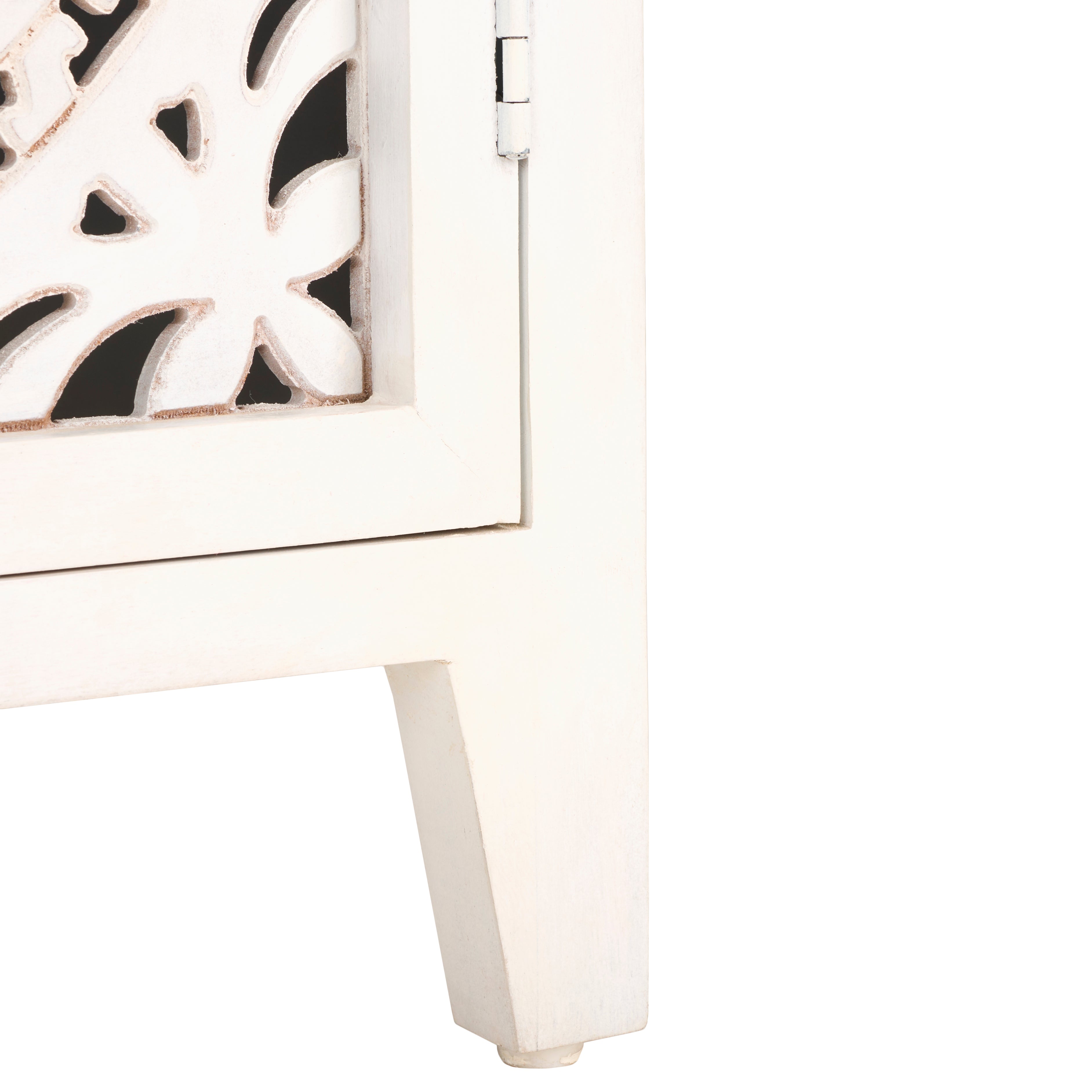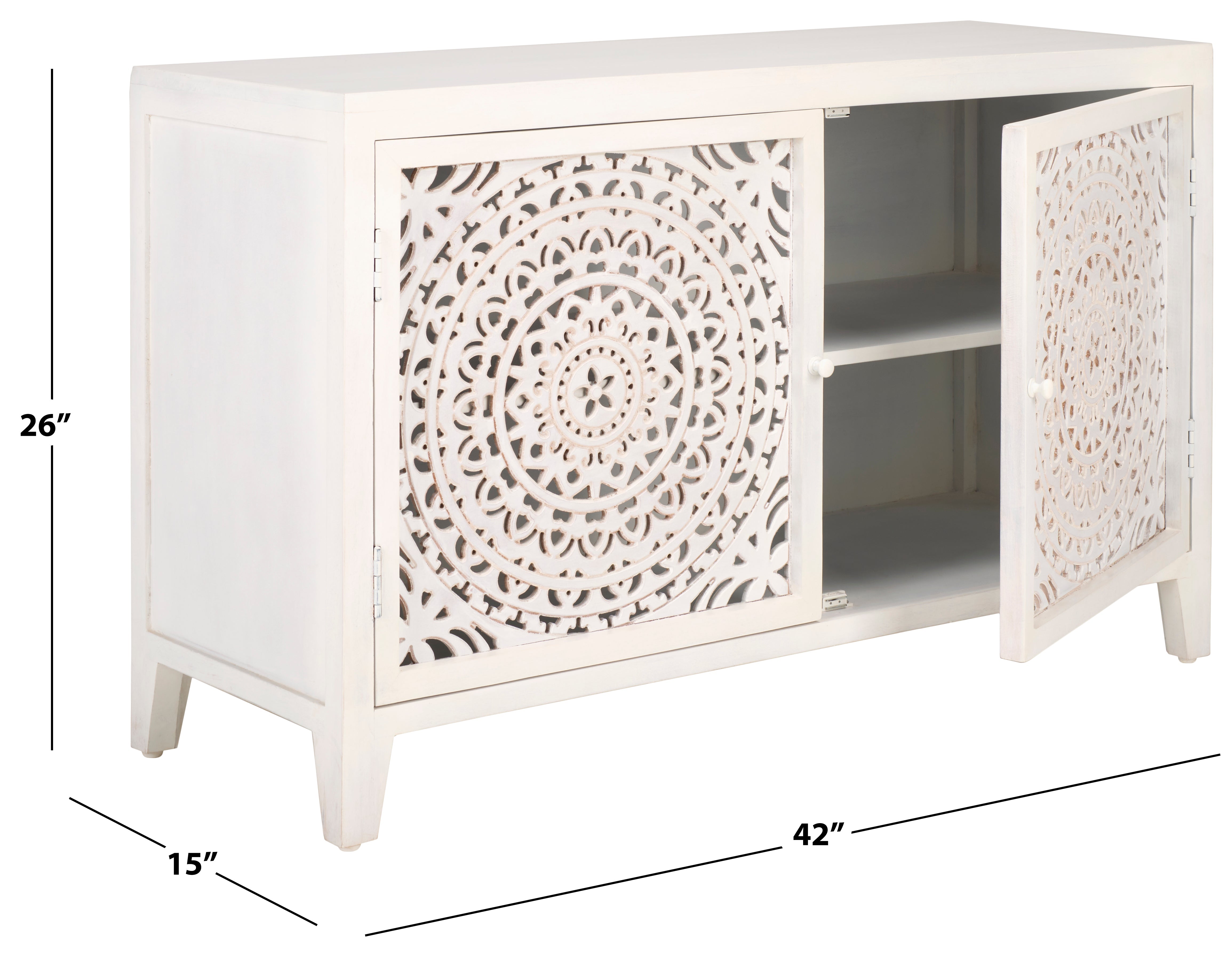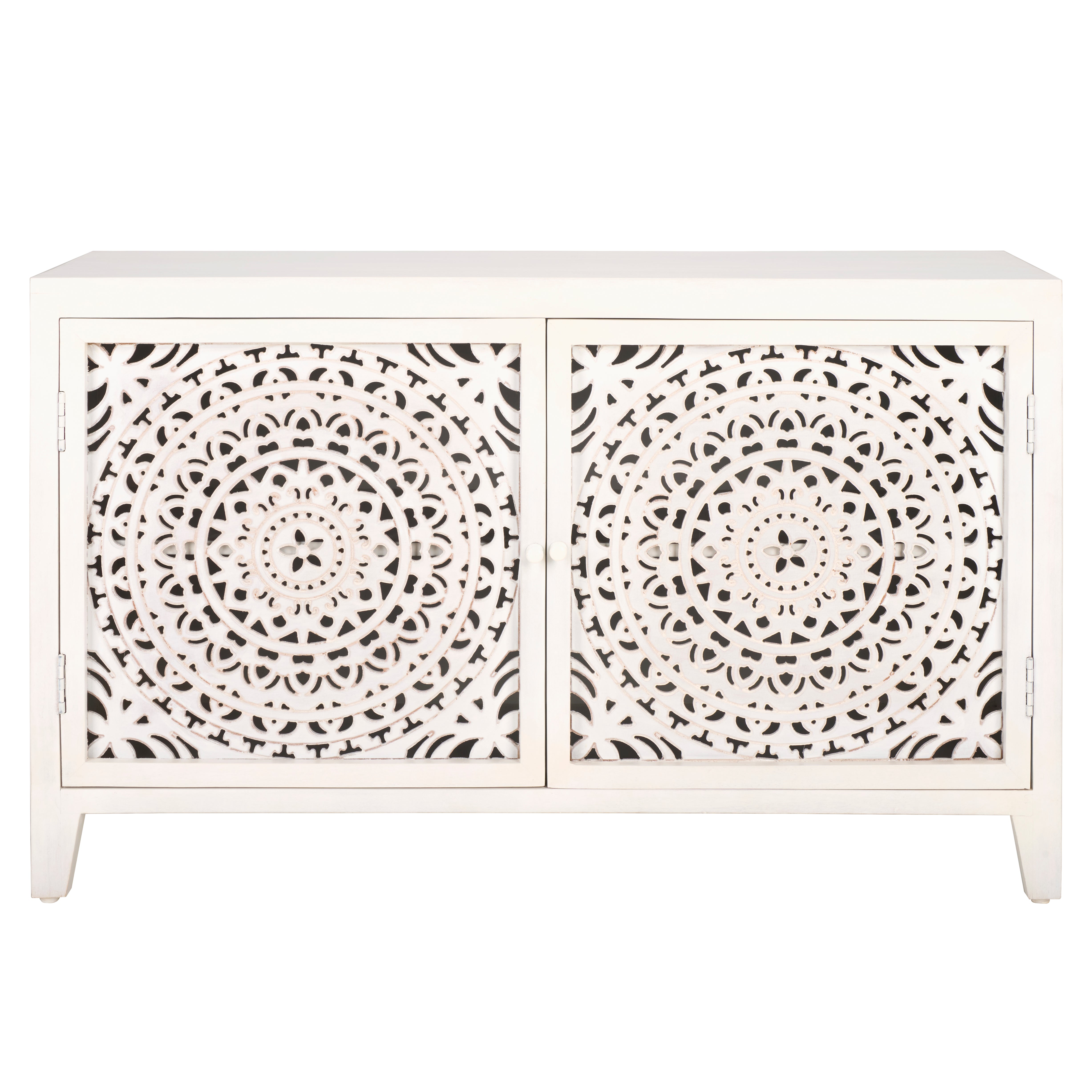 Enliven your home with the eclectic beauty and grace of Raelie media stand. Its eye-catching facade features a stunning cut-out pattern in mango wood. The design combines vegetal details in bold, concentric circles to instantly capture the eye. The artisanal facade of our media unit is juxtaposed against a sleek silhouette and minimal details. An artful centerpiece for any living room or den, the media stand is completed with a graceful white wash finish. It features four roomy shelves to support all your media equipment and storage.