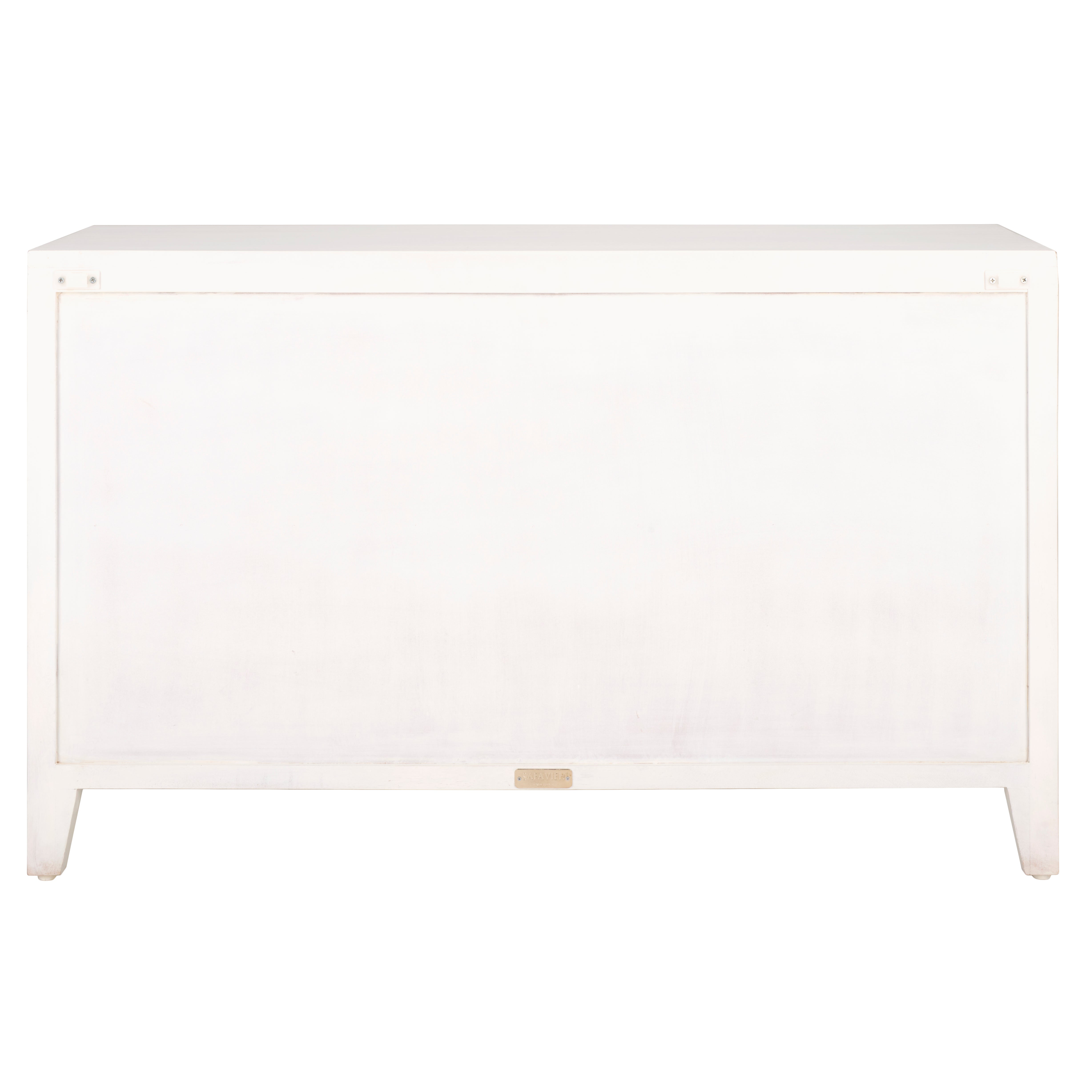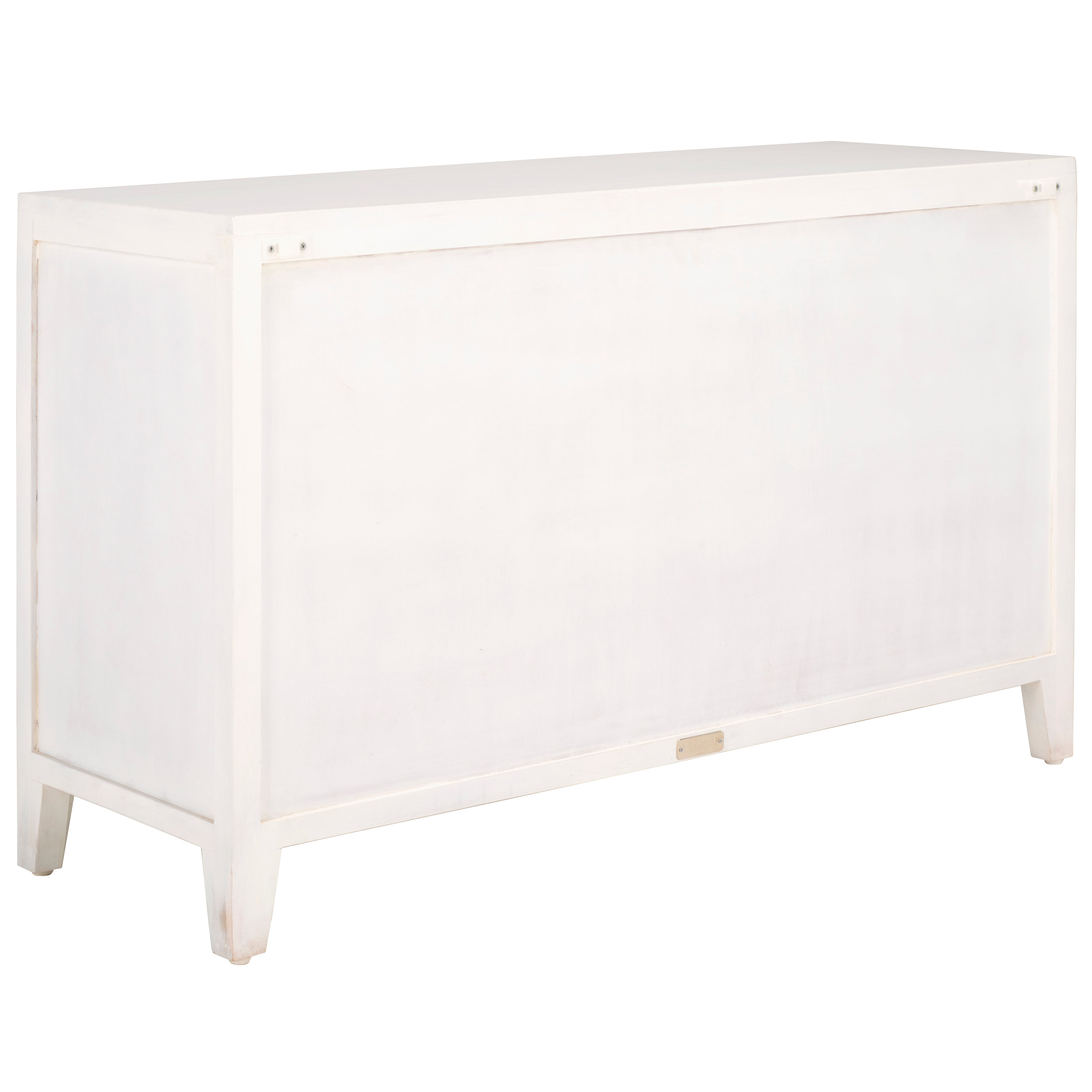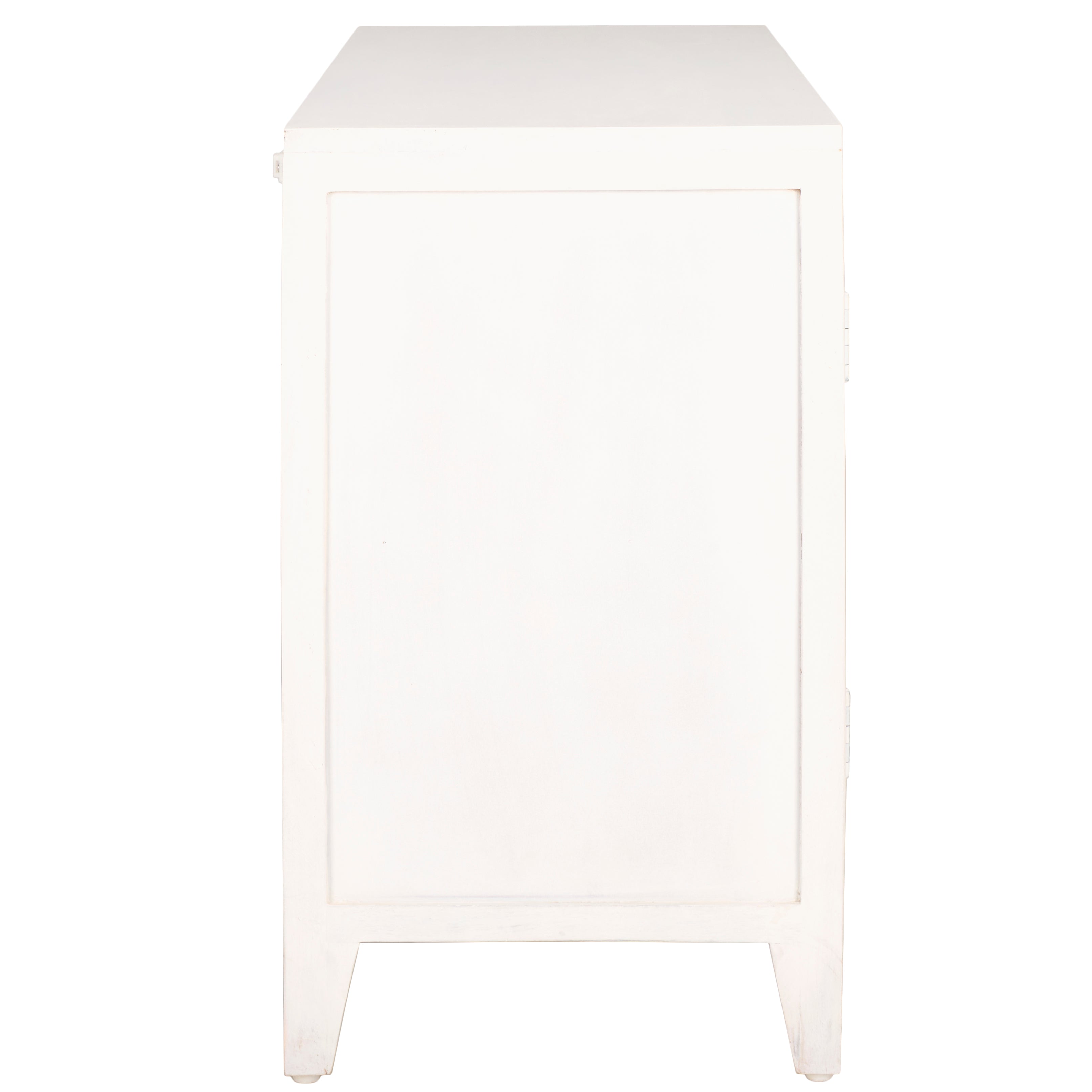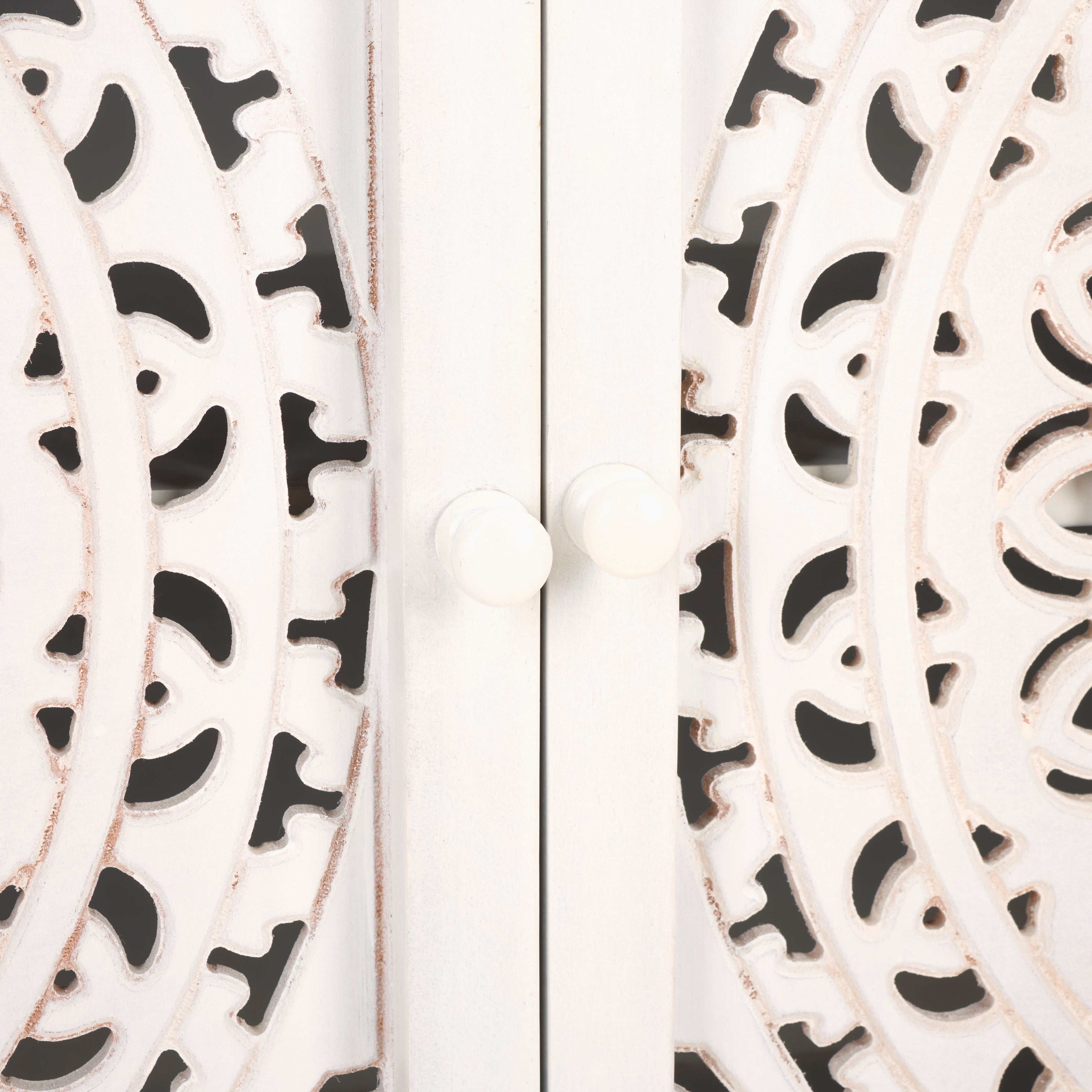Enliven your home with the eclectic beauty and grace of Raelie media stand. Its eye-catching facade features a stunning cut-out pattern in mango wood. The design combines vegetal details in bold, concentric circles to instantly capture the eye. The artisanal facade of our media unit is juxtaposed against a sleek silhouette and minimal details. An artful centerpiece for any living room or den, the media stand is completed with a graceful white wash finish. It features four roomy shelves to support all your media equipment and storage.
