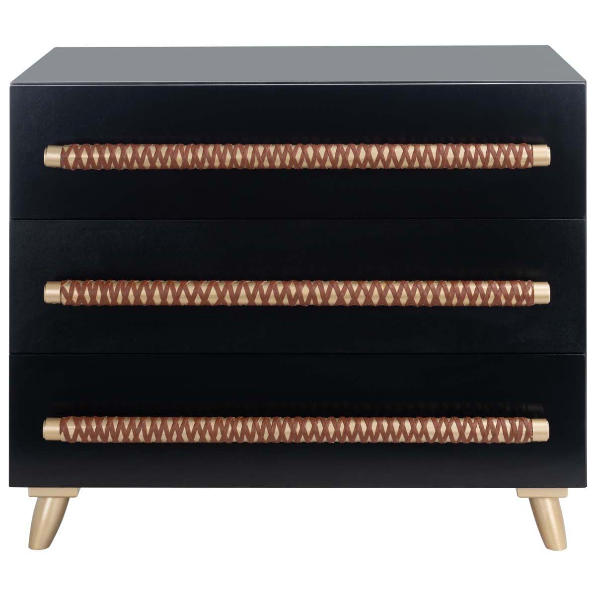 Mid Century chic meets modern rustic charm in this uniquely styled Raquel 3 Drawer Chest. Raquel's retro inspired splayed legs lend any room a touch of timeless ?lan, and the faux leather accents on its drawer pulls are absolutely captivating. A d?cor smart black finish completes the look.