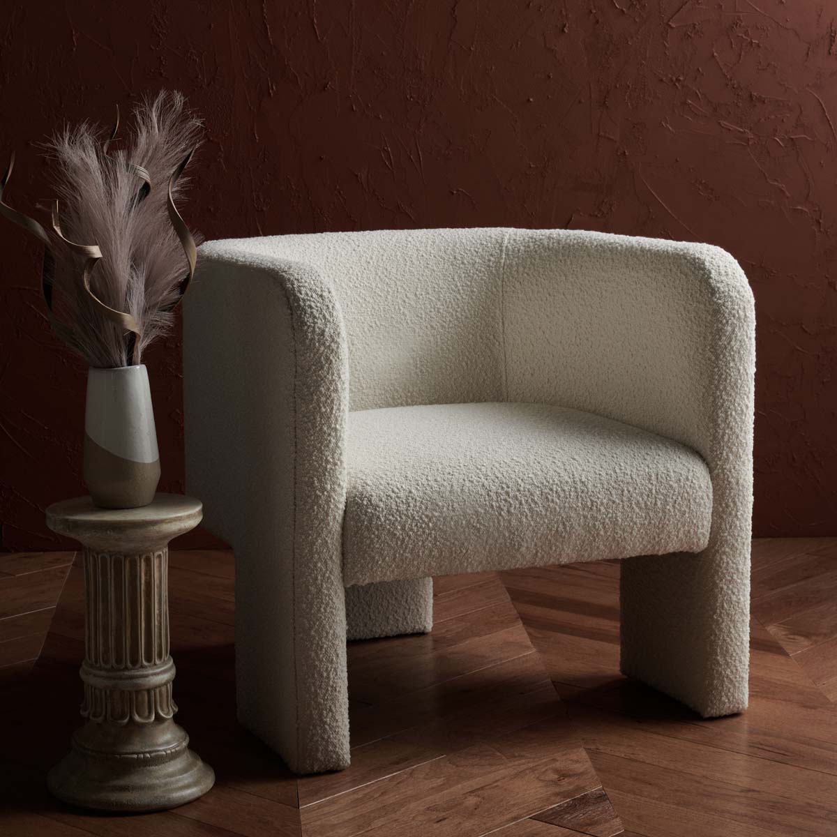 High fashion meets home Decor in this stunning Sammie Accent Chair. Sammie's classic barrel back silhouette is given a dramatic modern makeover with its tripod base, and its all-encompassing boucle upholstery makes Sammie an emblem of absolute luxury.