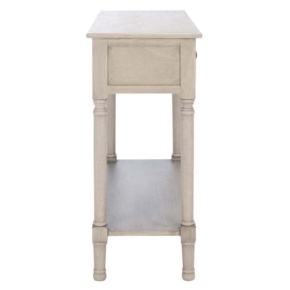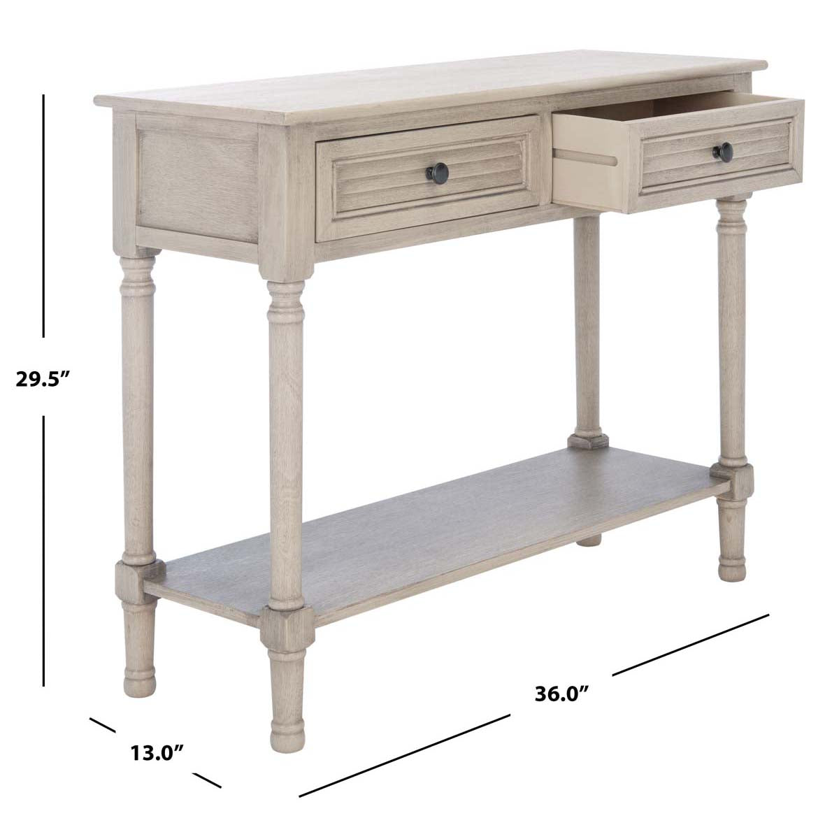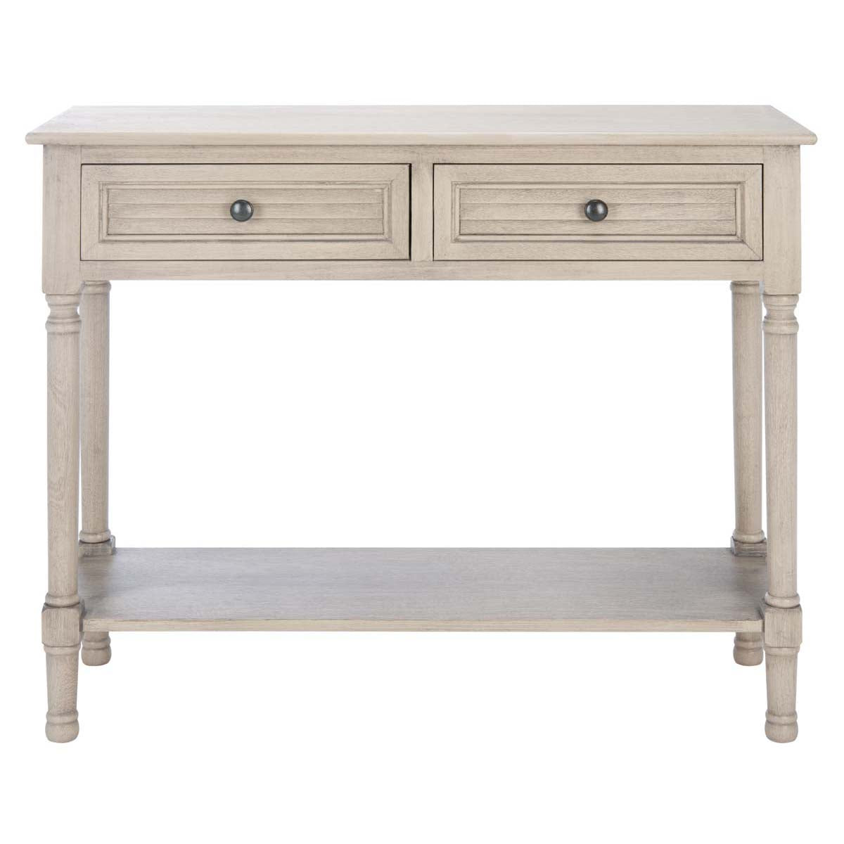 A touch of timeless tradition comes to classic contemporary d?cor in this Tate Console Table. Tate?? finely sculpted turned legs and carved details are treated to a modern farmhouse upgrade with the liner pattern on its two spacious drawer and soft greige finish.