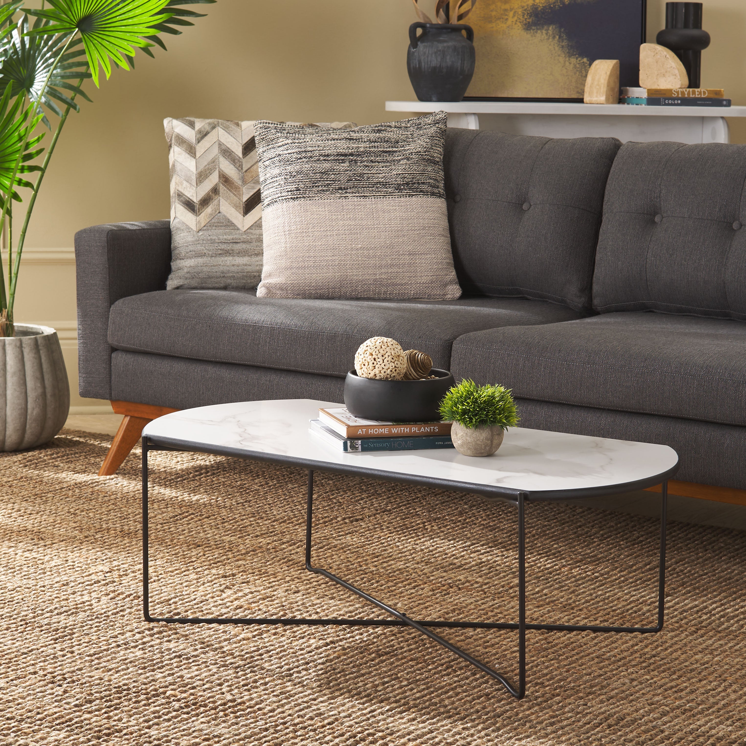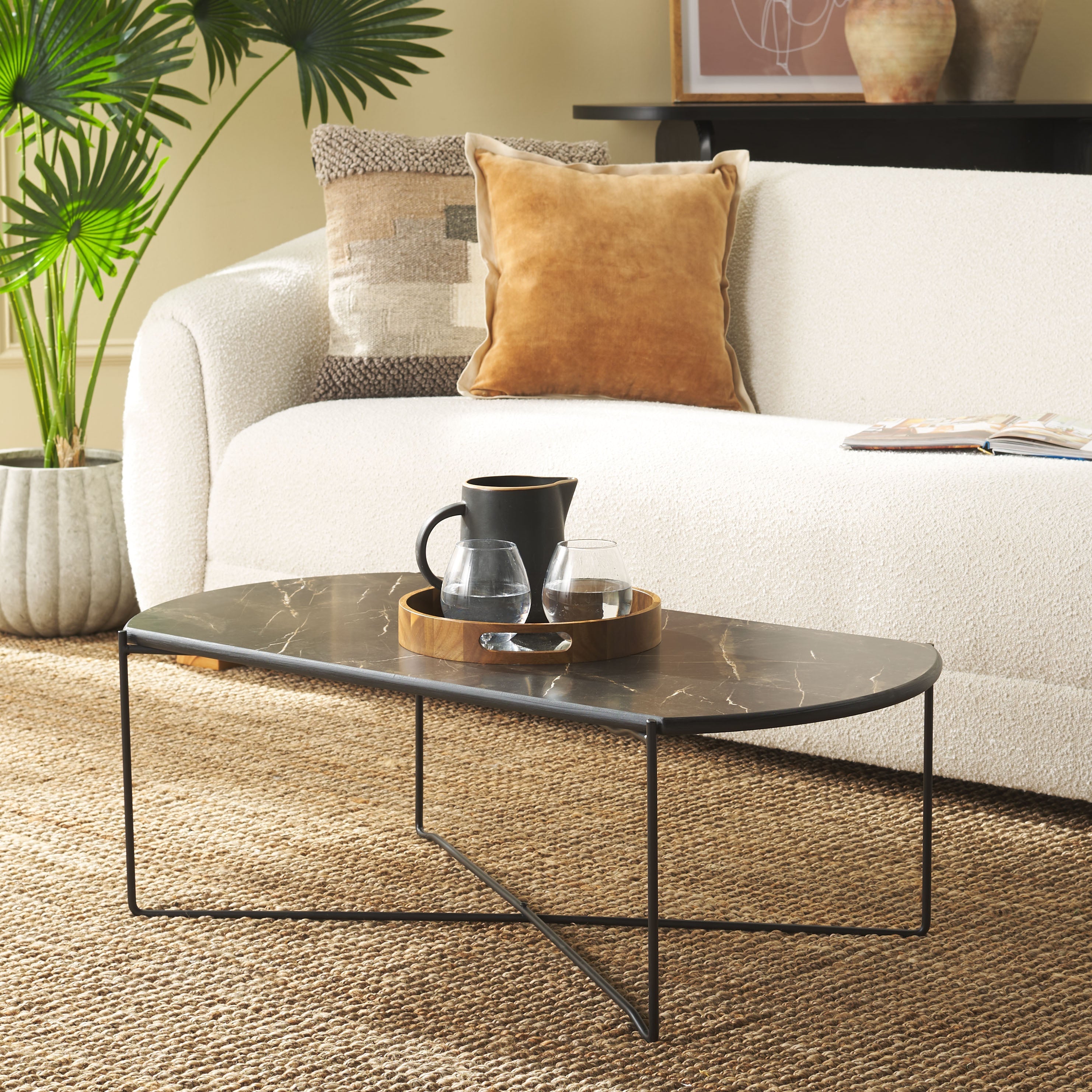 Update your living space with our beautifully refined and minimalistic Vickie coffee table. Streamlined and stylish, our coffee table impresses with its effortless style and grace. Its rectangular tabletop features curved edges to attain an inviting appeal. A gorgeous finish adds a graceful and polished touch to the coffee table. Its slender black metal base intersects to enhance the geometric appeal and make a sleek style statement. Our refined coffee table can make your bedroom, lounge, or home office feel open and airy.
