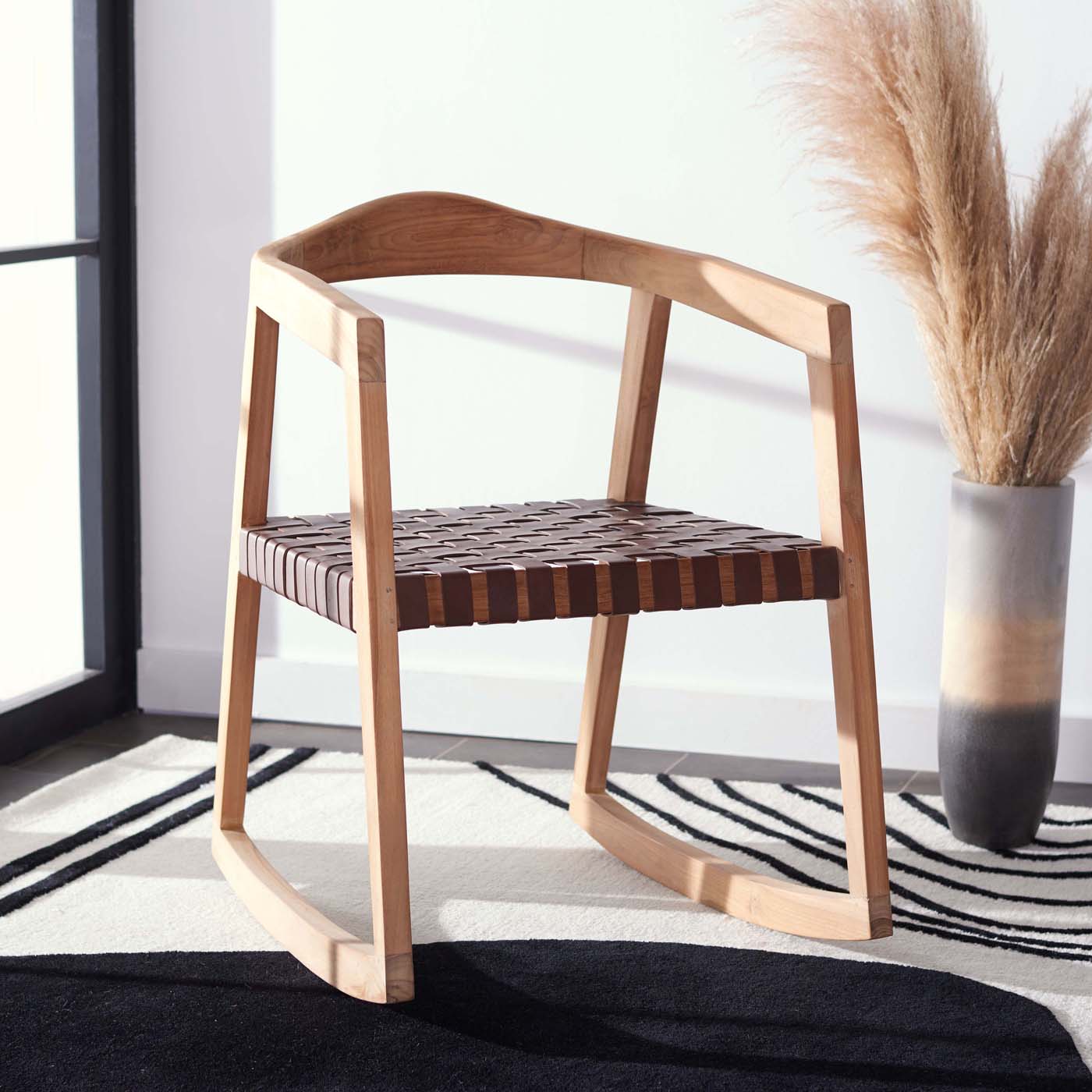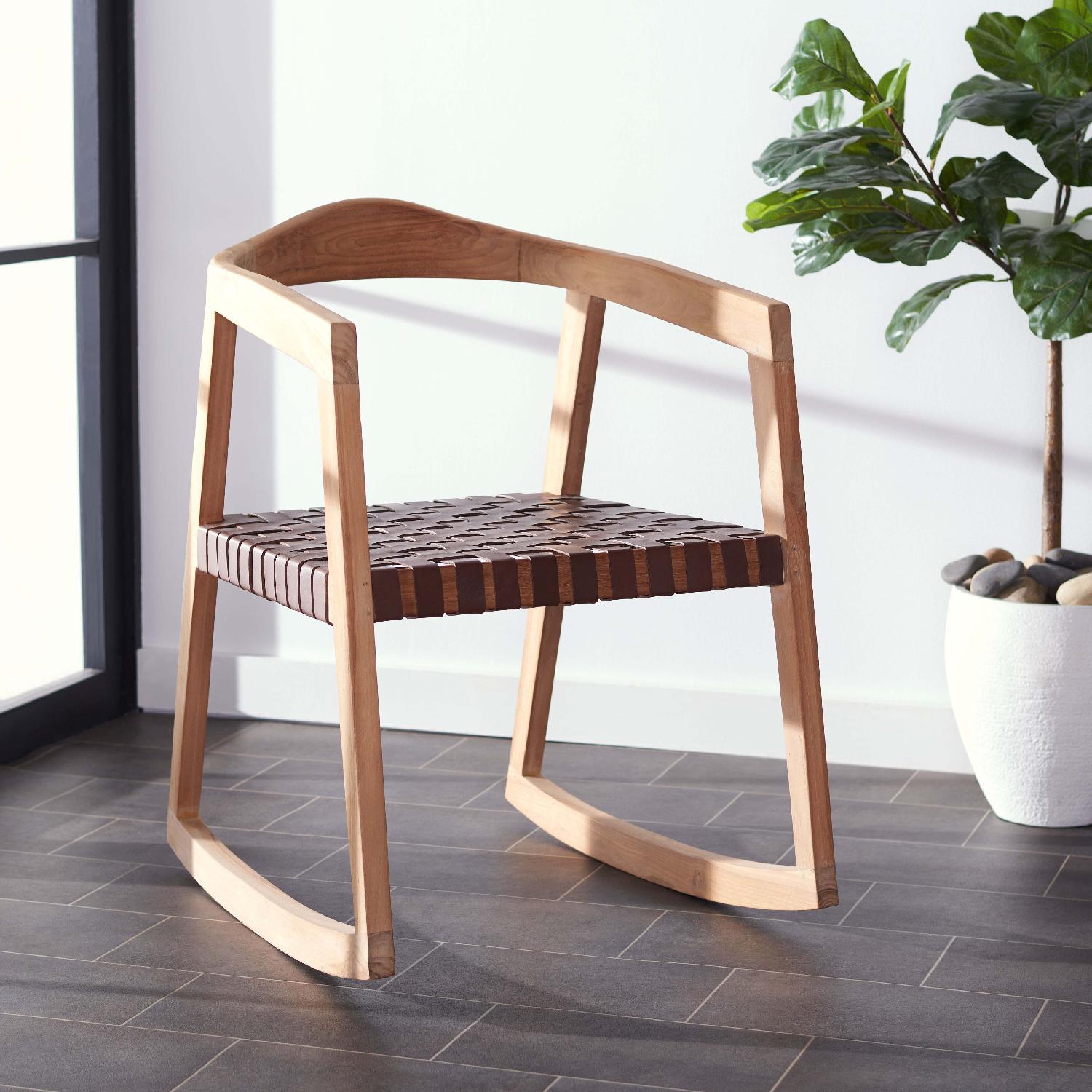 Laid-back comfort meets contemporary chic in this trendsetting Willa Rocking Dining Chair. Willa?? finely carved natural-finished teak flaunts smooth curves that are beautifully offset by Willa?? woven cognac genuine cow leather seat, and designers love the artistic depth of its open frame.