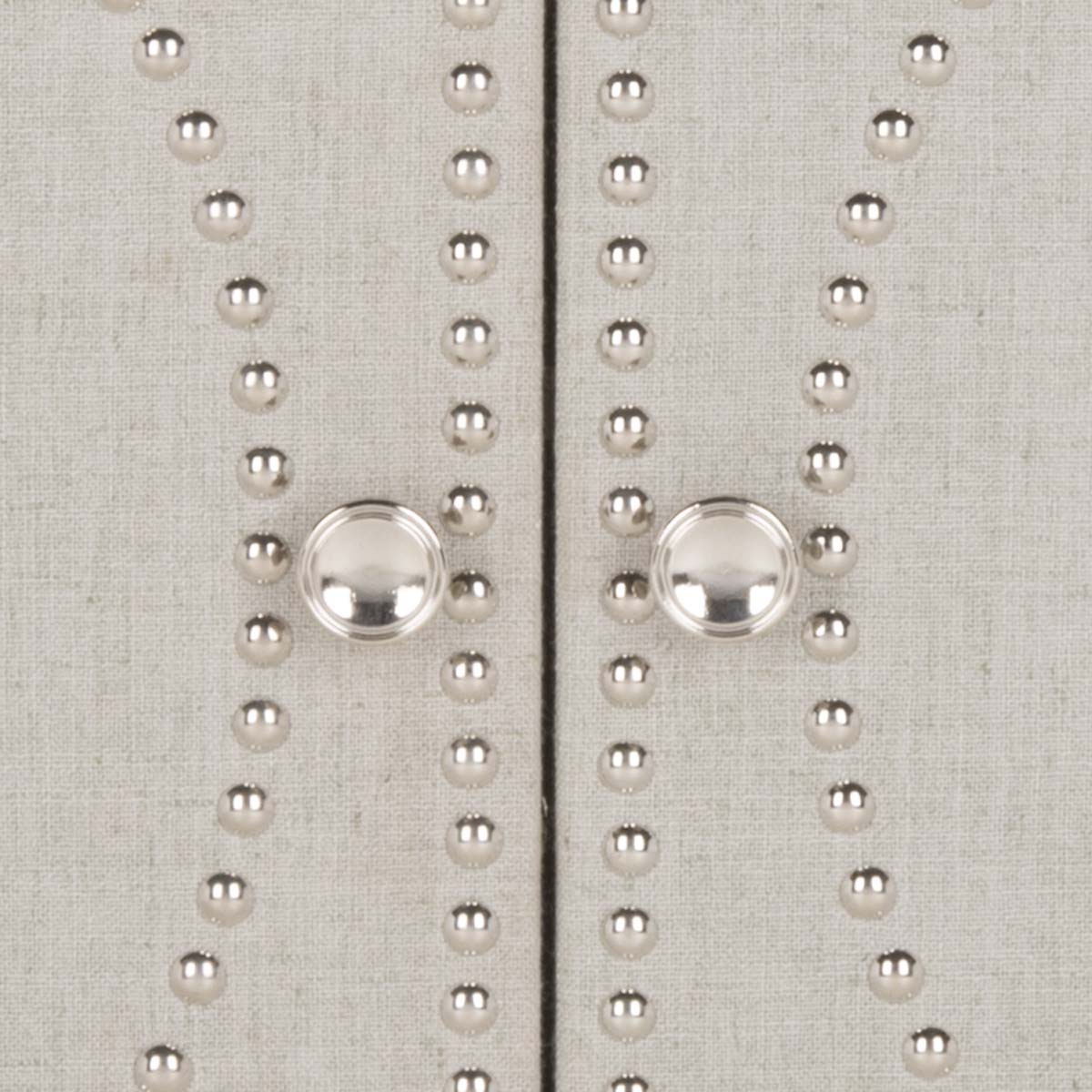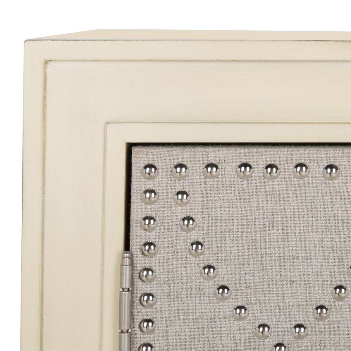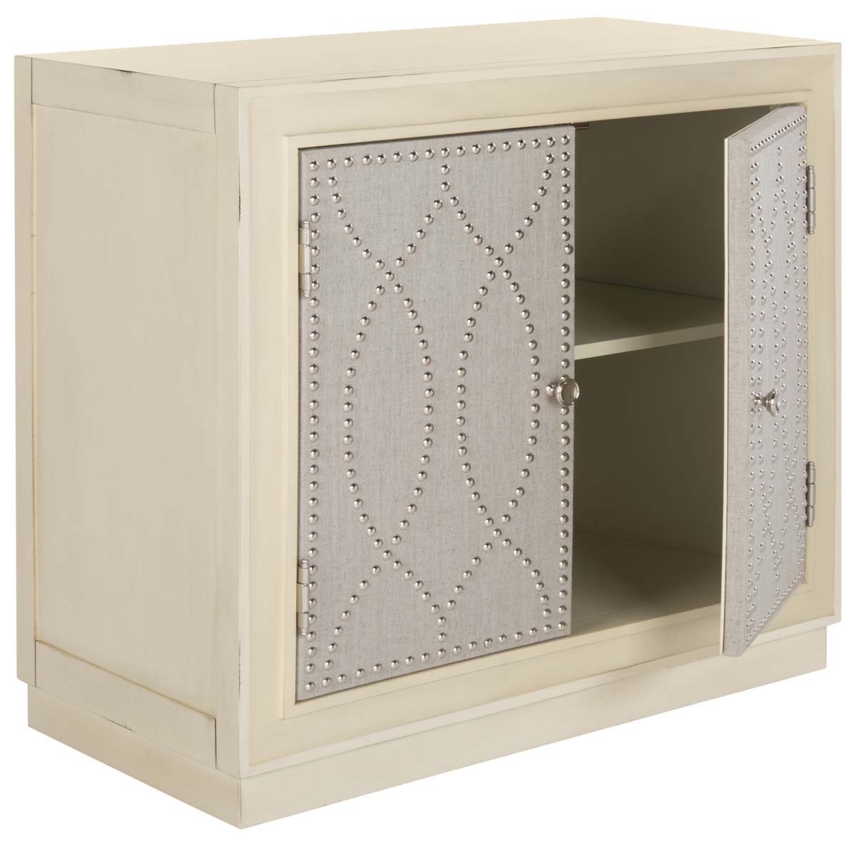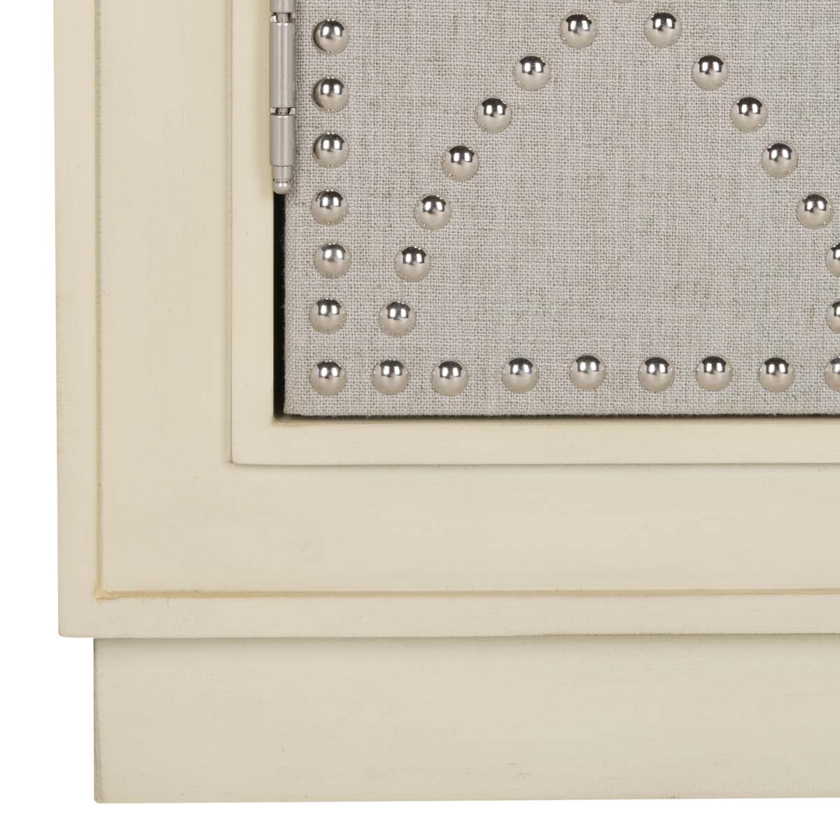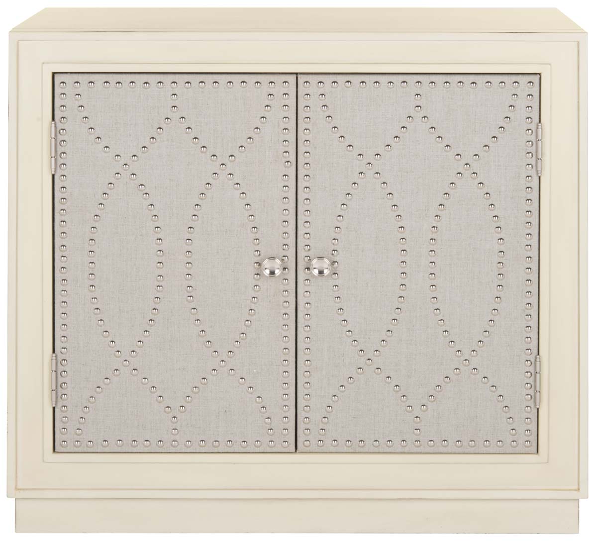 Designed for the eclectic collector, this Yuna Chest gives your d?cor brand new life. Yuna's one of a kind nickel nailhead details over two light grey linen doors create a couturier look that is beautifully flanked by the antique beige finish on its classic frame.