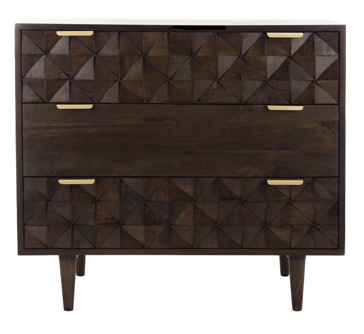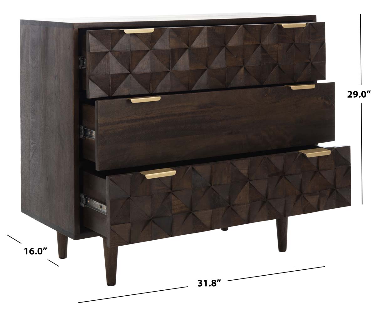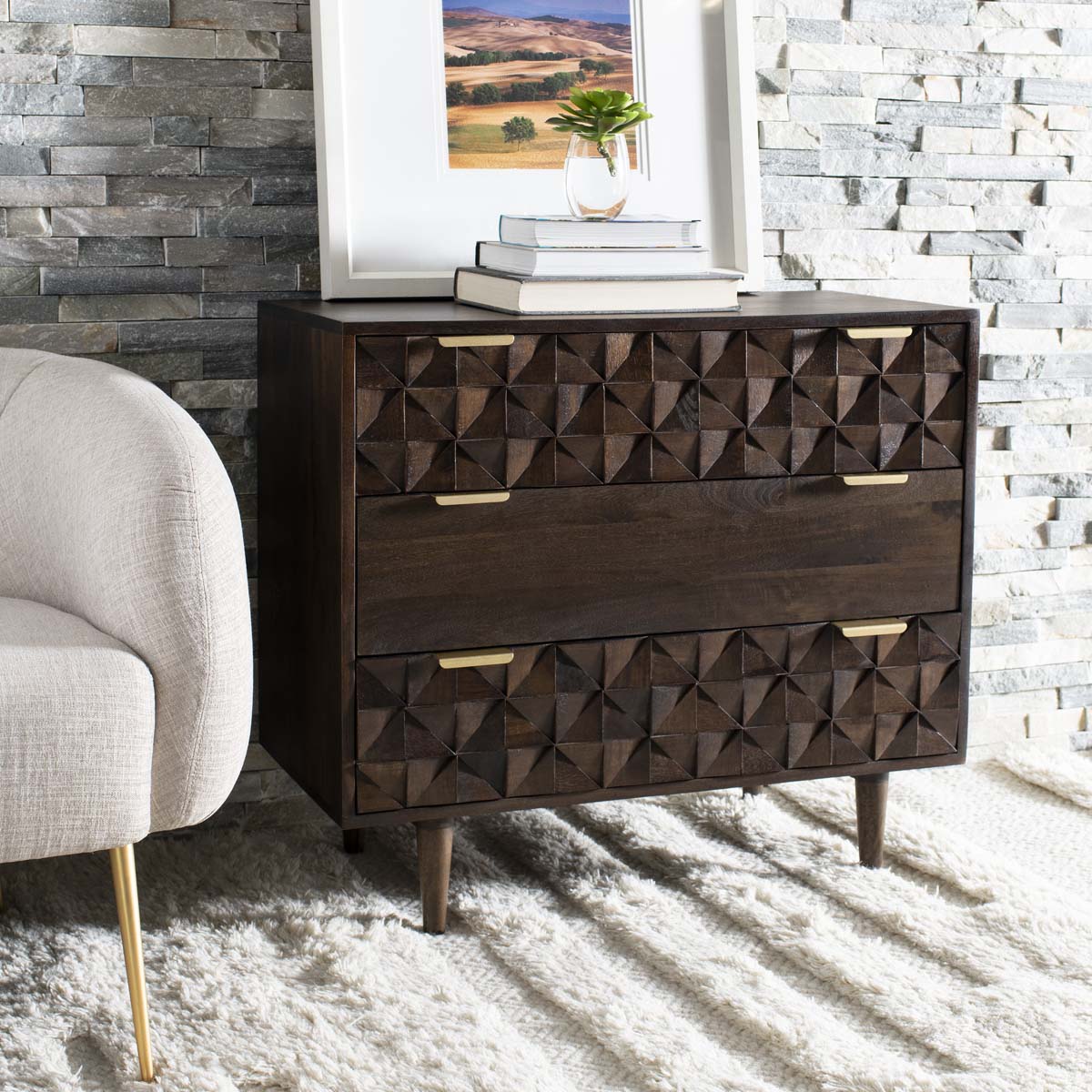 The finely carved geometric details of this Zinnia Chest give it a distinct couturier look, elevating your d?cor to new heights of style and glamour. Two of Zinnia?? three ample drawers feature artfully faceted sculptured accents, beautifully highlighted by a deep walnut finish and sleek brass pulls.