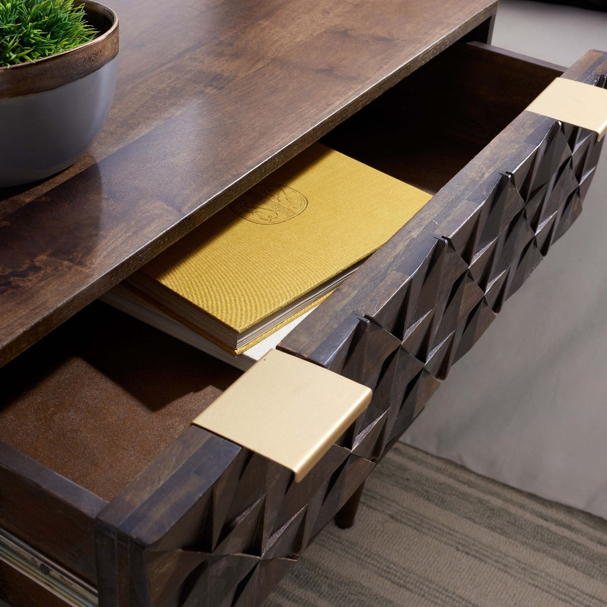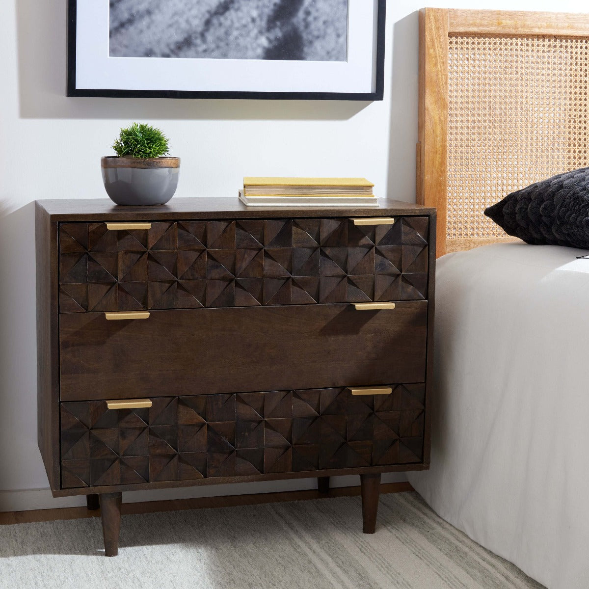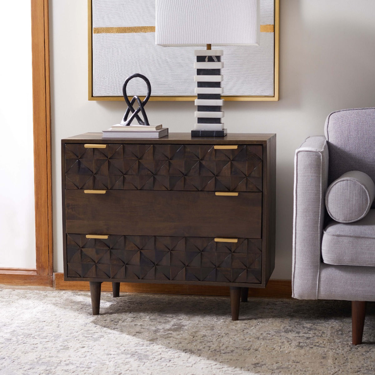 The finely carved geometric details of this Zinnia Chest give it a distinct couturier look, elevating your d?cor to new heights of style and glamour. Two of Zinnia?? three ample drawers feature artfully faceted sculptured accents, beautifully highlighted by a deep walnut finish and sleek brass pulls.