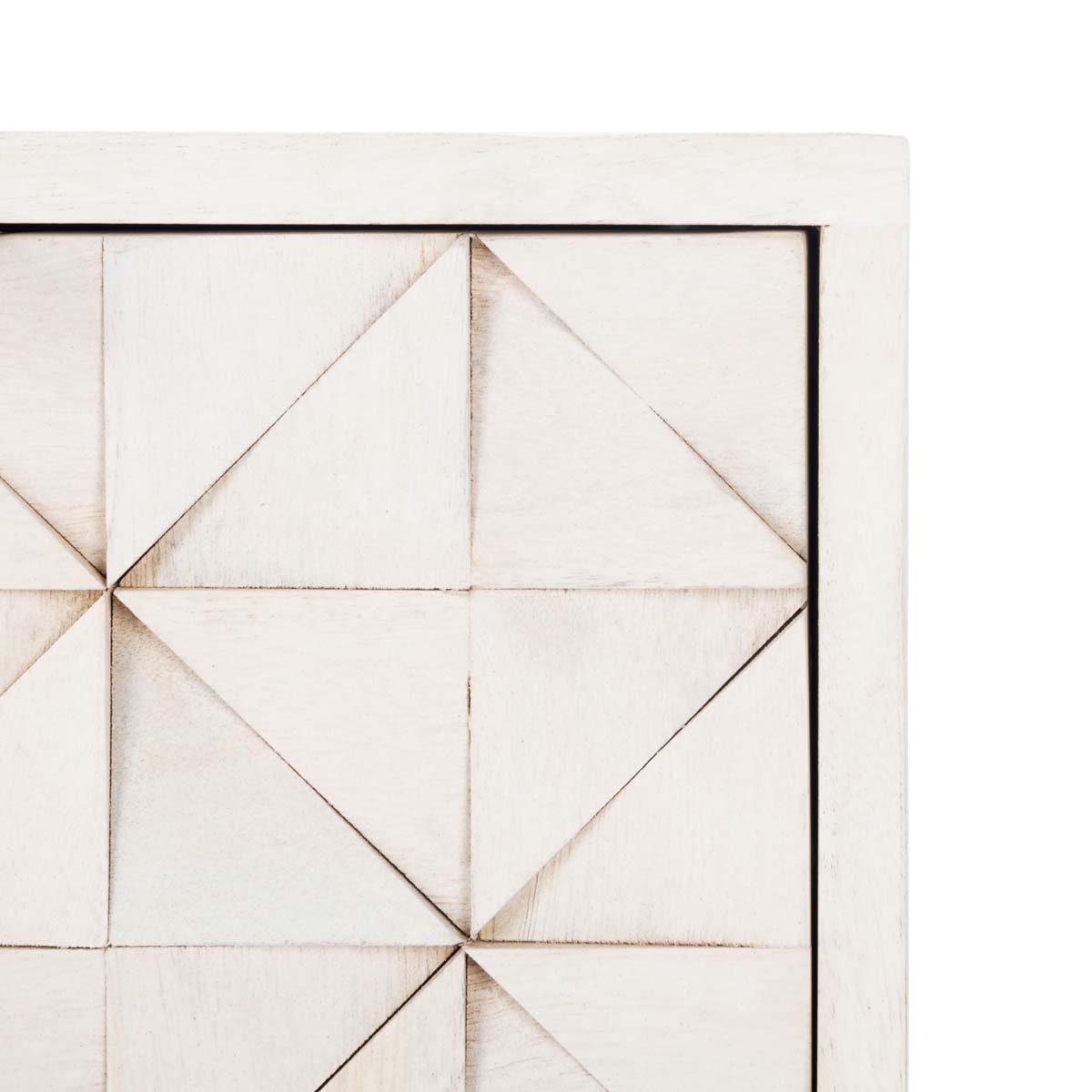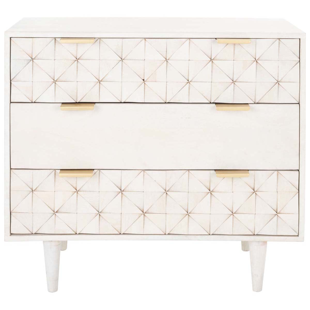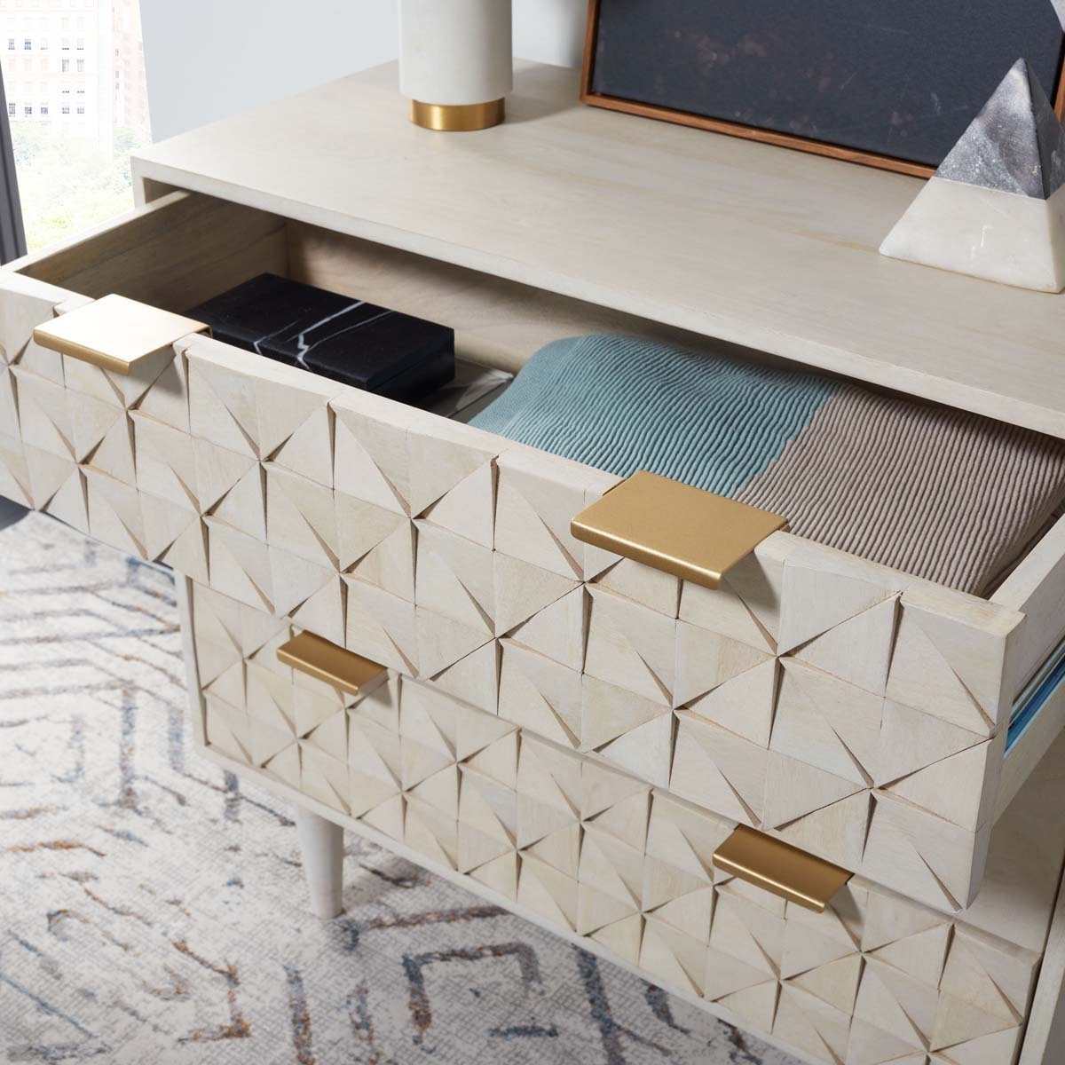 The finely carved geometric details of this Zinnia Chest give it a distinct couturier look, elevating your d??cor to new heights of style and glamour. Two of Zinnia???s three ample drawers feature artfully faceted sculptured accents, beautifully highlighted by a whitewash finish and sleek brass pulls.
