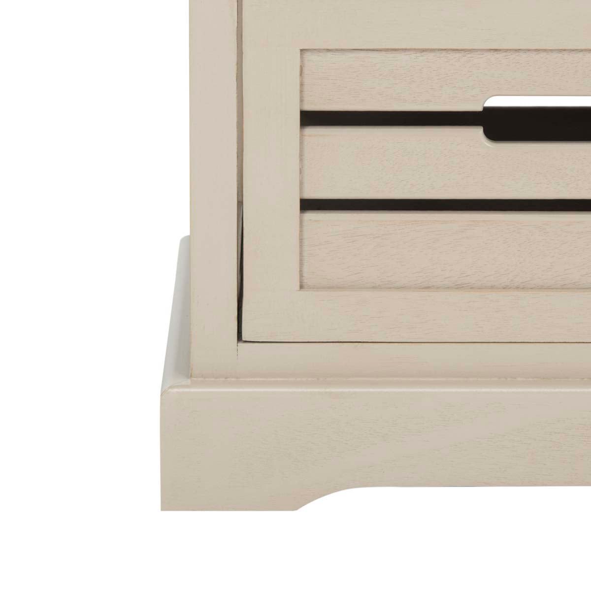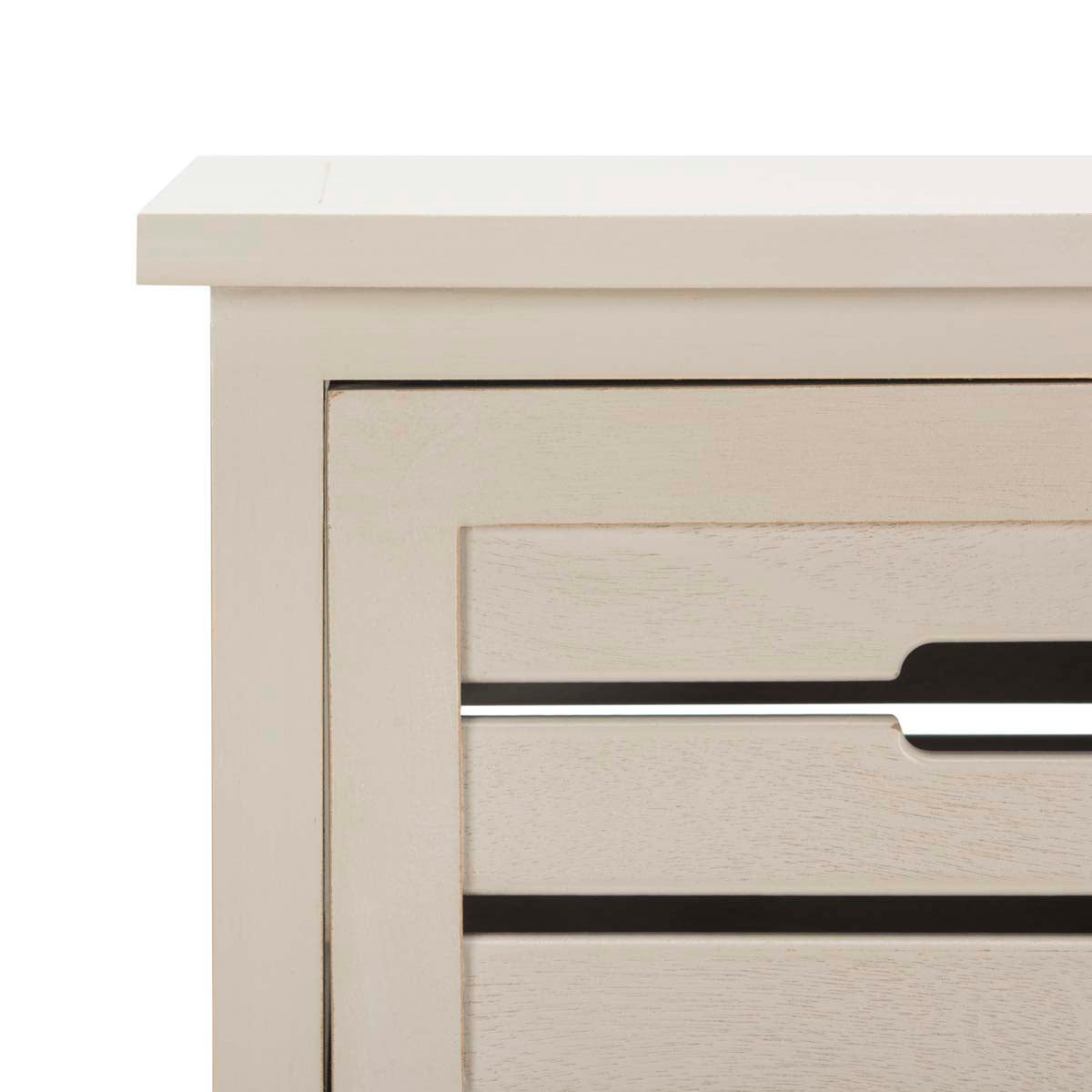 The classic lingerie chest is treated to a coastal makeover with the Sarina Cabinet. Crafted of pine in a distressed cream finish, the British Colonial frame is updated with open handles on its five slatted drawers inspired by old fashioned fruit crates.