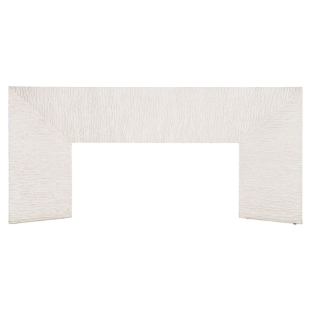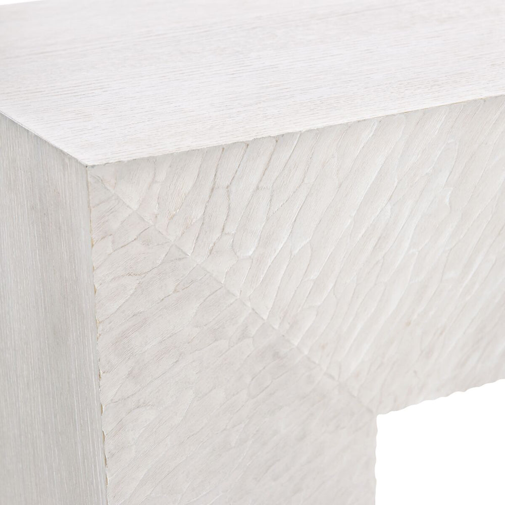 Ash solids and quartered white oak veneers Weathered Bone finish on wood veneered top and ends and on cast chiseled pattern front and back of console table. Adjustable glides Anti-tip kit