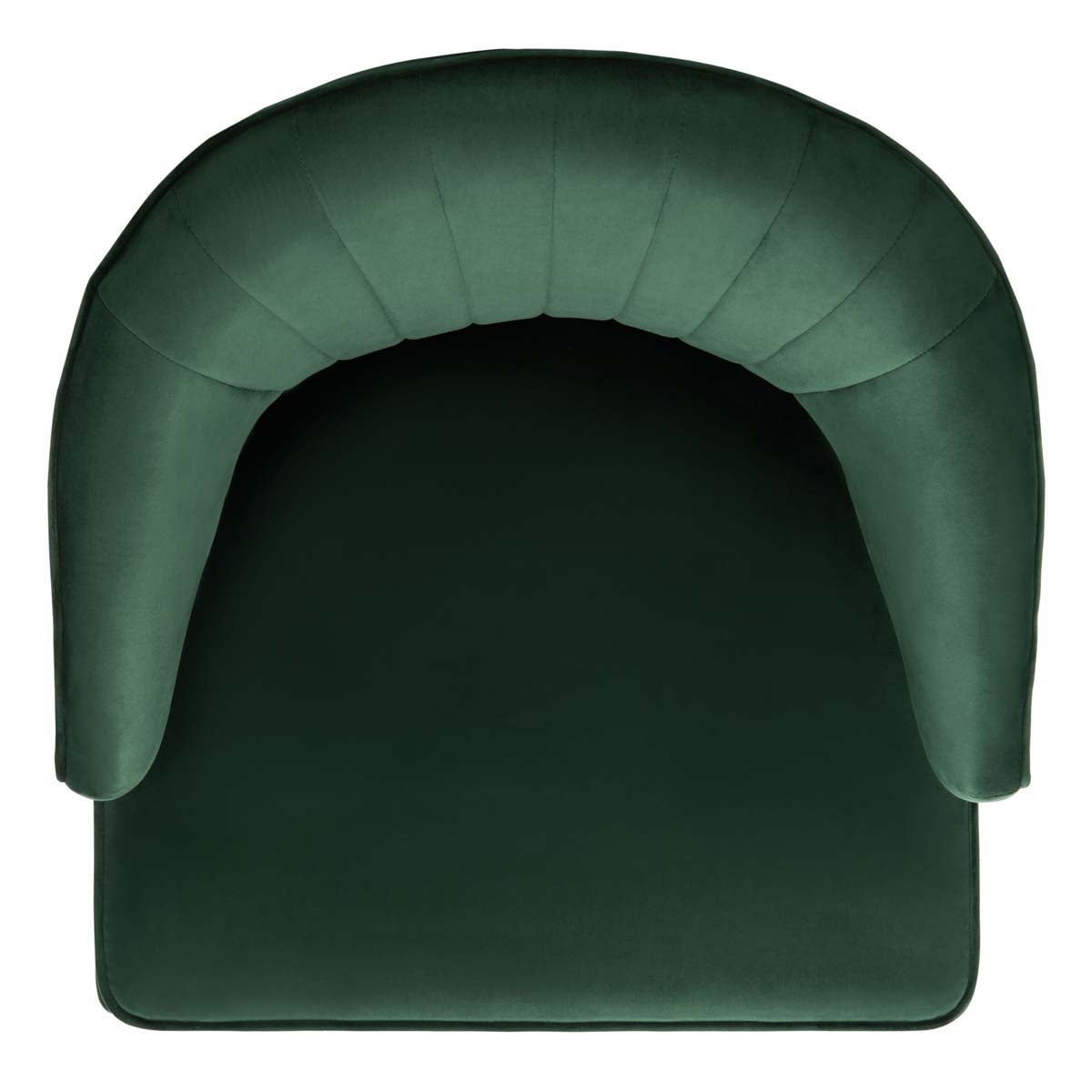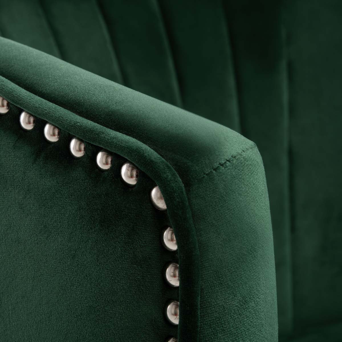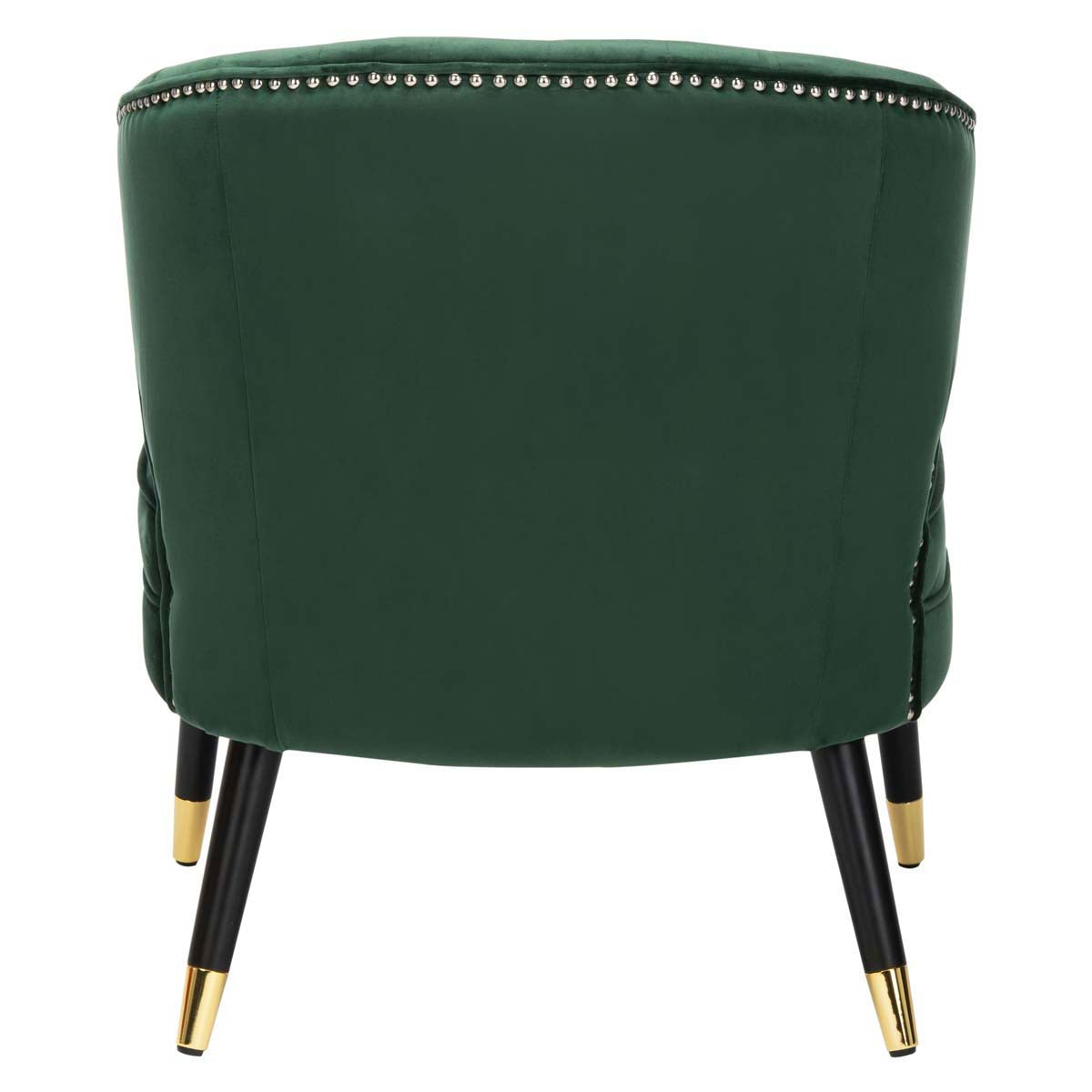 Curl up and unwind in this retro style wingback accent chair. Inspired by vintage designs, its plush forest green velvet upholstery with luxurious channeling is an instant invitation to relax. Chic caps on its black wood legs complete its retro look.