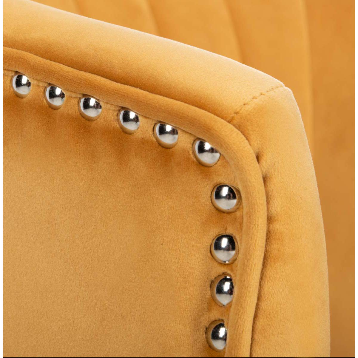 Curl up and unwind in this retro style wingback accent chair. Inspired by vintage designs, its plush marigold velvet upholstery with luxurious channeling is an instant invitation to relax. The chic caps on its black wood legs complete its retro look.