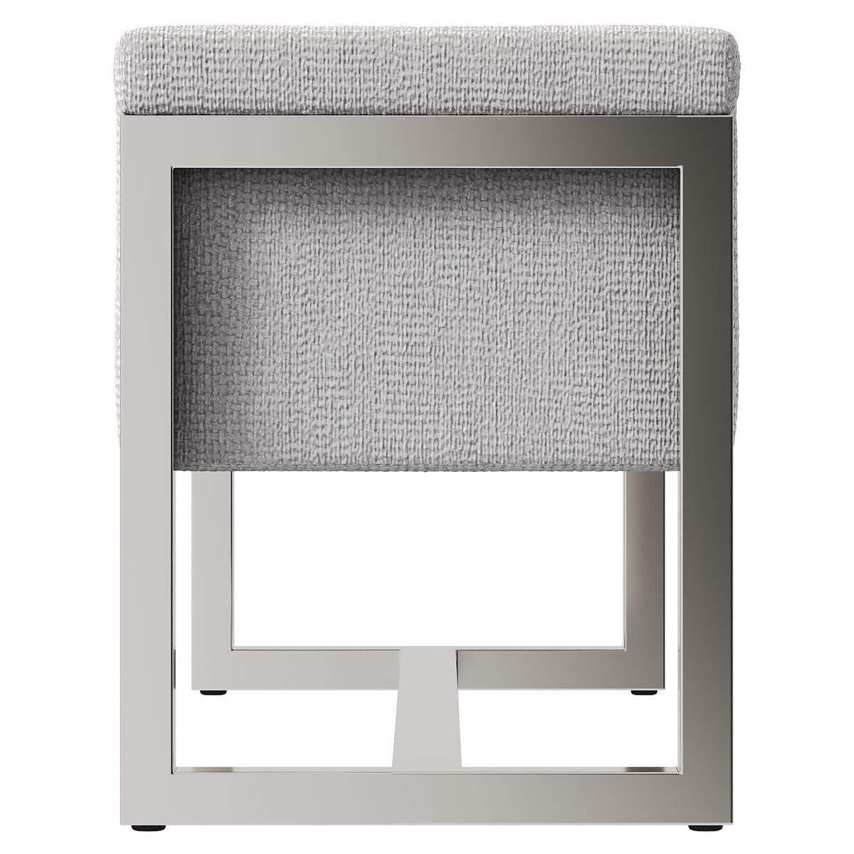 Bench With Upholstered Seat And Arms. Open Polished Nickel End Frame Panels With Center Stretcher From End To End. Adjustable Glides.
