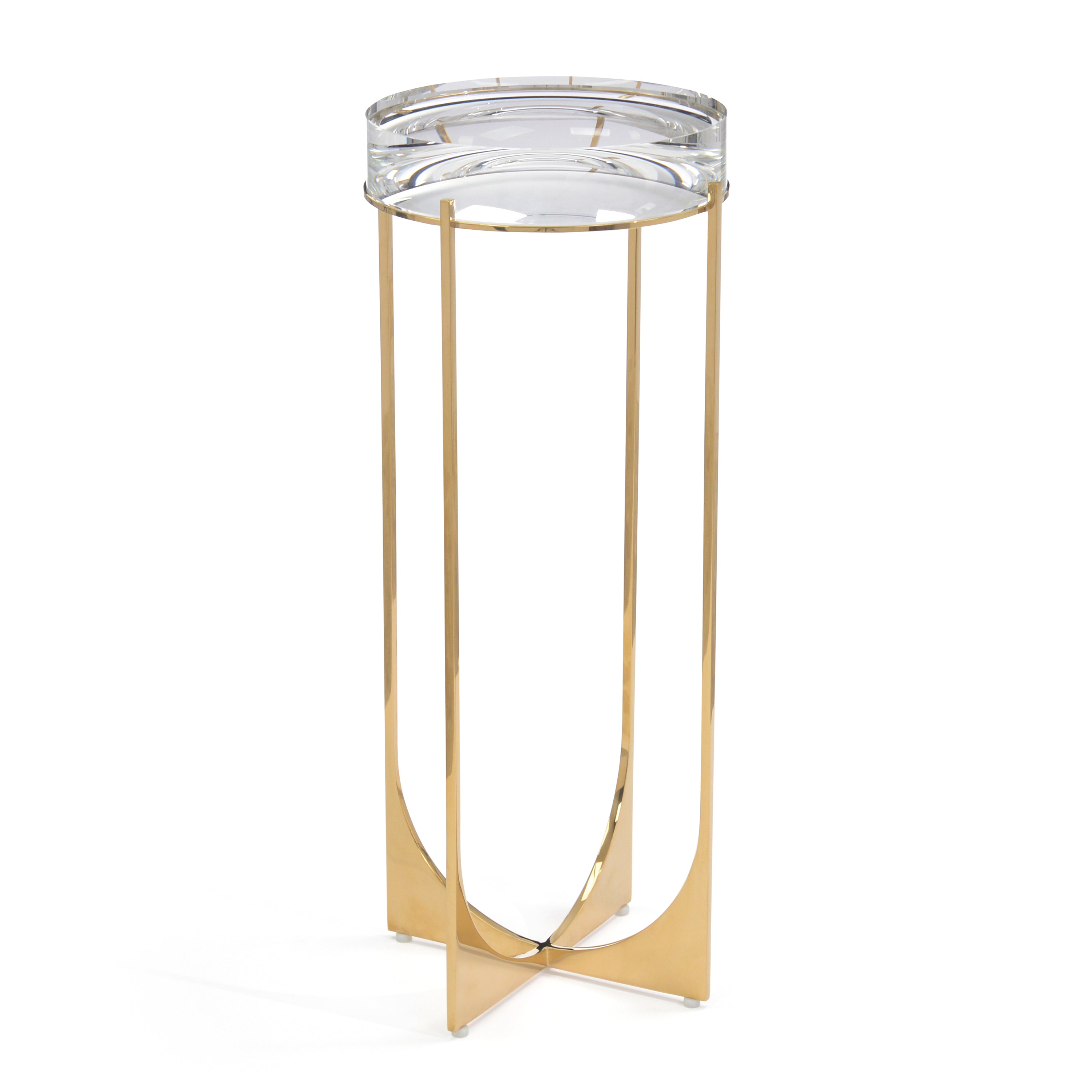 The Svelte Martini Table is an exquisite accent piece characterized by a lithe profile and striking interplay between slender lines and delicate curves. A stainless steel frame is imbued with a Polished Brass finish and supports a stunning, circular surface of clear crystal. This beautiful accent table looks wonderful by itself, but is further enhanced when placed alongside its shorter variant.