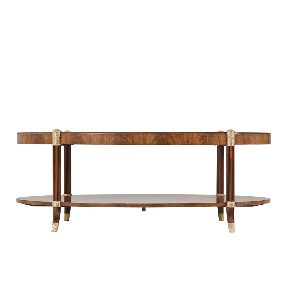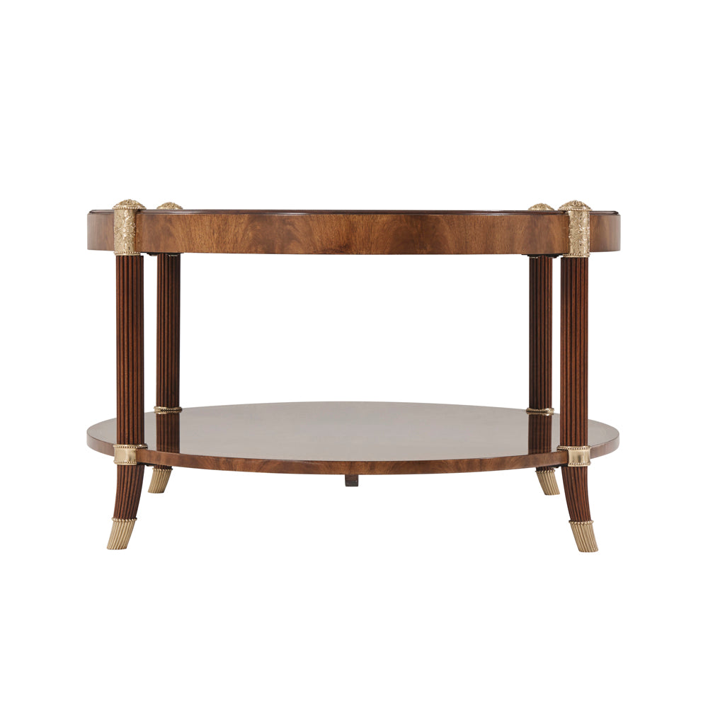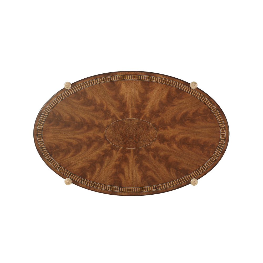 A flame Cerejeira veneered and parquetry crossbanded cocktail table, the oval caddy molded top centered by an amboyna burl veneered oval, the finely cast brass capital reeded mahogany legs terminating in splayed feet with reeded brass cappings and joined by a parquetry banded undertier.