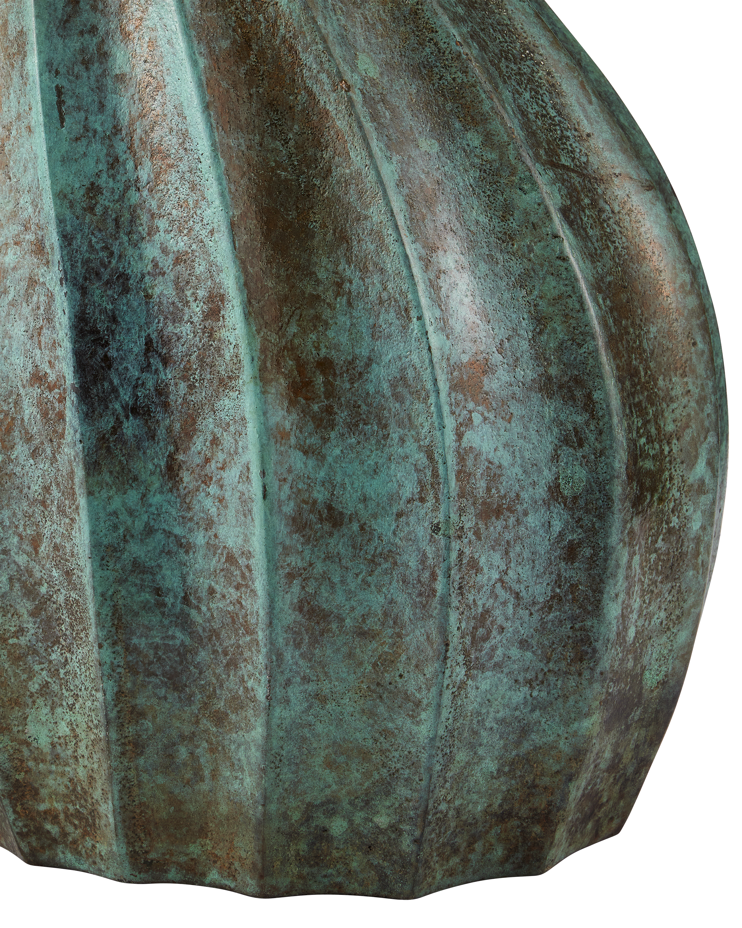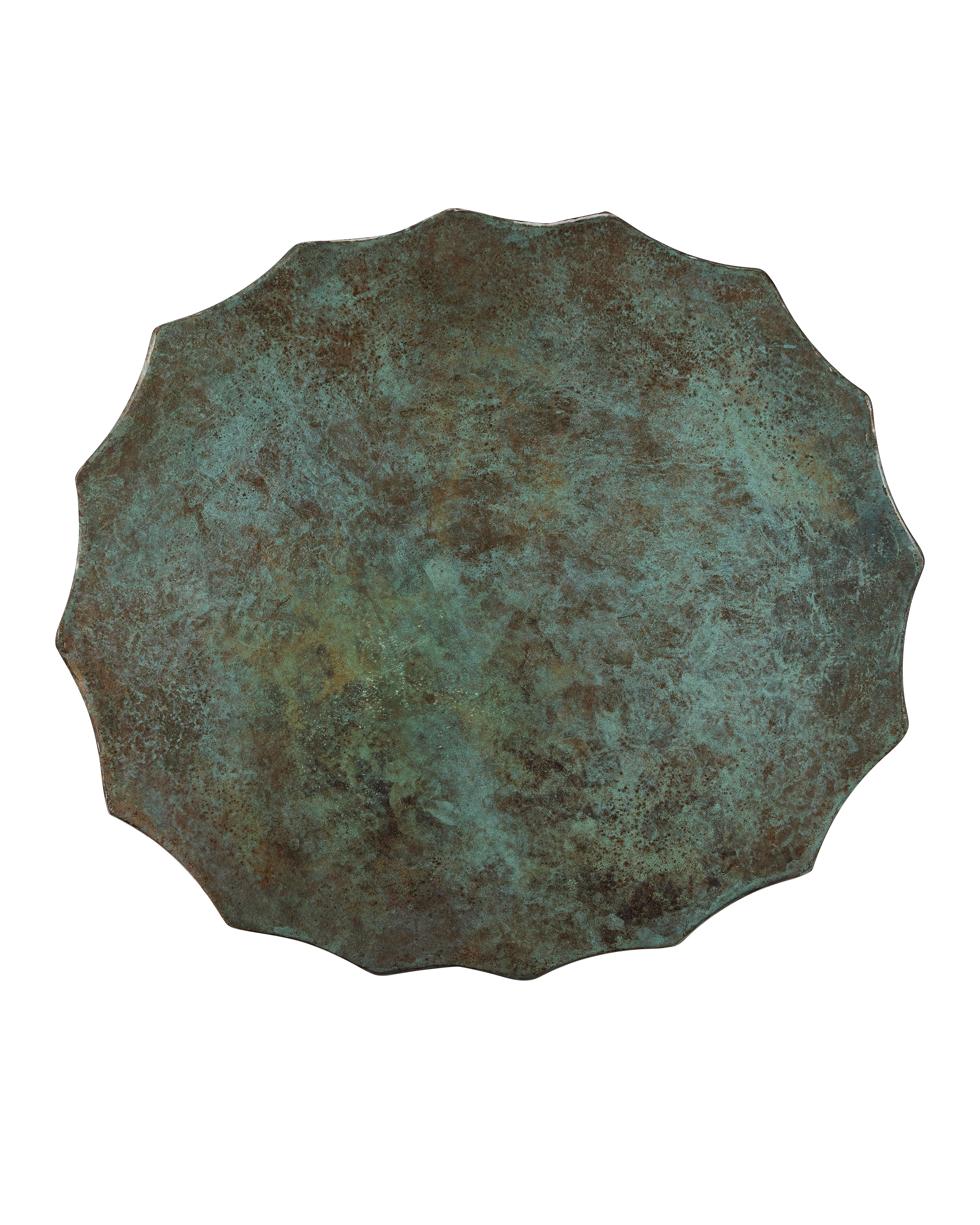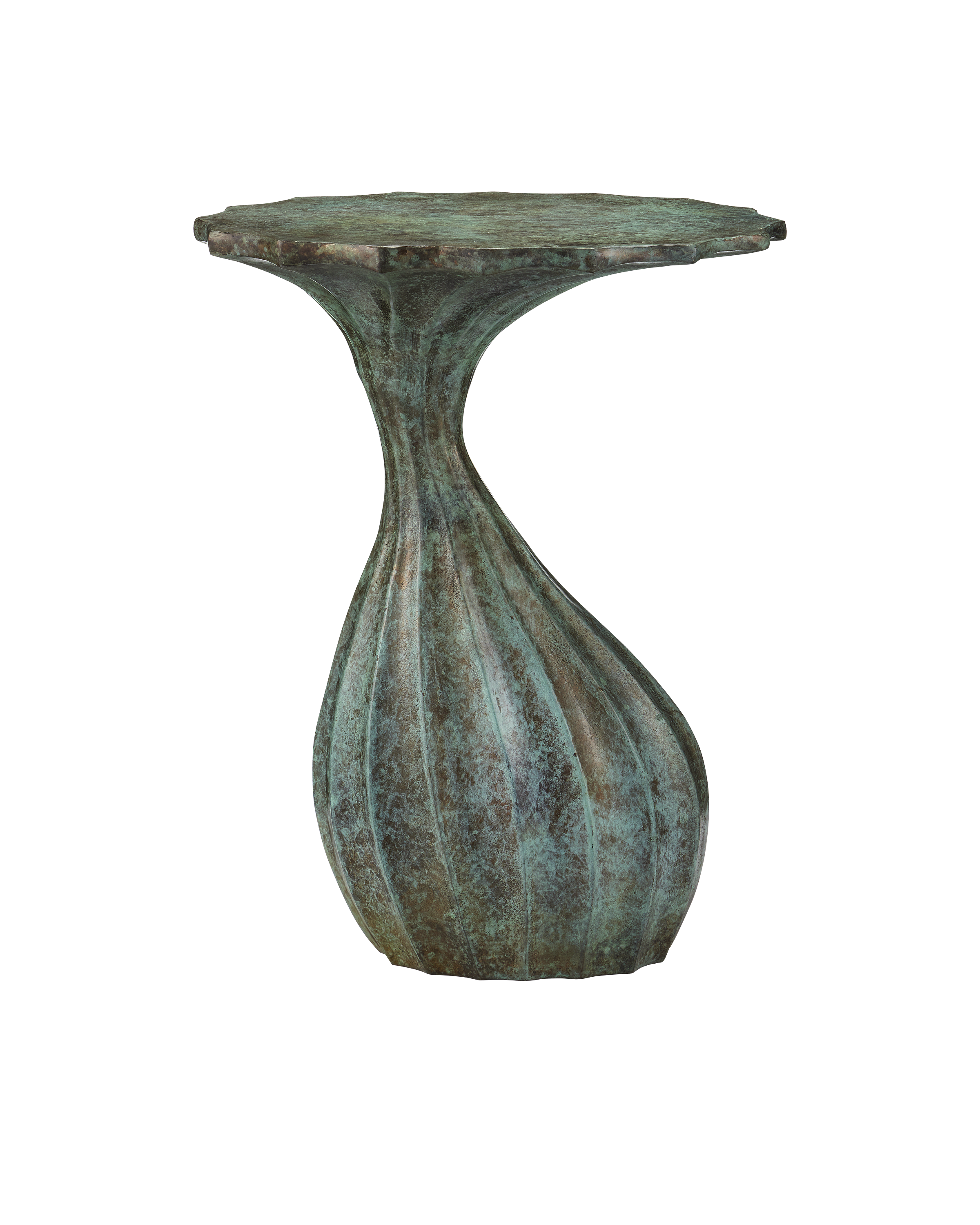 The Tunis Accent Table is made of cast aluminum in a faux verdigris finish. There is a touch of sheen on the mottled surfaces that flow around it and extend up to its top. The artisanal hand of the craftsman who makes this is evident in the strong variations in the placement of the different tones, accentuated by the peaks and valleys.