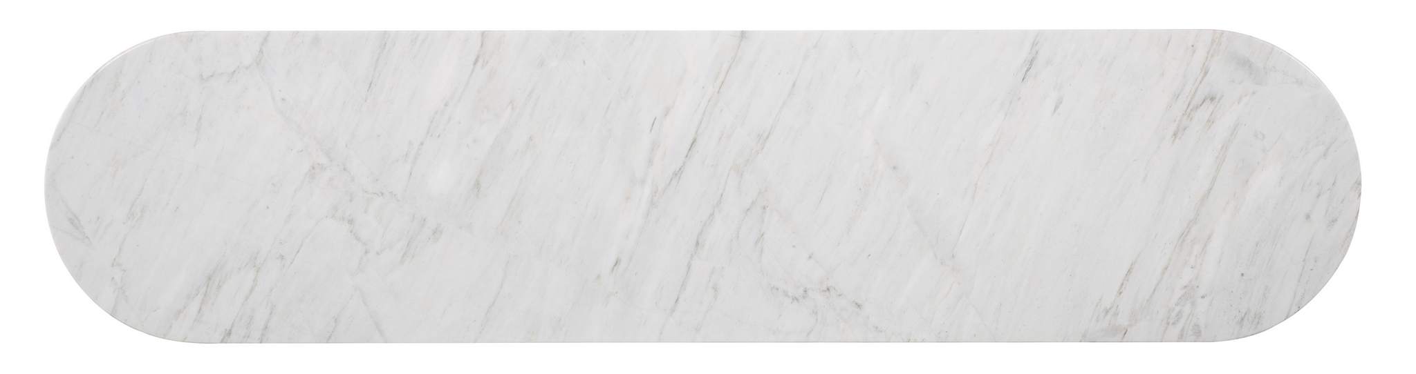 Natural luxury meets a relaxing silhouette in the Vana Console that combines a medium wood finish on Walnut Veneers with a marble top featuring warm white colors with touches of gray and soft gold veining throughout the natural stone. The narrow shape and double round pedestal legs give a timeless appeal. Measures 68 ½ inches wide by 16 ¼ inches deep.