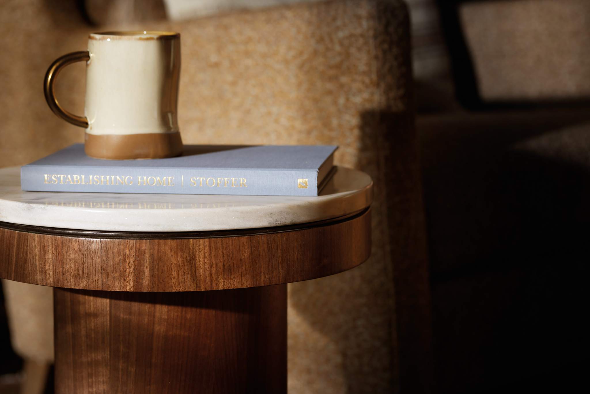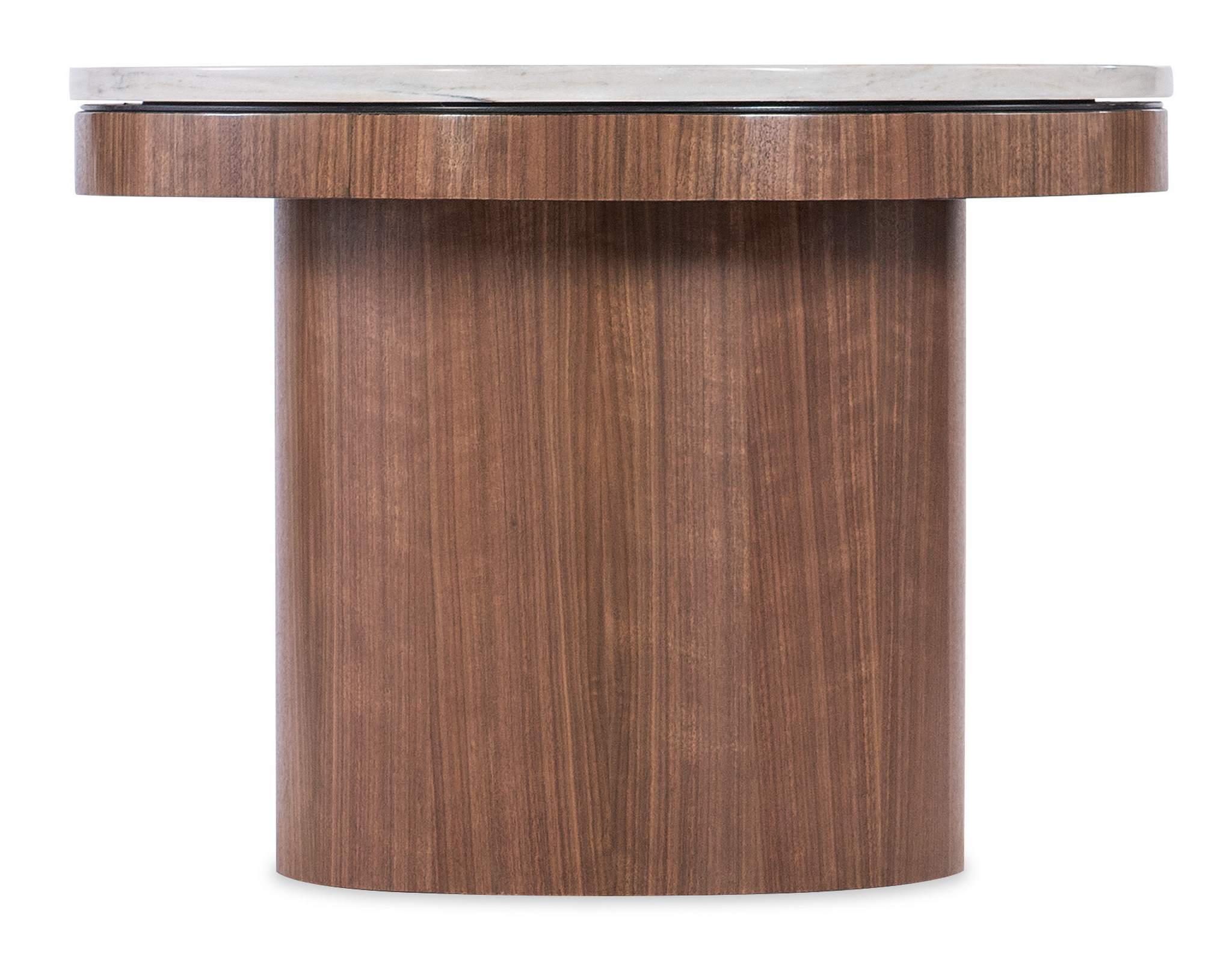 Chic and filled with character, the Vana 22-inch round drink table combines Walnut Veneers in a medium wood finish with a marble top featuring warm white colors with touches of grey and soft gold veining running throughout the natural stone. The modern profile is in a round shape with a compact footprint.