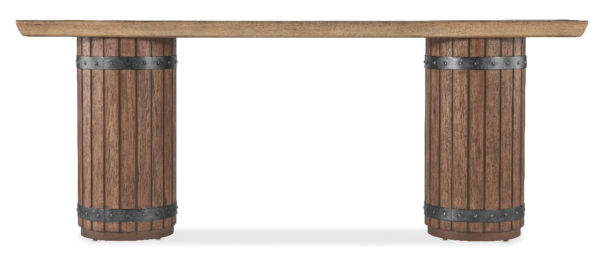 Capture the essence of the Napa Valley lifestyle with the Vineyard Row Console Table. Measuring 86 inches wide by 20 inches deep, the table has rustic wine barrel-influenced pedestal bases and hammered metal accents. Crafted of Pecky Hickory Veneers with resin, the top is finished in the light and airy Sonoma tone, and the base is in Napa, a darker tone inspired by the red wines of the Napa Valley
