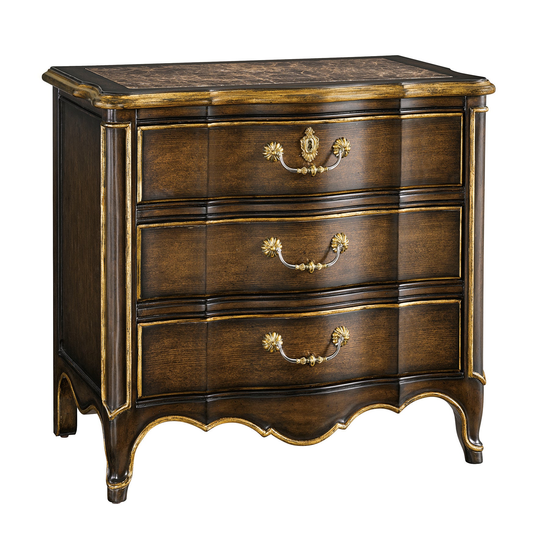 Mahogany Wood wrapped in Mahogany and White Ash veneer is finished in Aria with a Polished Madeira marble top. Trimmed in Aged Gold, three functioning drawers are opened using a delicate combination of Polished Brass and Polished Nickel hardware.