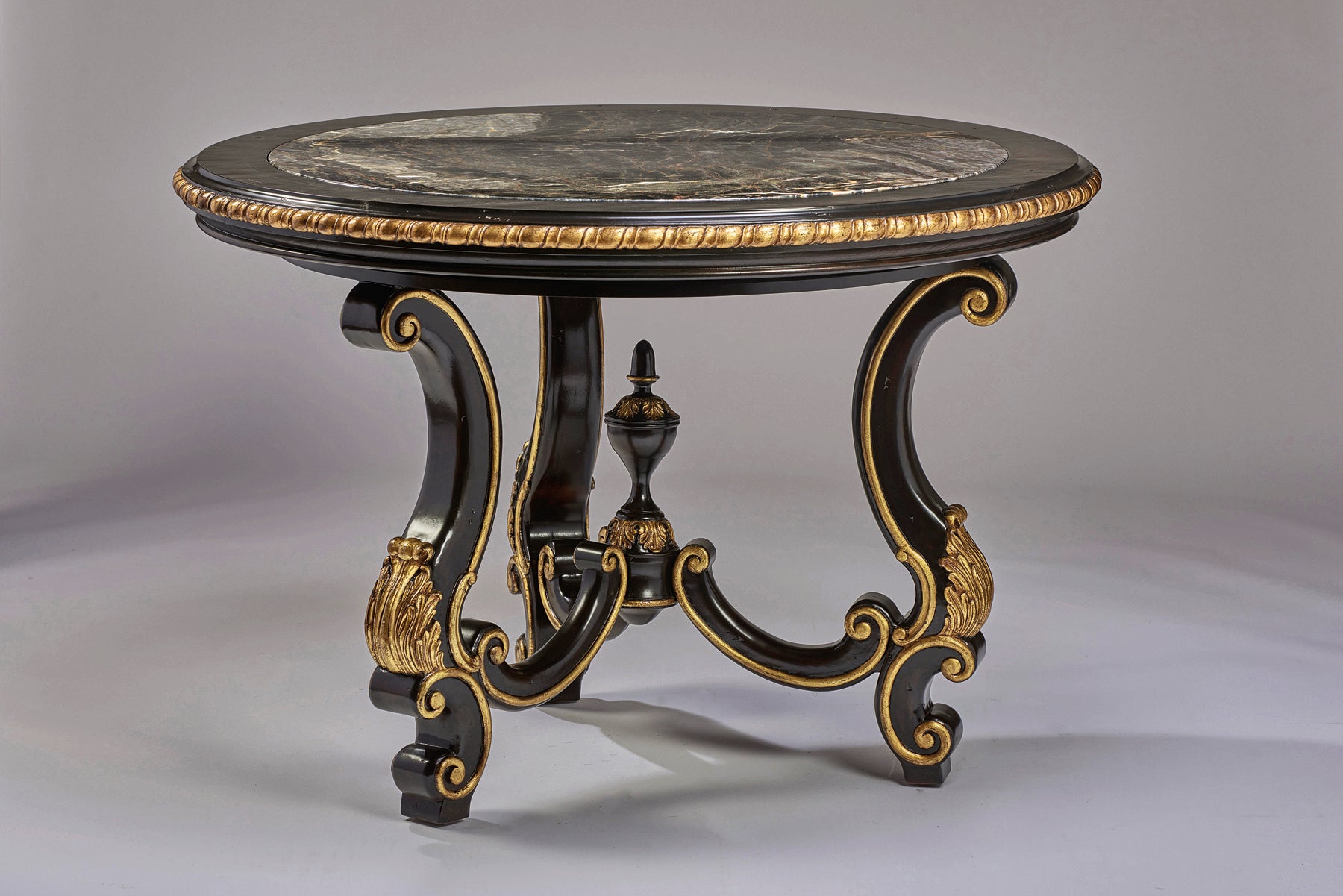 This ornate Mahogany center table shines in Crotch Walnut Veneer and Bombay finish. Hand-carved details and flourish are finished in Venetian Gold. Polished Michelangelo Marble top.