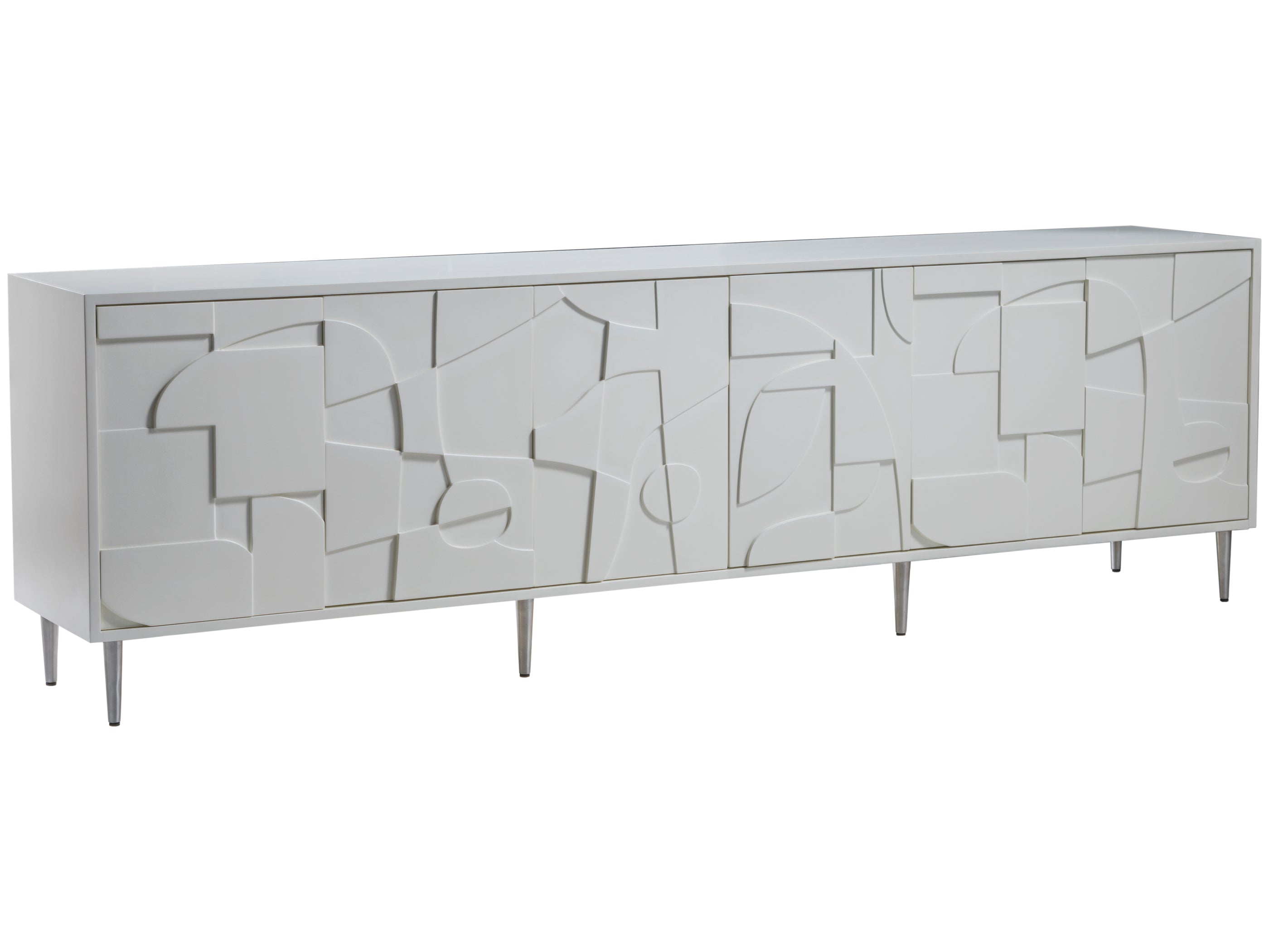 Long credenza featuring cast door fronts in a single Post-Modern abstract relief carving spanning the entire face, creating dramatic dimensionality. Evenly finished in a nearly matte soft white with a hint of ivory and featuring tapered stainless steel legs and touch hardware doors. The six doors and six shelves are presented as two adjustable or removable shelves behind each pair of doors, with porting for media and wire management. Six cast door fronts in a soft matte white paint, stainless steel tapered legs, 6 adjustable shelves, ventilated back, cord management. , SIGNATURE DESIGNS ,