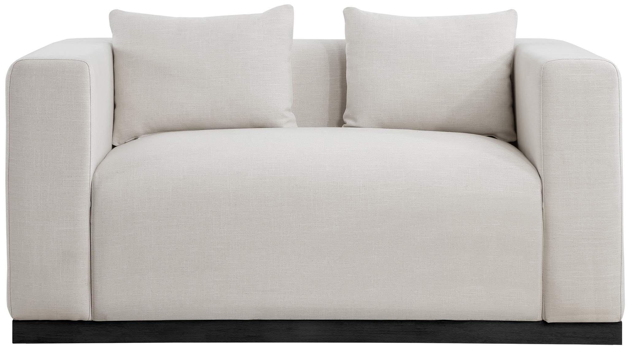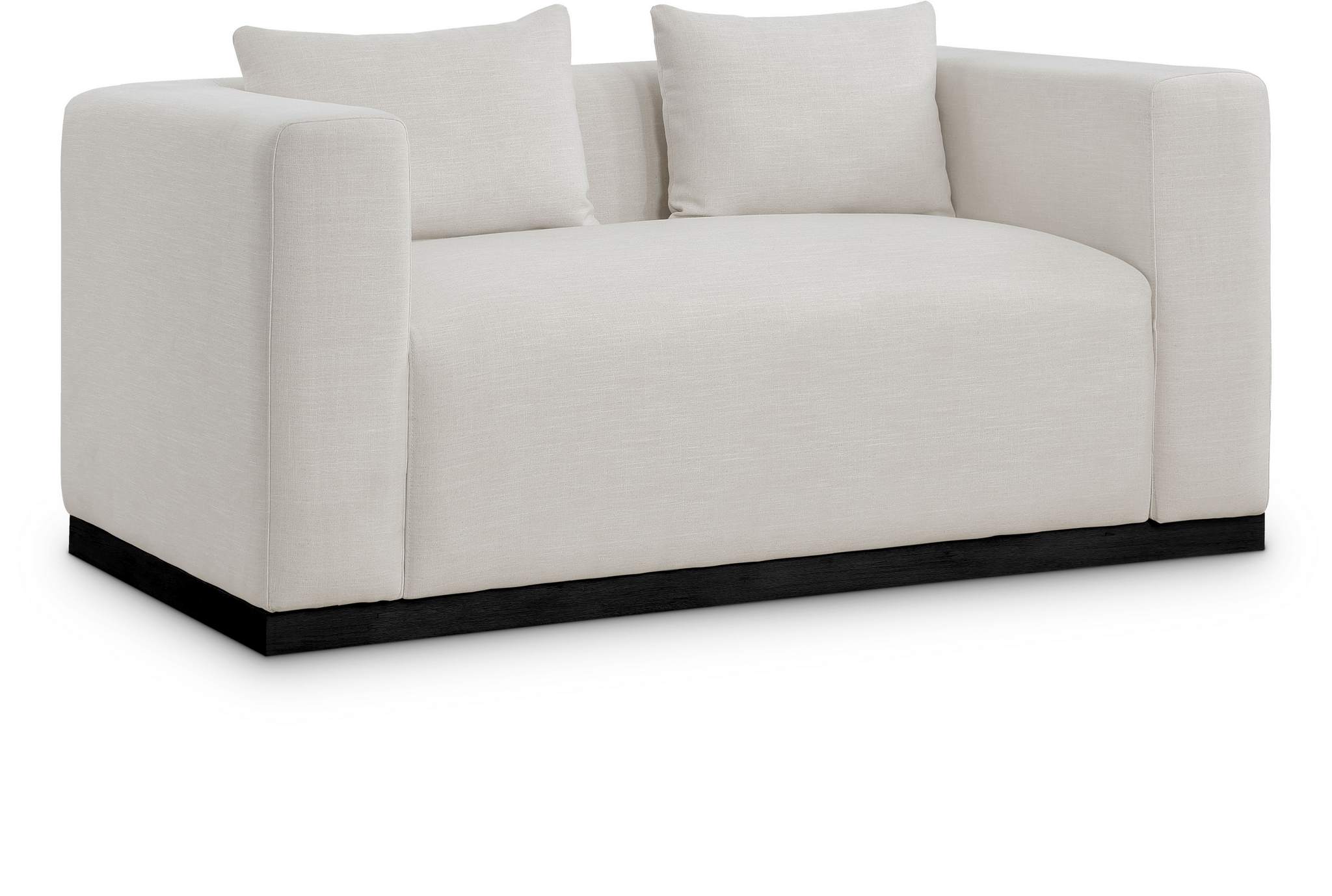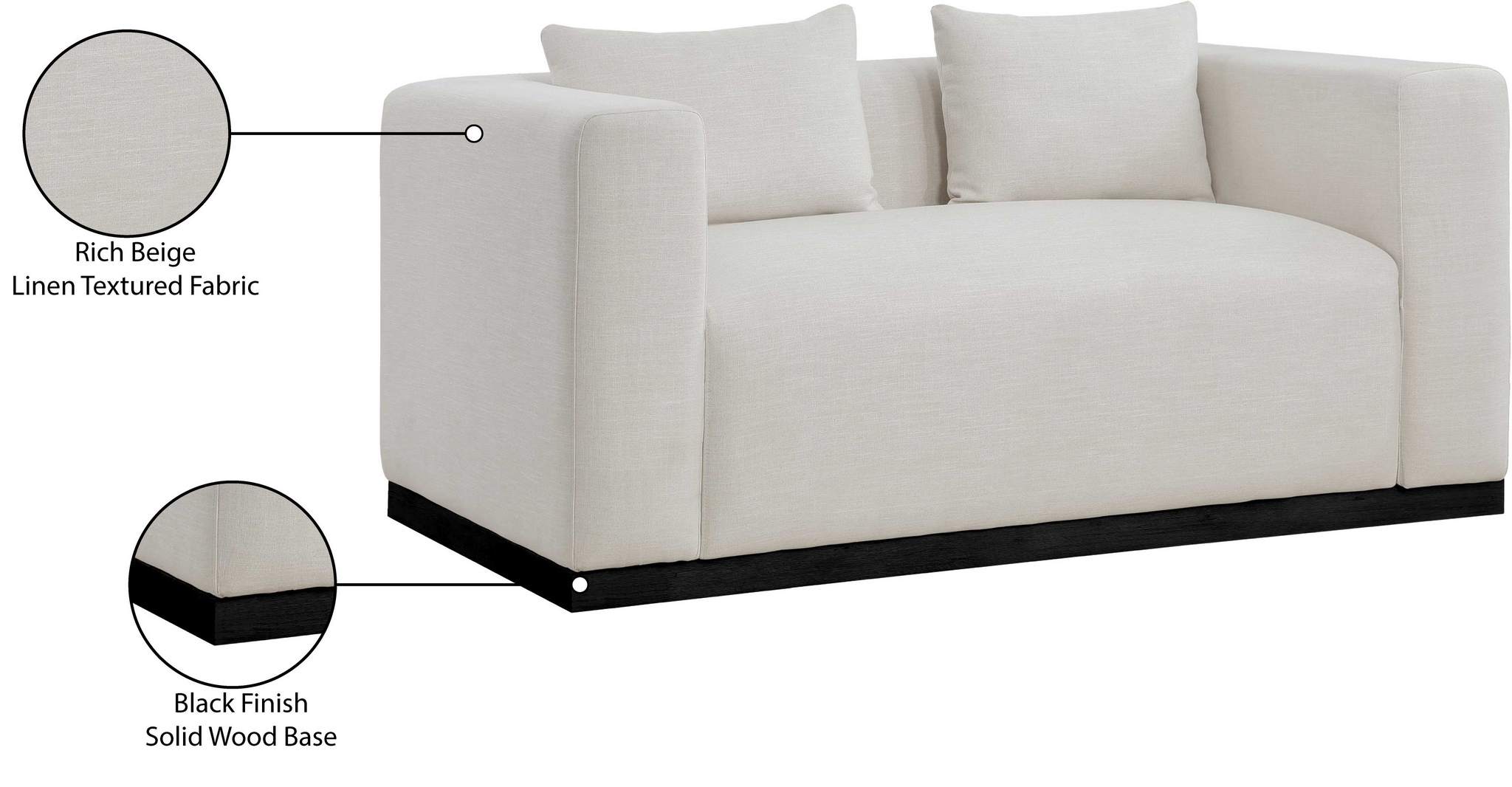 Make this Alfie linen textured fabric living room loveseat the center a cozy reading nook. This overstuffed chair is stunning from angles, with its contemporary design elements and chic rich beige color. Plumply stuffed with fluffy fill to create the ultimate space for snuggling up with your favorite reading material or while binging on the latest TV program. The loveseat rests on a black finish solid wood base for stability and added contrast with its beige upholstery.
