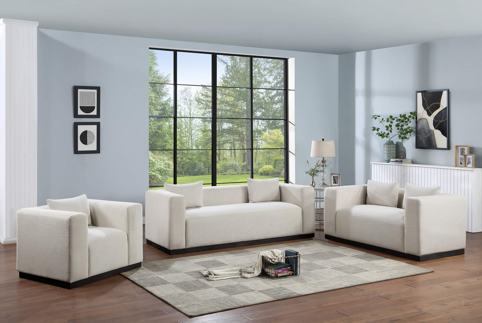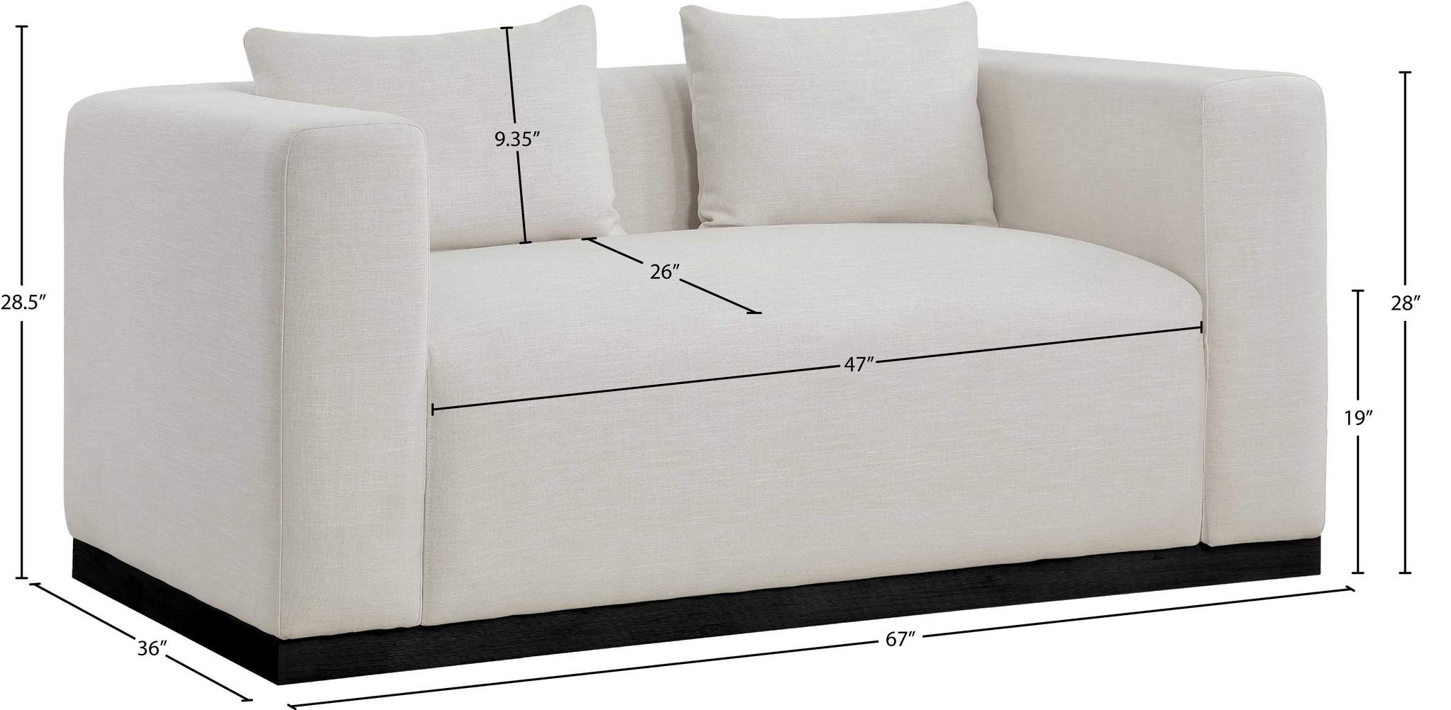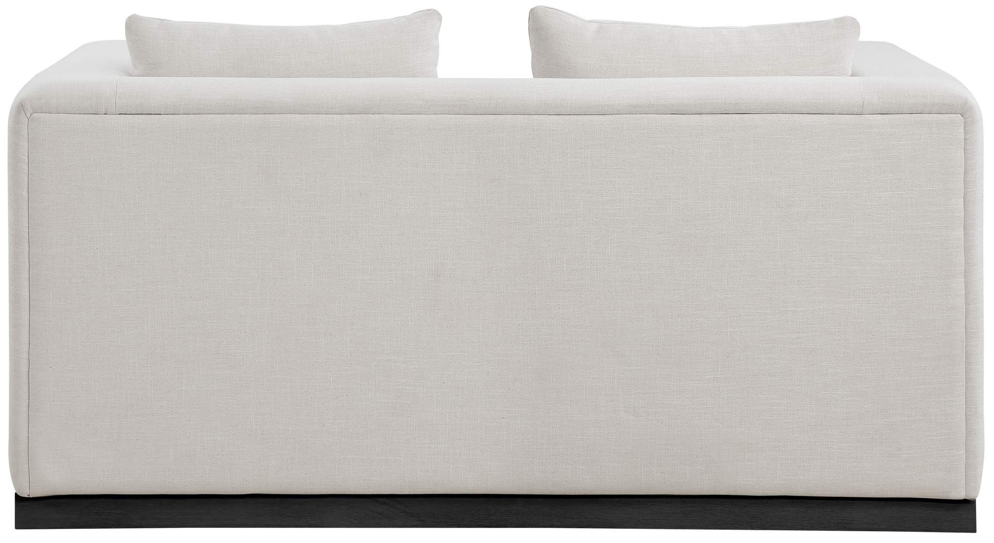 Make this Alfie linen textured fabric living room loveseat the center a cozy reading nook. This overstuffed chair is stunning from angles, with its contemporary design elements and chic rich beige color. Plumply stuffed with fluffy fill to create the ultimate space for snuggling up with your favorite reading material or while binging on the latest TV program. The loveseat rests on a black finish solid wood base for stability and added contrast with its beige upholstery.