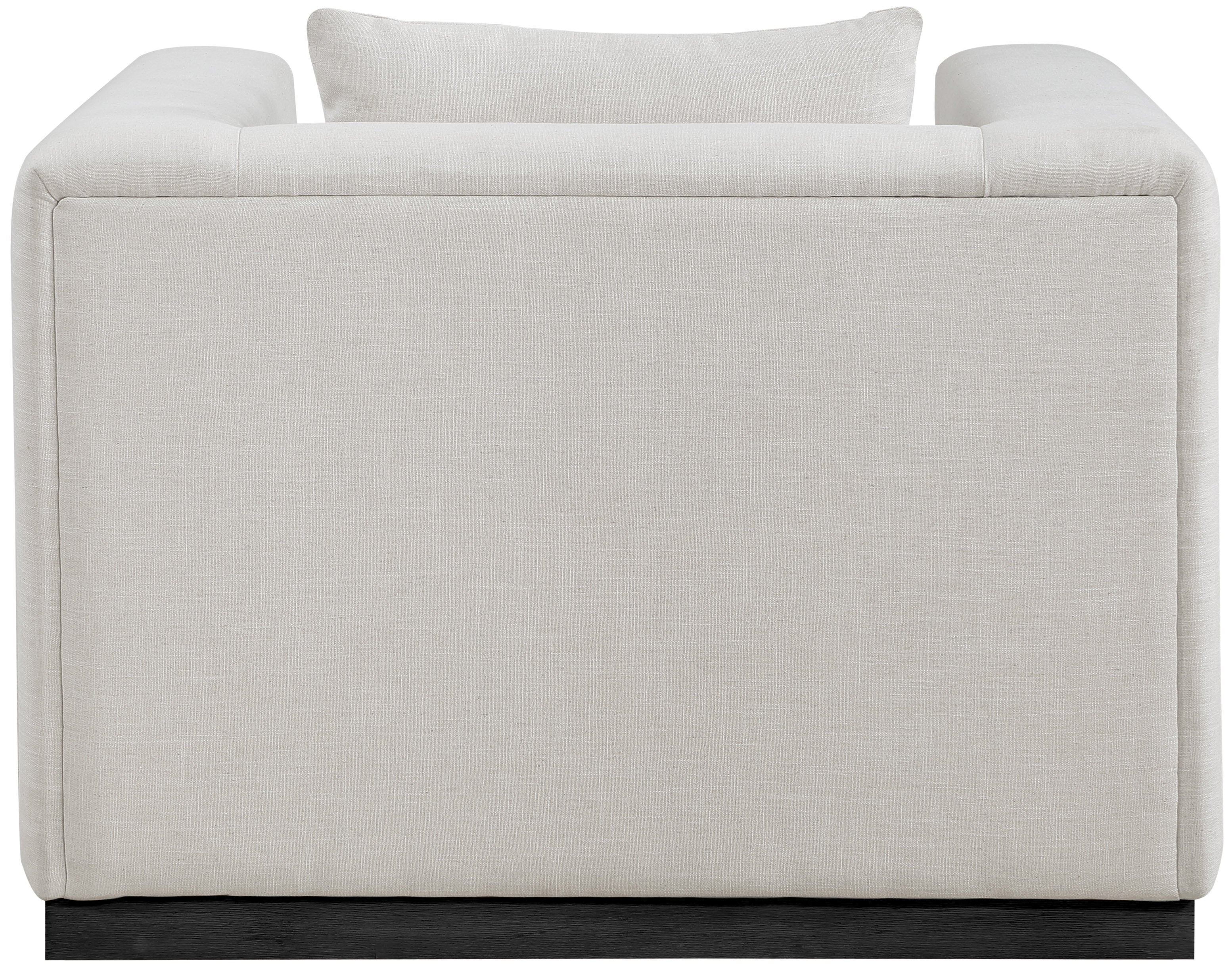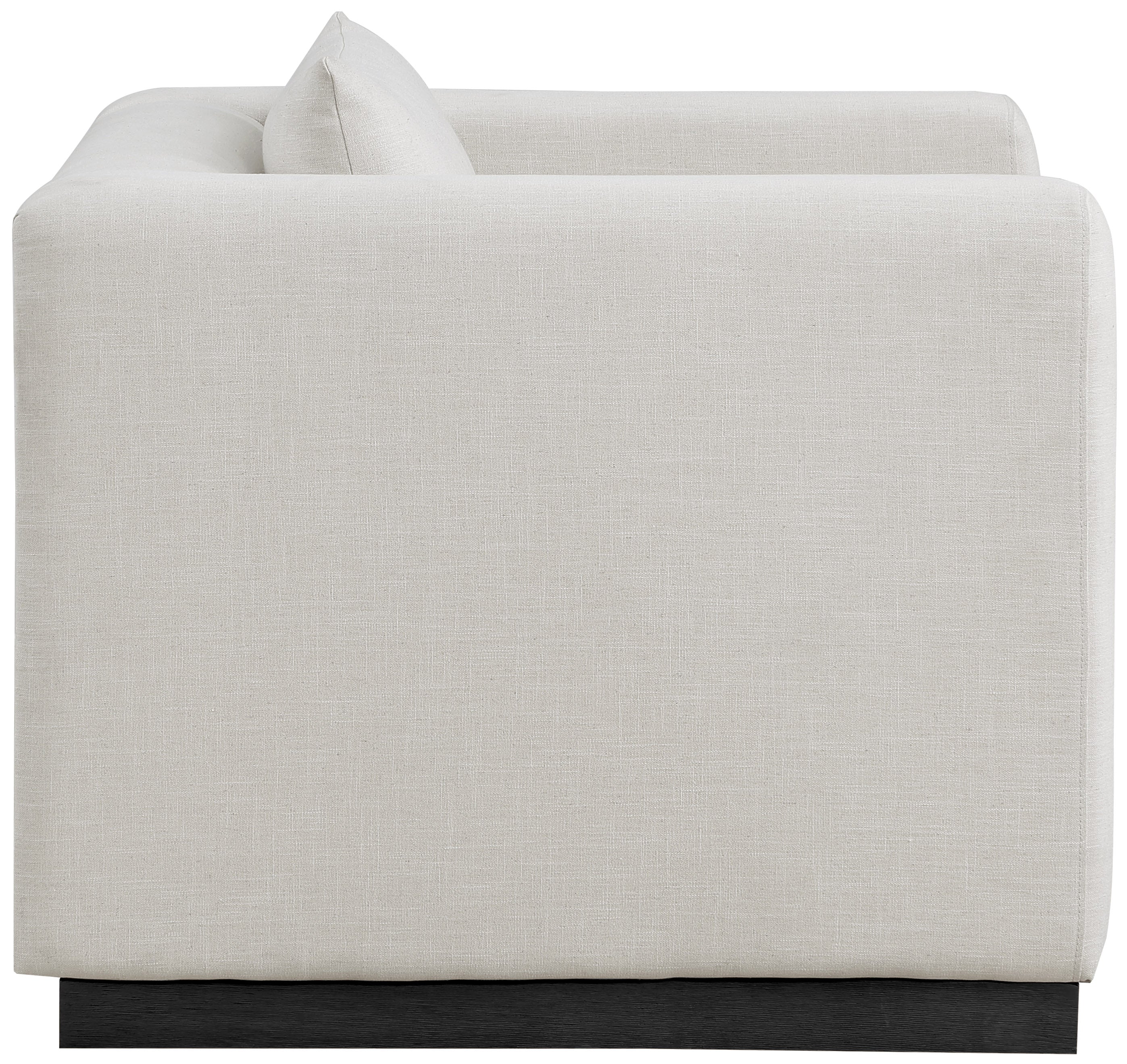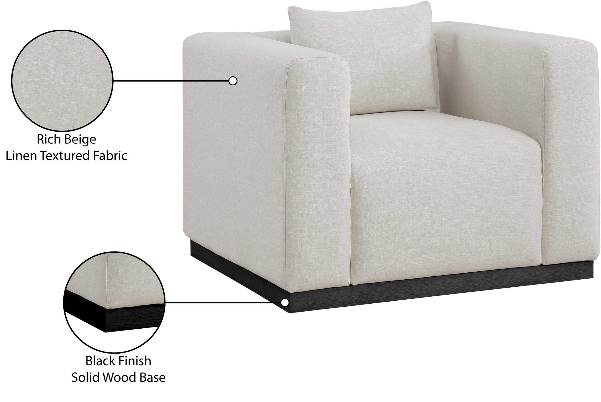 Make this Alfie linen textured fabric living room chair the center a cozy reading nook. This overstuffed chair is stunning from angles, with its contemporary design elements and chic rich beige color. Plumply stuffed with fluffy fill to create the ultimate space for snuggling up with your favorite reading material or while binging on the latest TV program. The chair rests on a black finish solid wood base for stability and added contrast with its beige upholstery.