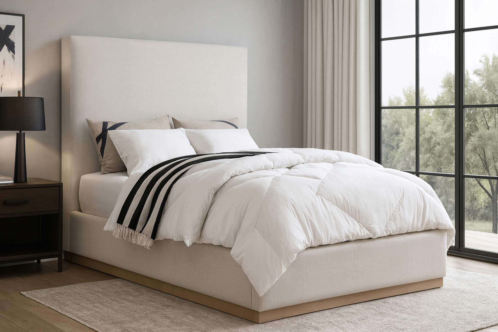 Give your bedroom a regal vibe when you add this Alfie linen textured fabric bed to the mix. The ultra tall headboard on this king-size bed makes a bold impression from all angles and is covered in rich cream linen textured fabric that forms a pleasant contrast with the black finish solid wood base. The full flat design lets you easily use this bed without a box spring - a top mattress is all that's needed.