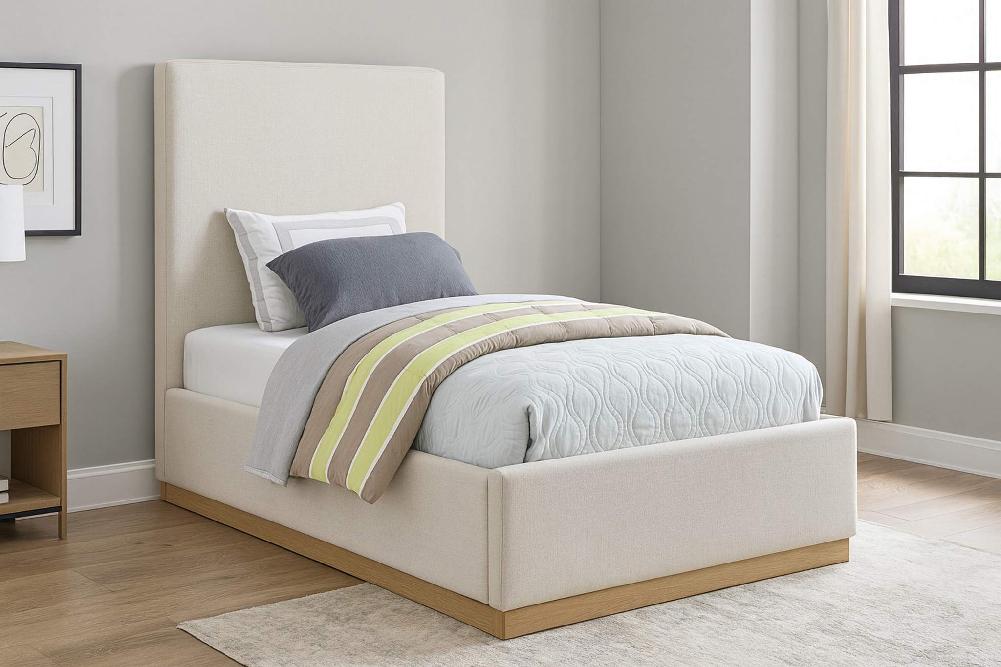 Give your bedroom a regal vibe when you add this Alfie linen textured fabric bed to the mix. The ultra tall headboard on this twin-size bed makes a bold impression from all angles and is covered in rich cream linen textured fabric that forms a pleasant contrast with the black finish solid wood base. The full flat design lets you easily use this bed without a box spring - a top mattress is all that's needed.