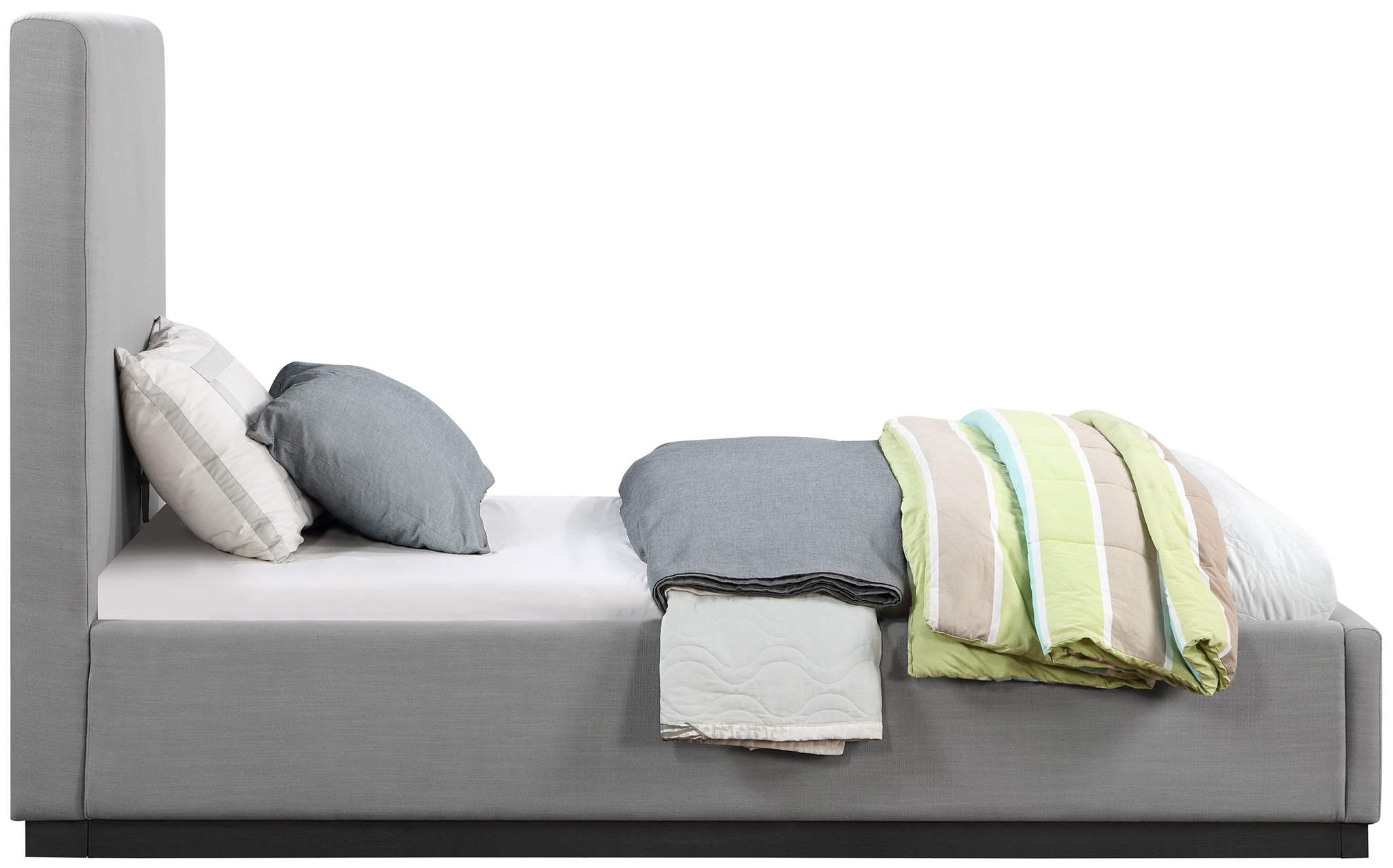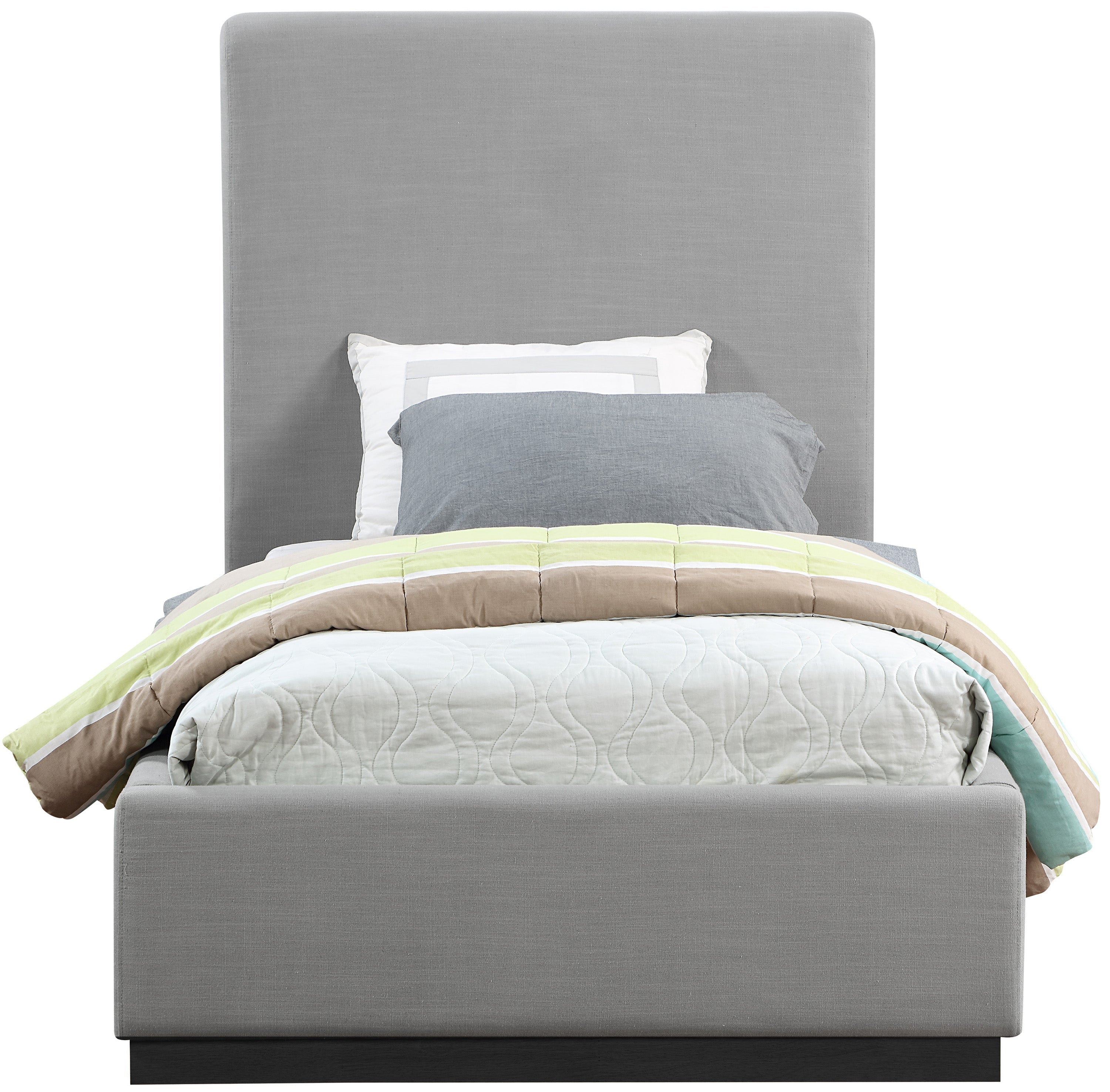 Give your bedroom a regal vibe when you add this Alfie linen textured fabric bed to the mix. The ultra tall headboard on this twin-size bed makes a bold impression from all angles and is covered in rich grey linen textured fabric that forms a pleasant contrast with the black finish solid wood base. The full flat design lets you easily use this bed without a box spring - a top mattress is all that's needed.