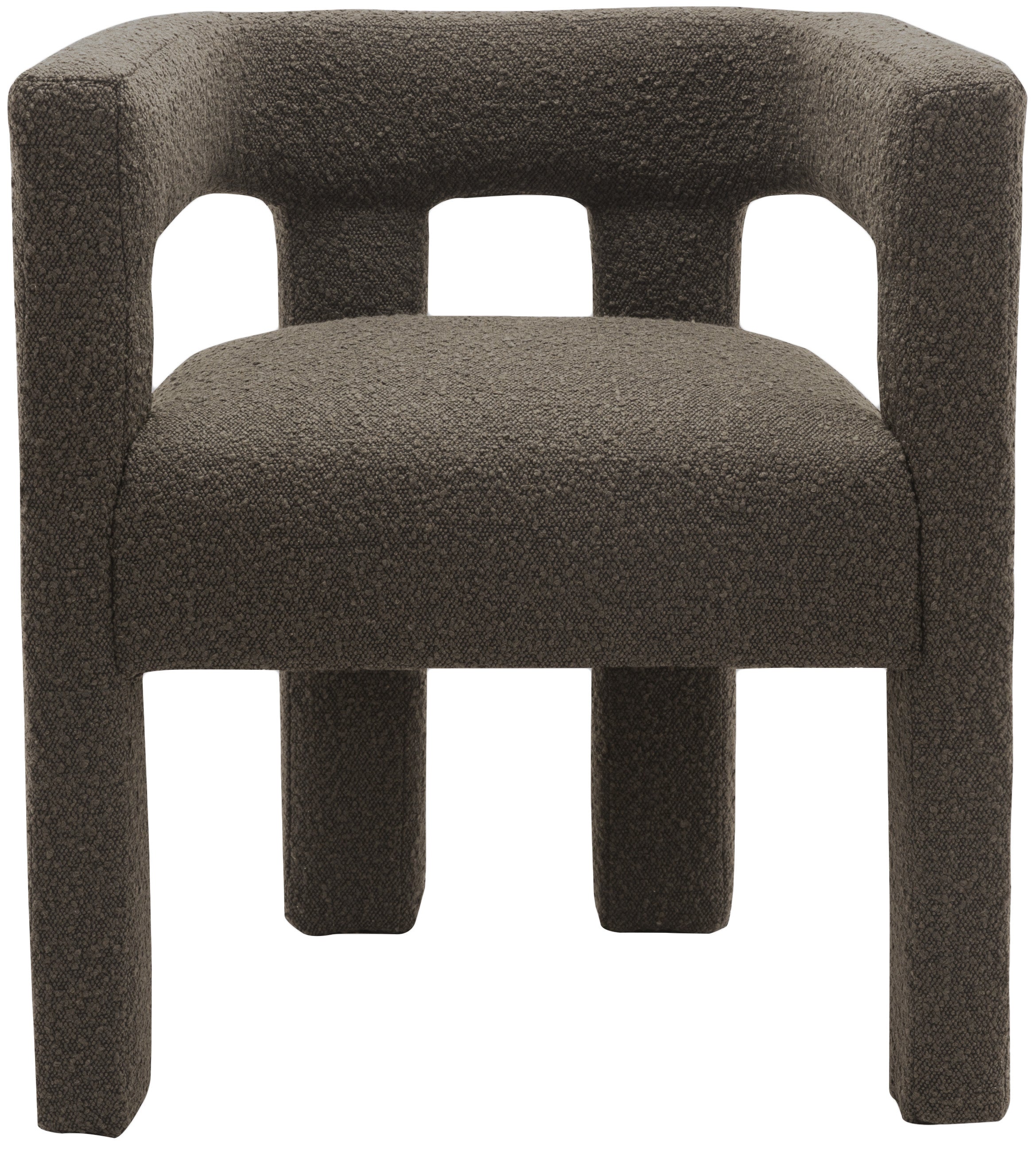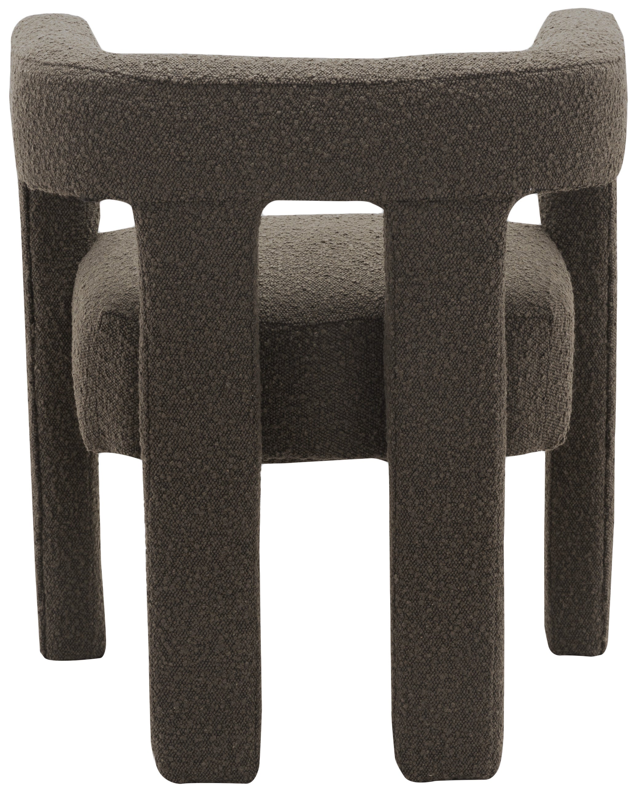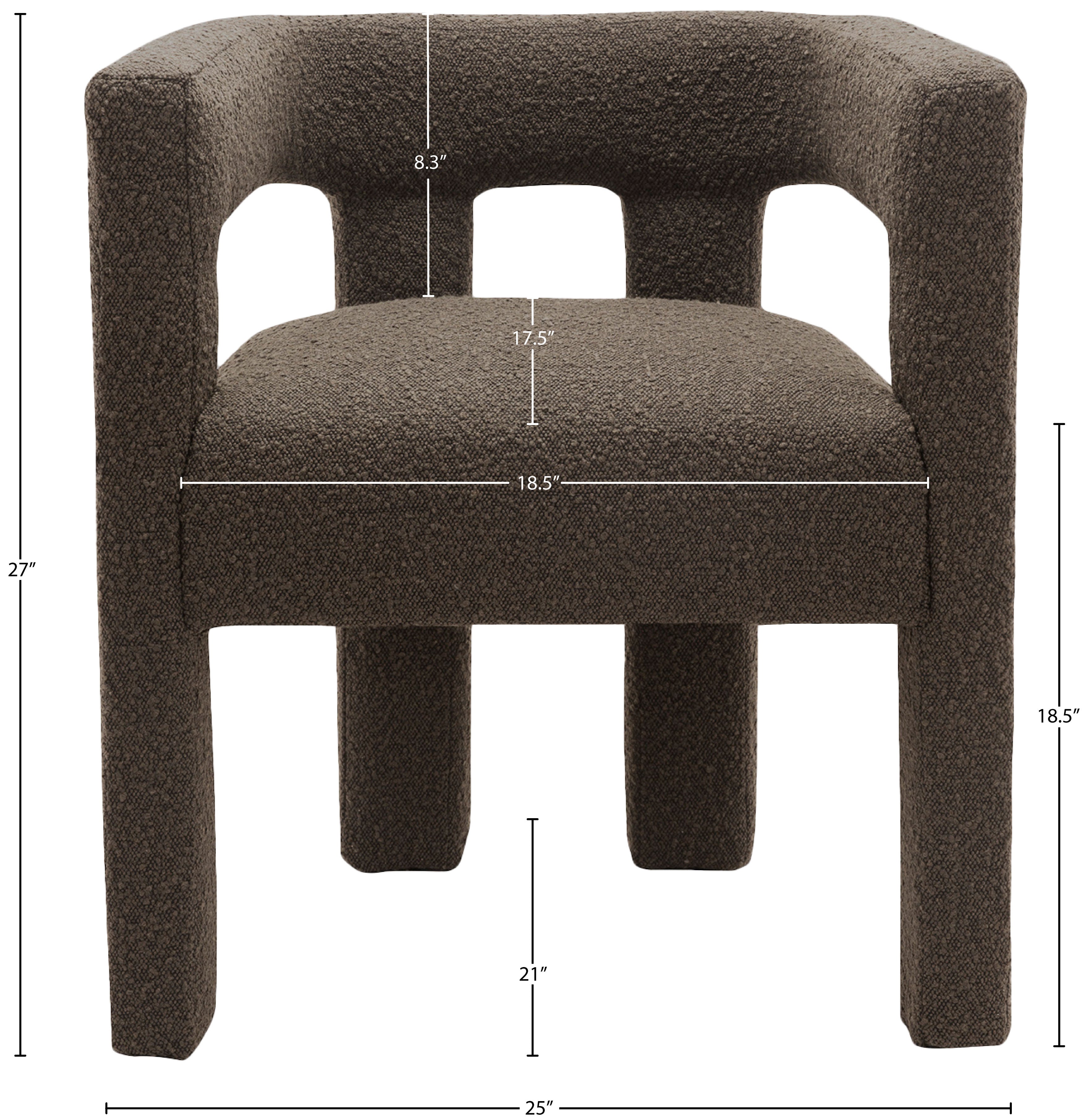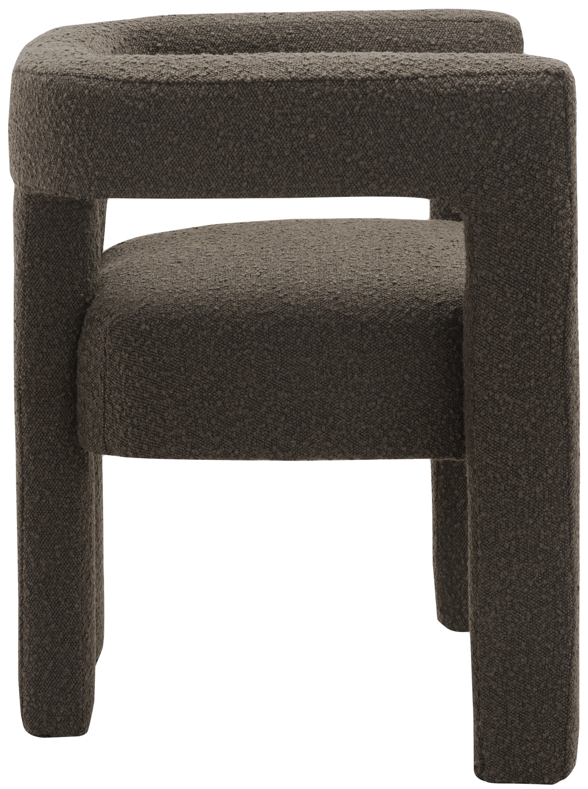 Get comfortable with this Athena dining chair featuring minimalistic design elements and a simple footprint. Artfully designed, this dining chair is made for comfort with a rounded footprint that hugs your back while you sit and relax with friends. The chair is covered top to bottom in rich brown boucle fabric, so it's super soft to the touch and elegant to the eye.