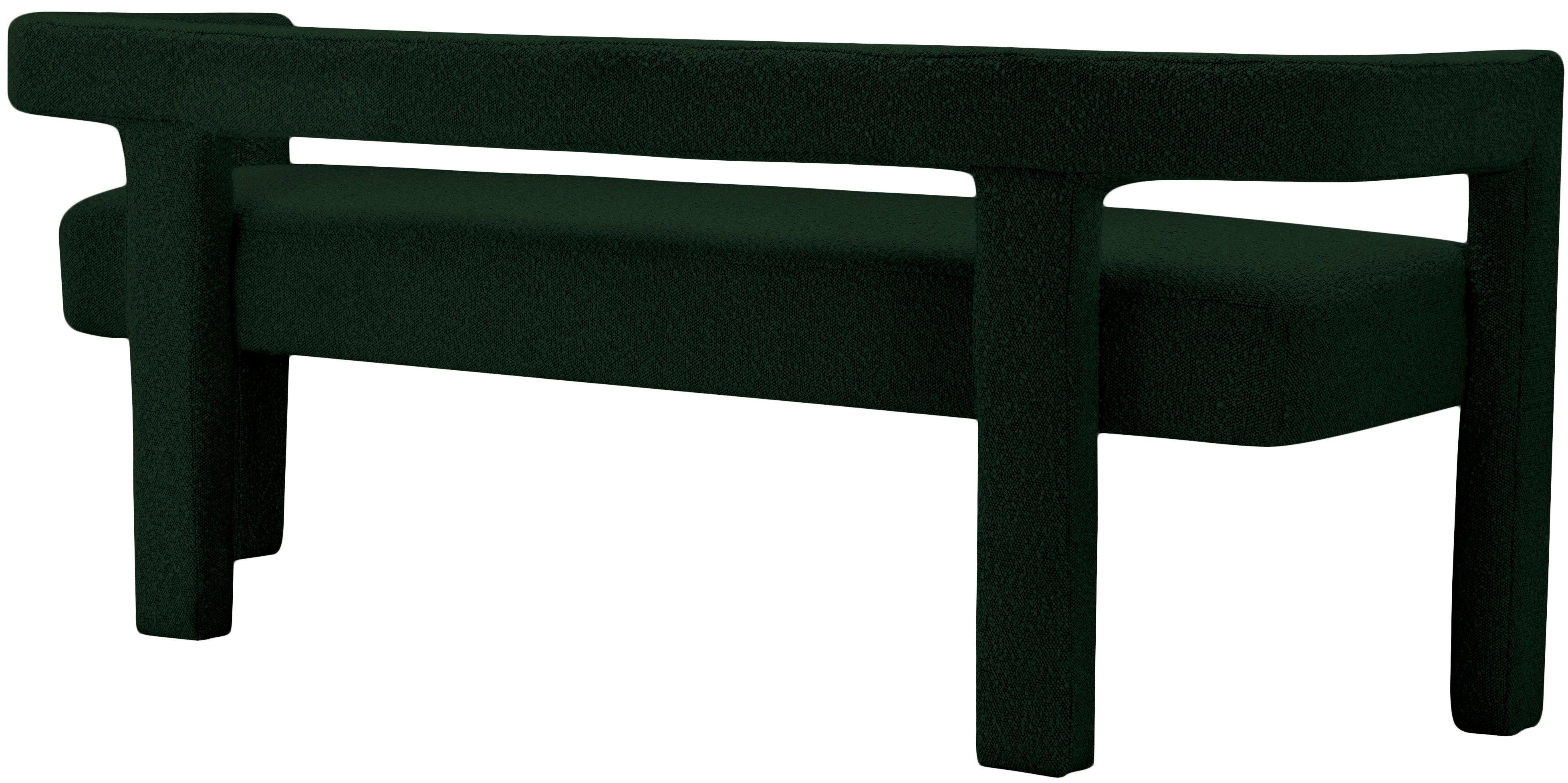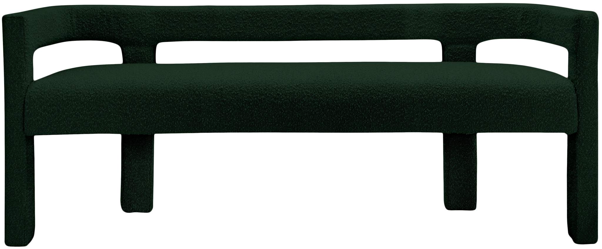 Get comfortable with this Athena bench featuring minimalistic design elements and a simple footprint. Artfully designed, this bench is made for comfort with a rounded footprint that hugs your back while you sit and relax with friends. The bench is covered top to bottom in rich green boucle fabric, so it's super soft to the touch and elegant to the eye.